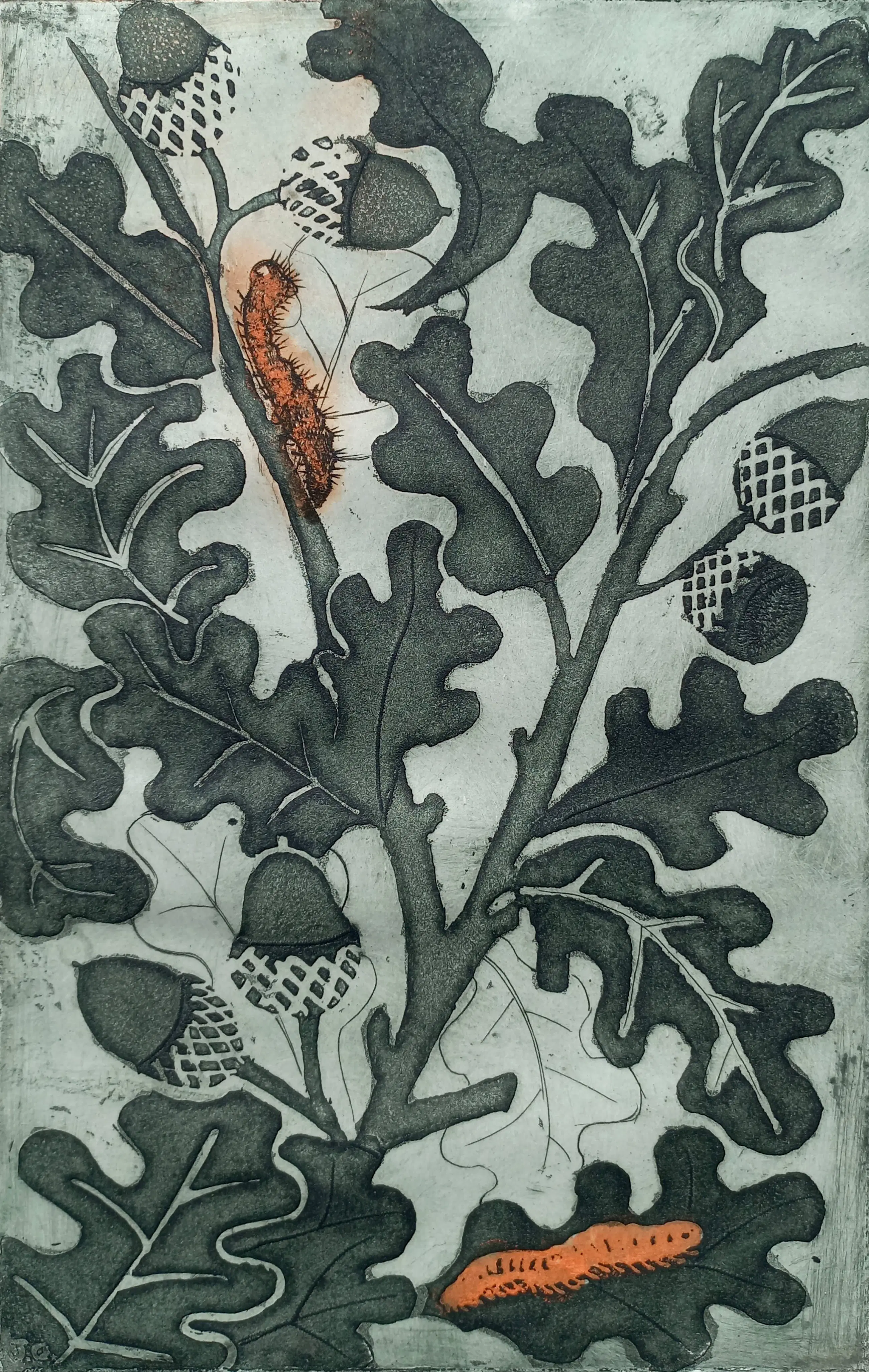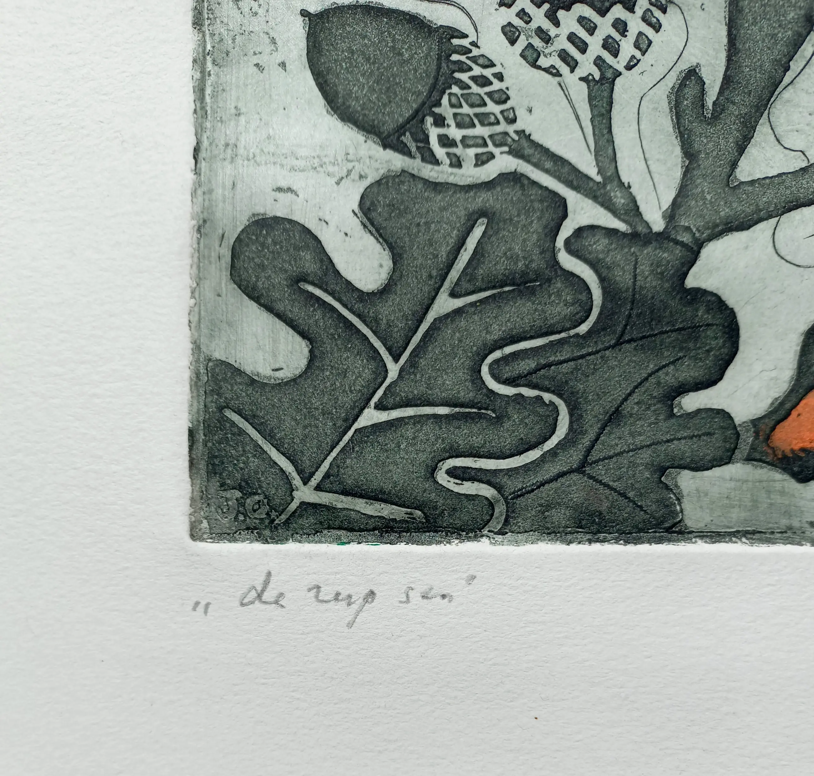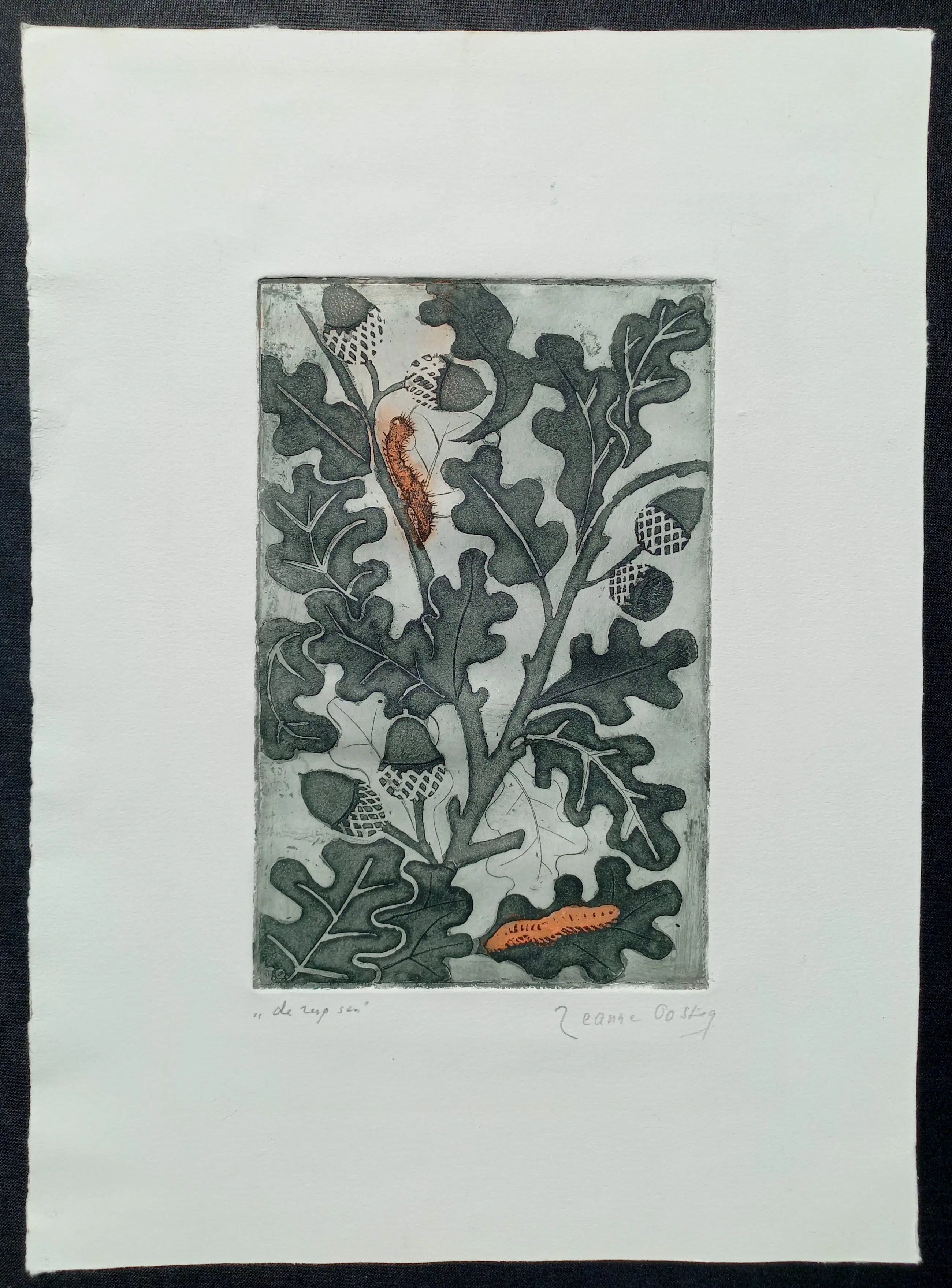 Prachtige werkje van Jeanne Oosting. Ets met aquatint in drie kleuren op geschept papier, met potlood gesigneerd en getiteld. In zeer goede conditie.
