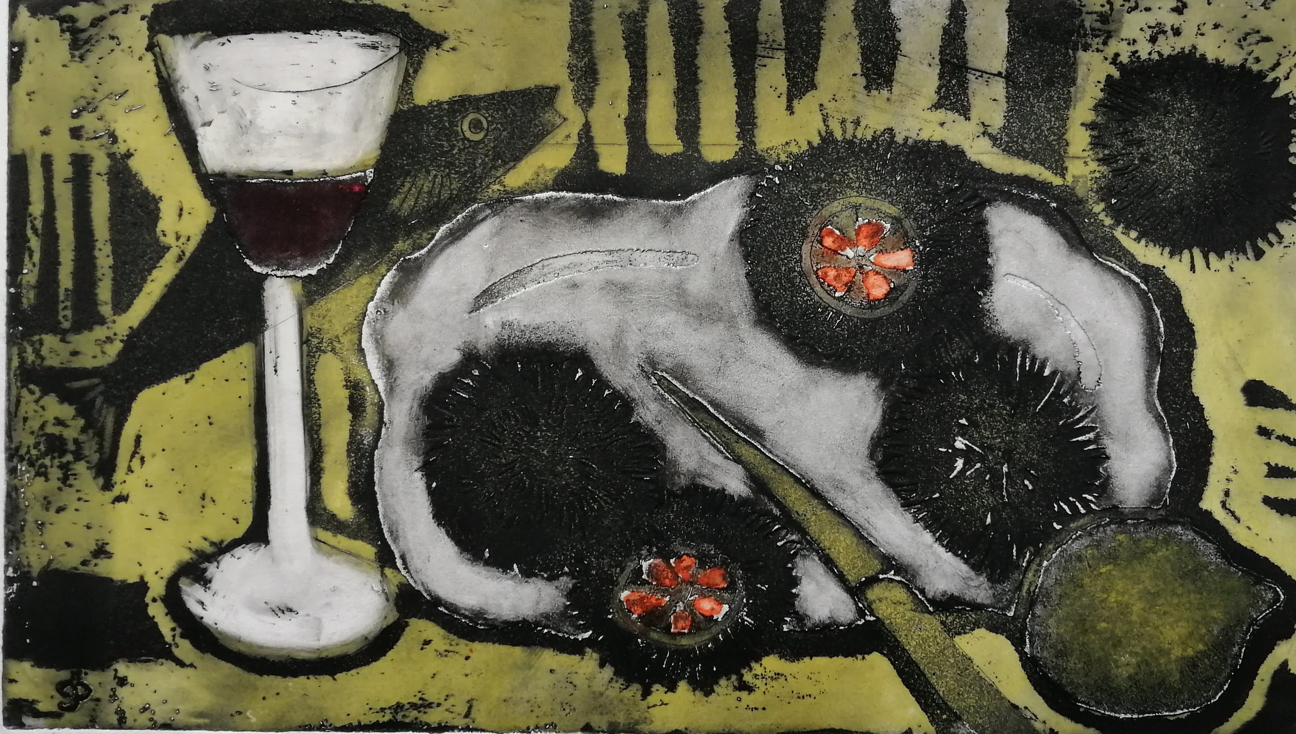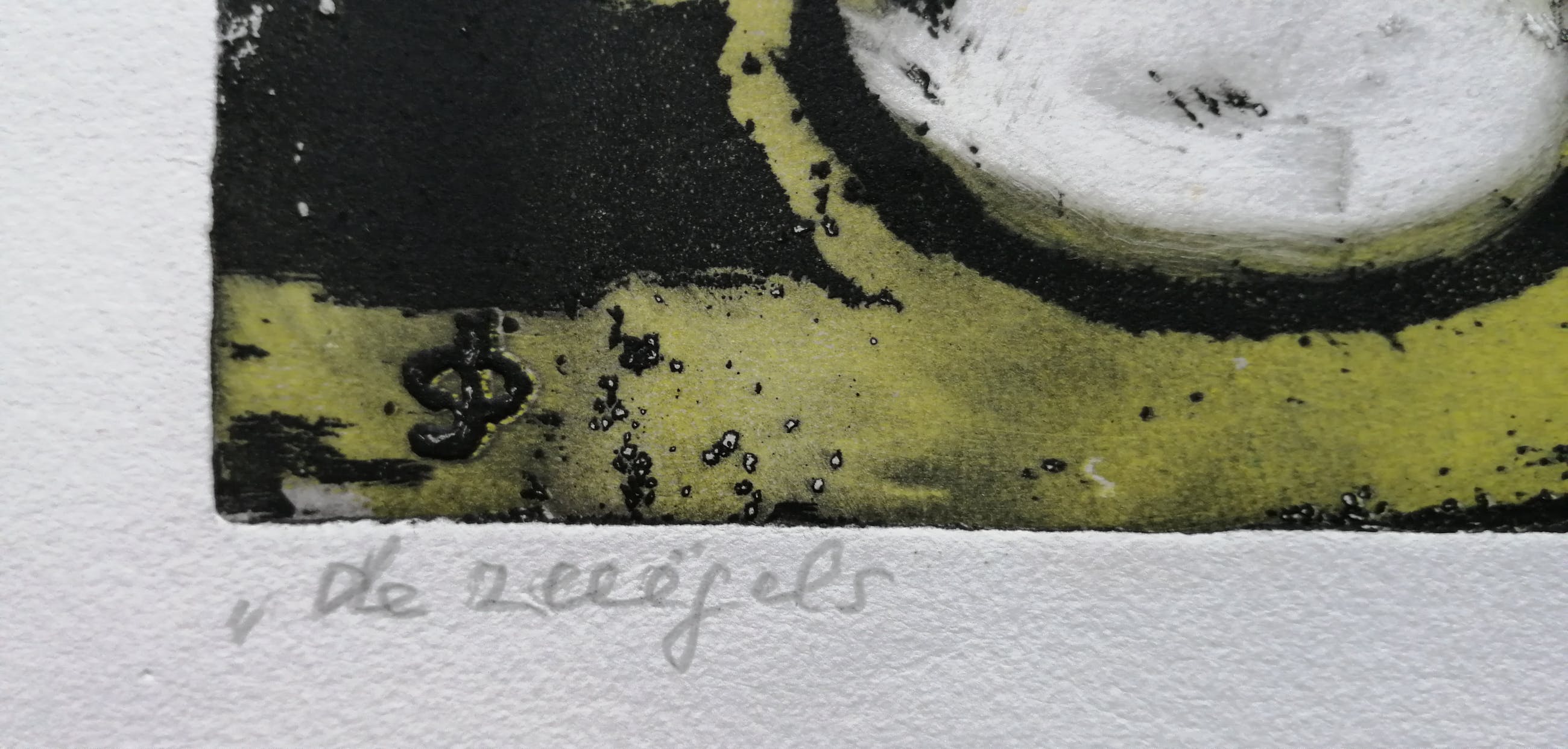 Kleuren ets met reliëfdruk.Potlood gesigneerd rechtsonder.Getiteld linksonder.Beeldmaat 25x44 cm.Bladmaat 43x59 cm.Losbladig.