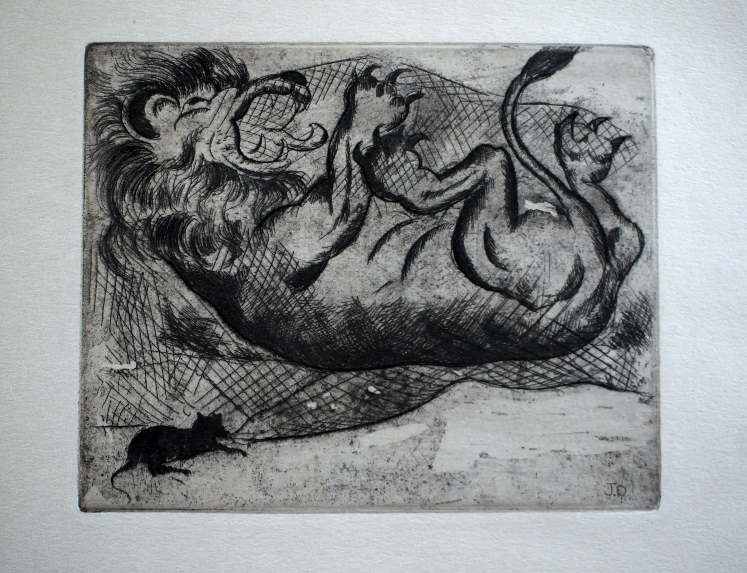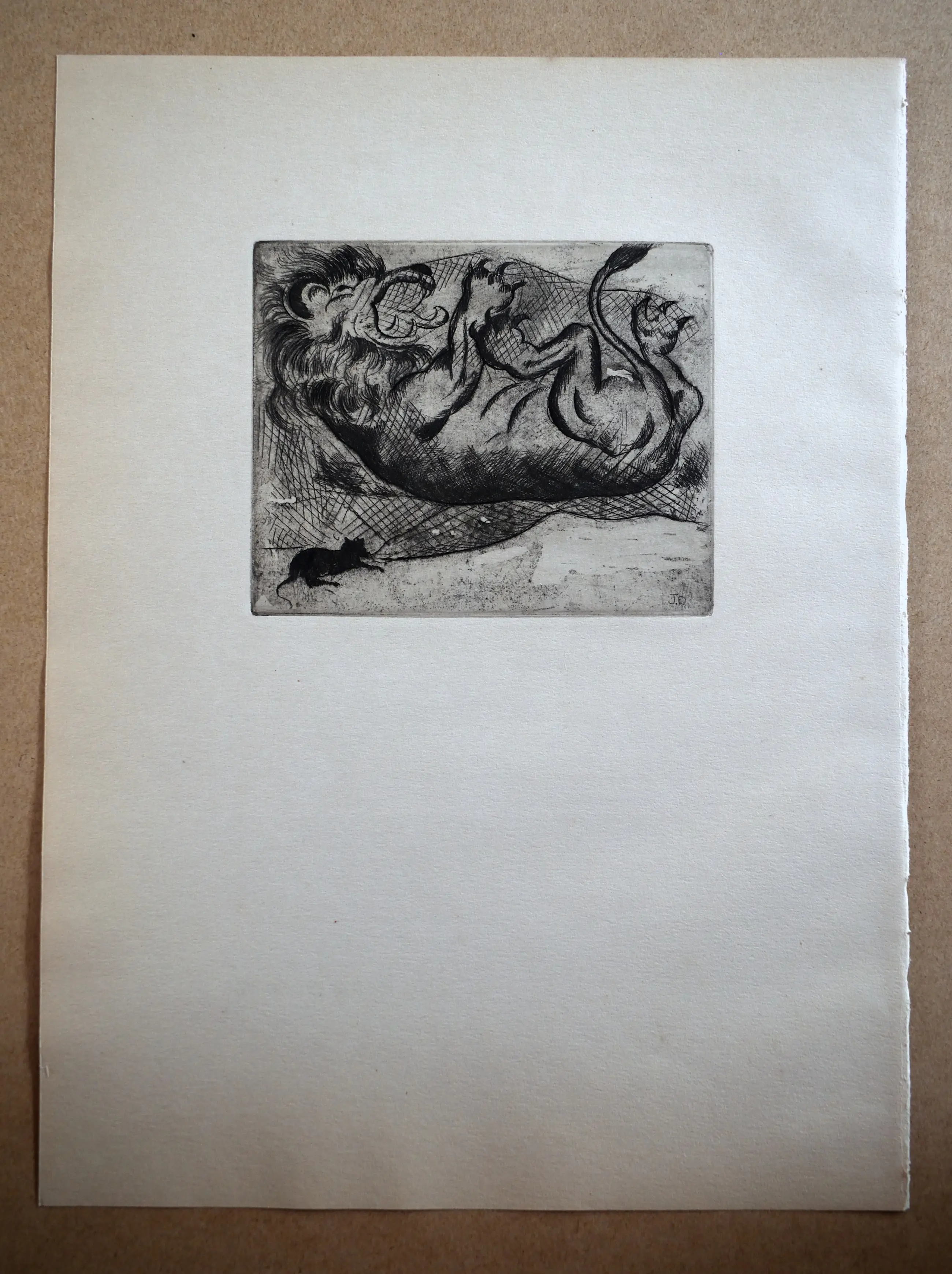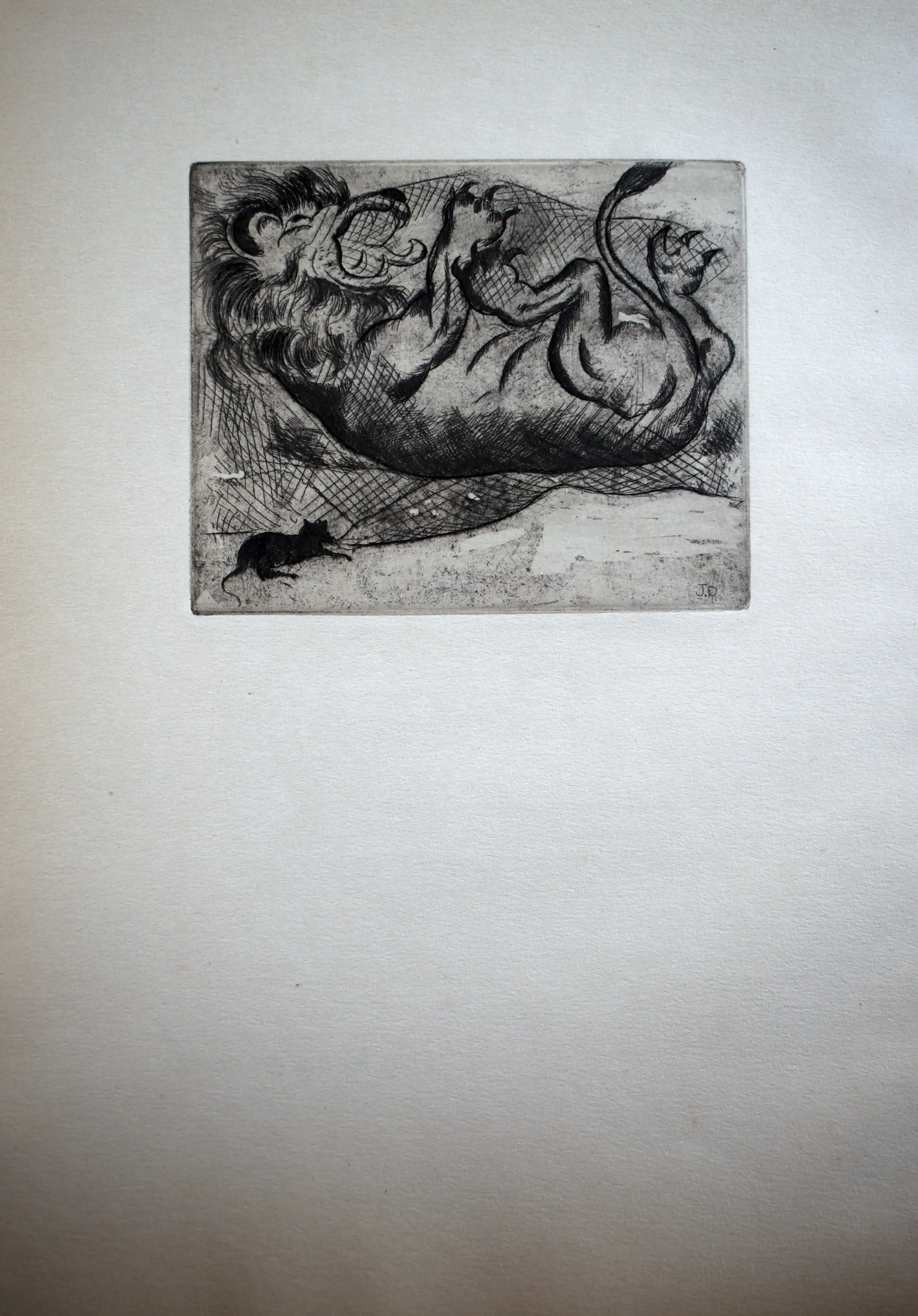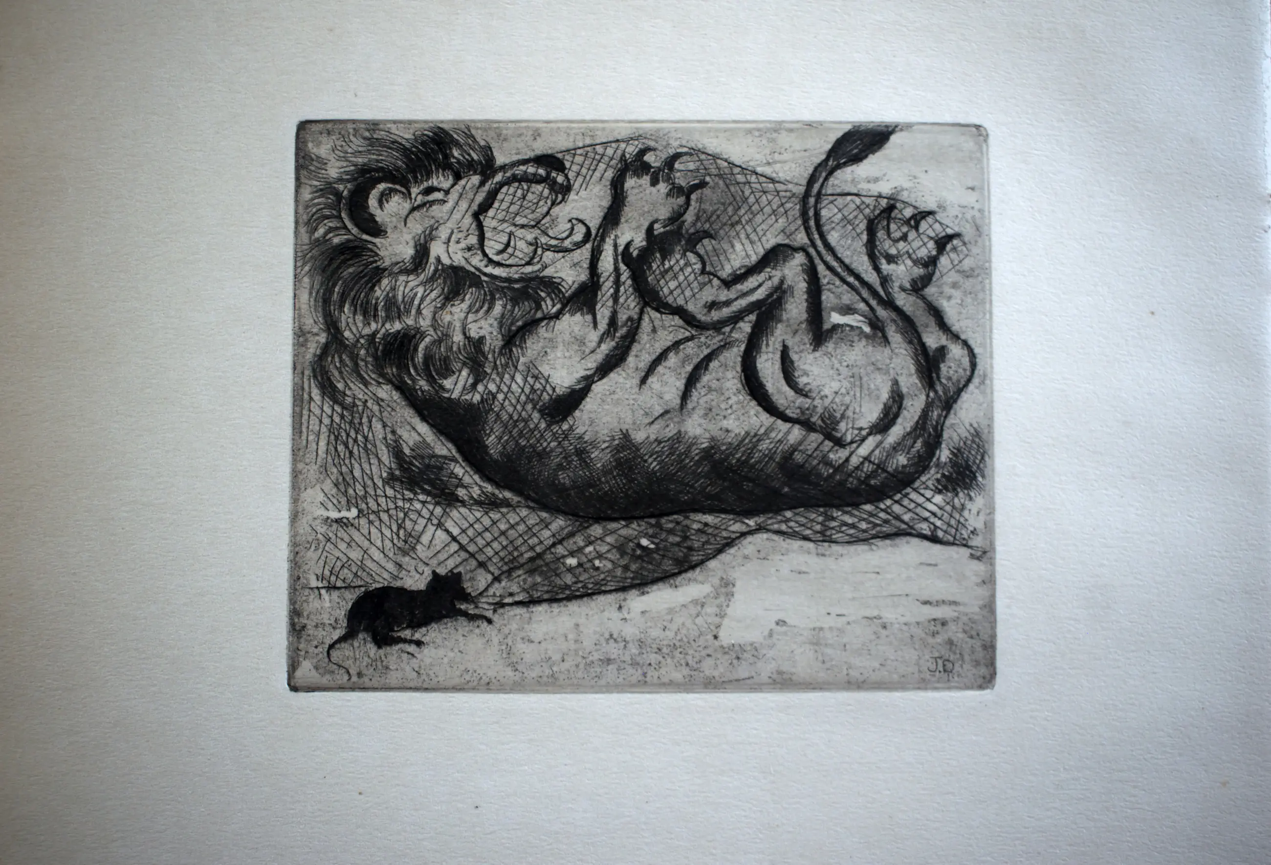 Mooi weergegeven ets van de fabel van La Fontaine : De leeuw en de rat
