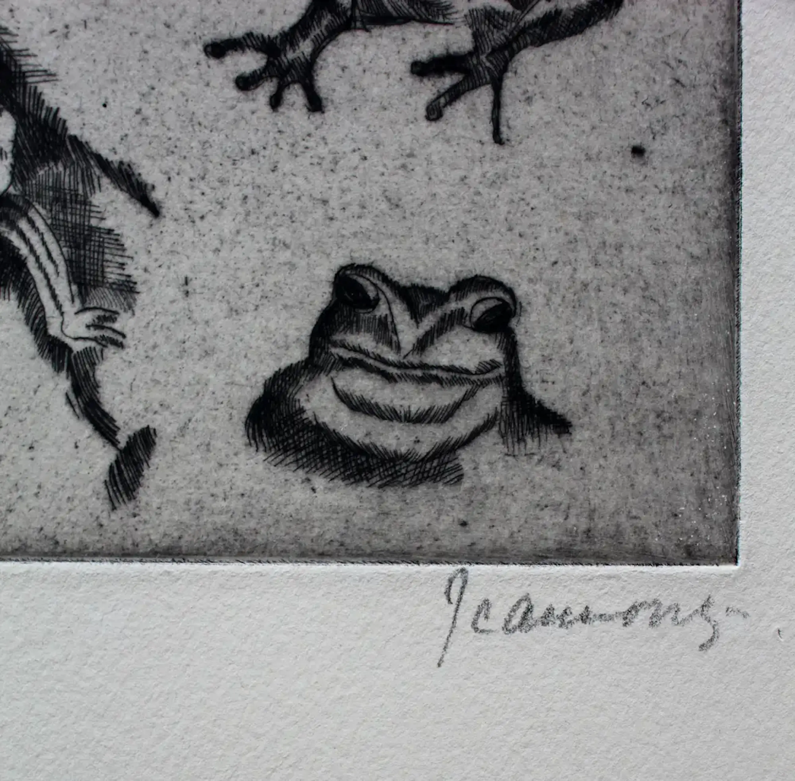 Ets van Jeanne Bieruma Oosting. Jaar: 1936. Voorstelling van kikker en schildpad. Afmetingen op papier: H19,3 x b26,9 cm. Afmetingen voorstelling: H10 x b15cm. Het werk is rechts onderaan, gesigneerd door de kunstenaar. De authenticiteit van het, aangeboden, werk wordt volledig gegarandeerd. Een certificaat van echtheid kan, op aanvraag, worden gemaild.