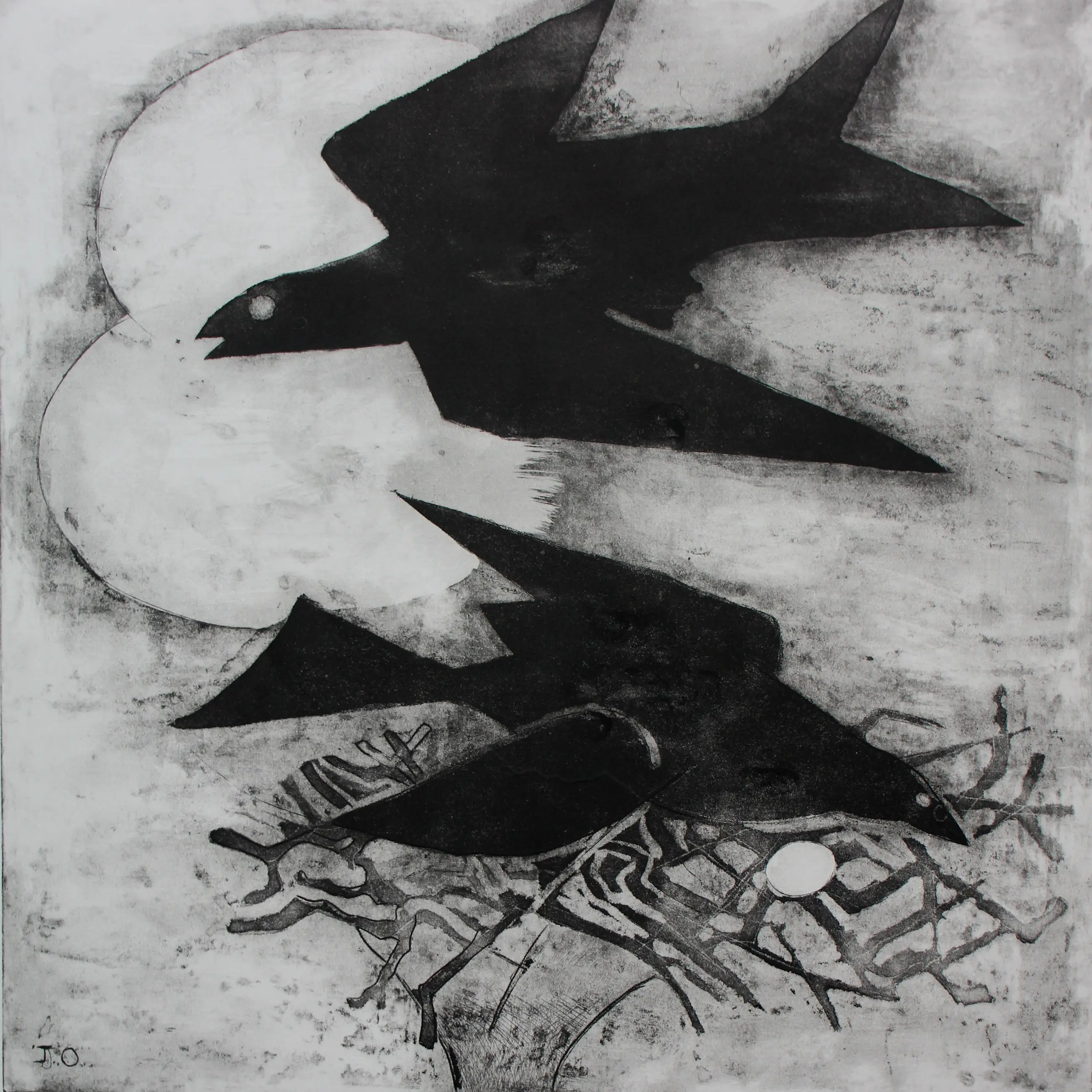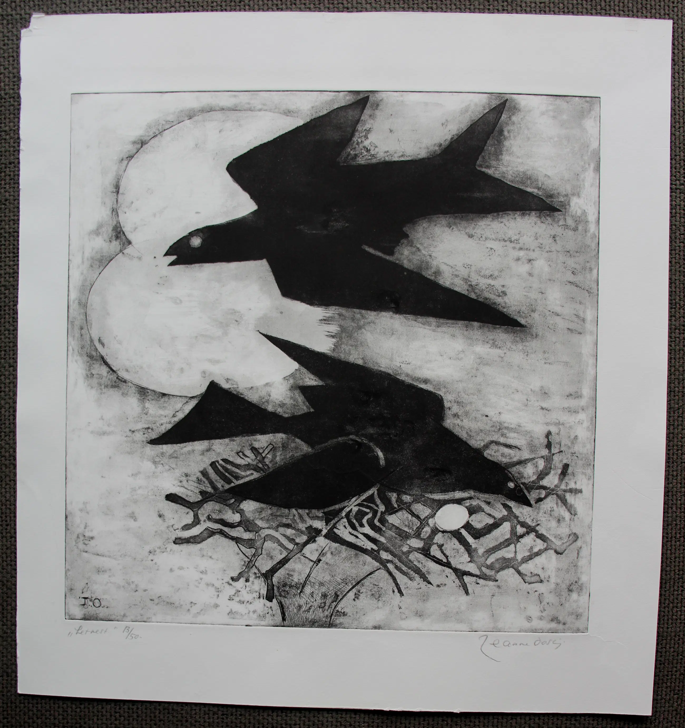 Ets/aquatint van Jeanne Bieruma Oosting. Titel: "het nest". Oplage: 13/50. Afmetingen blad: H51.5 x b48.5cm. Afmetingen voorstelling H39 x b39cm. Het werk is, rechtsonder gesigneerd en links onderaan gemonogrammeerd, door de kunstenares. De authenticiteit van dit werk wordt volledig gegarandeerd. Een certificaat kan, op aanvraag, worden gemaild.