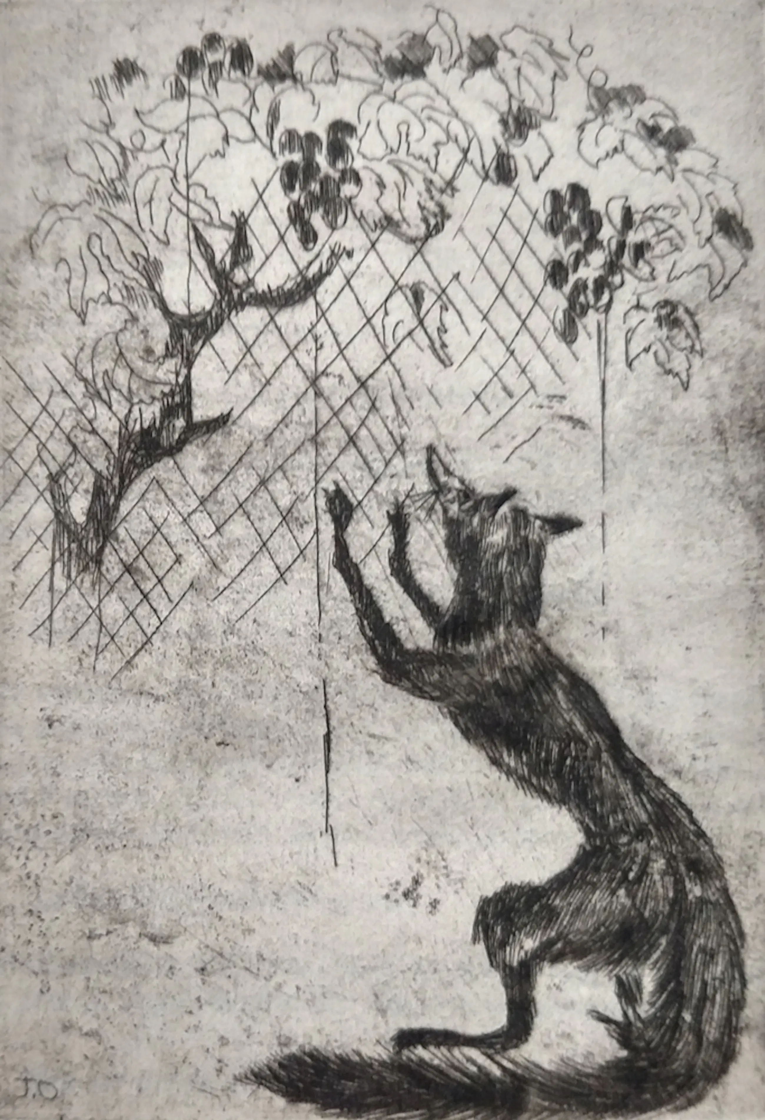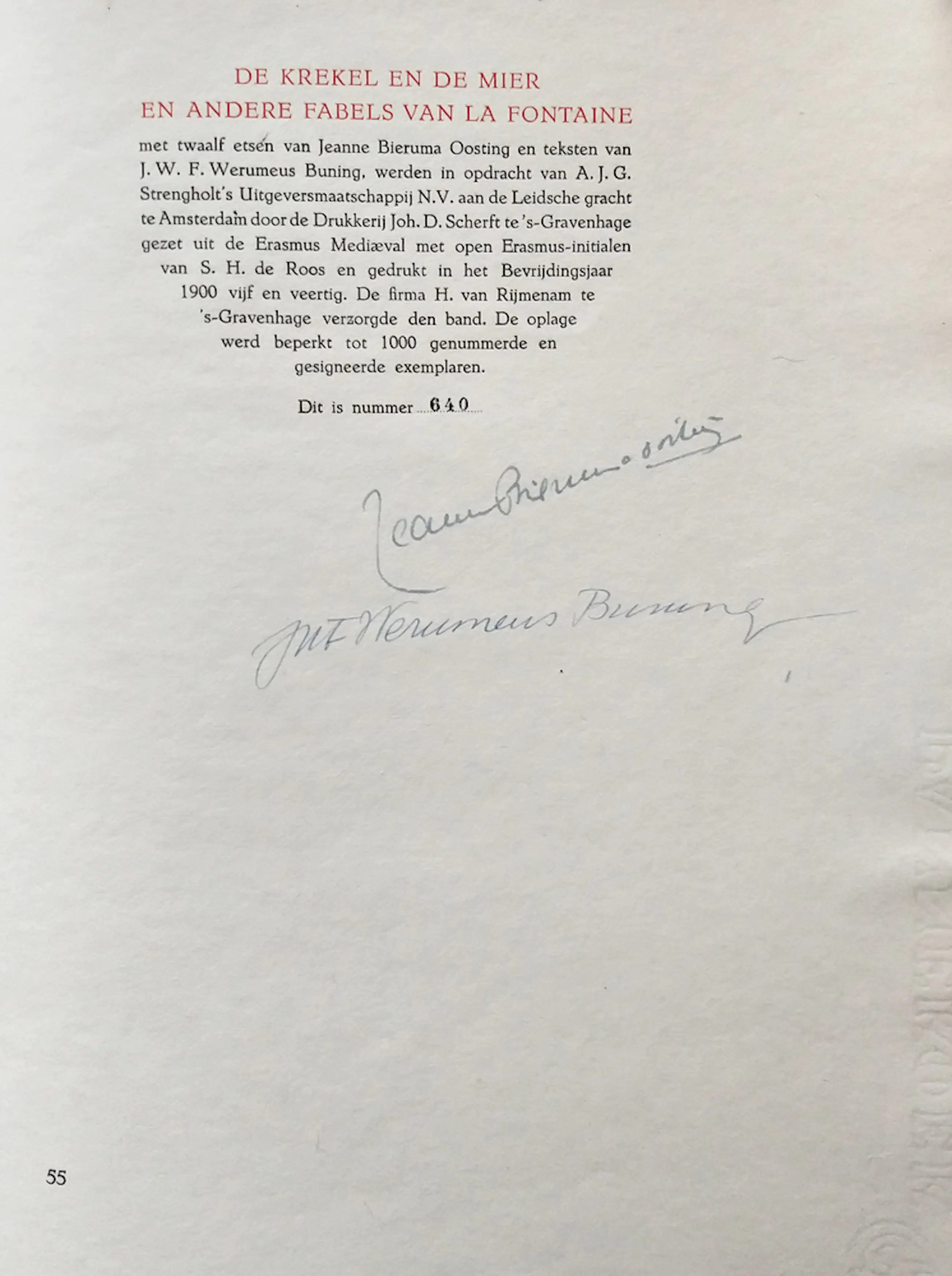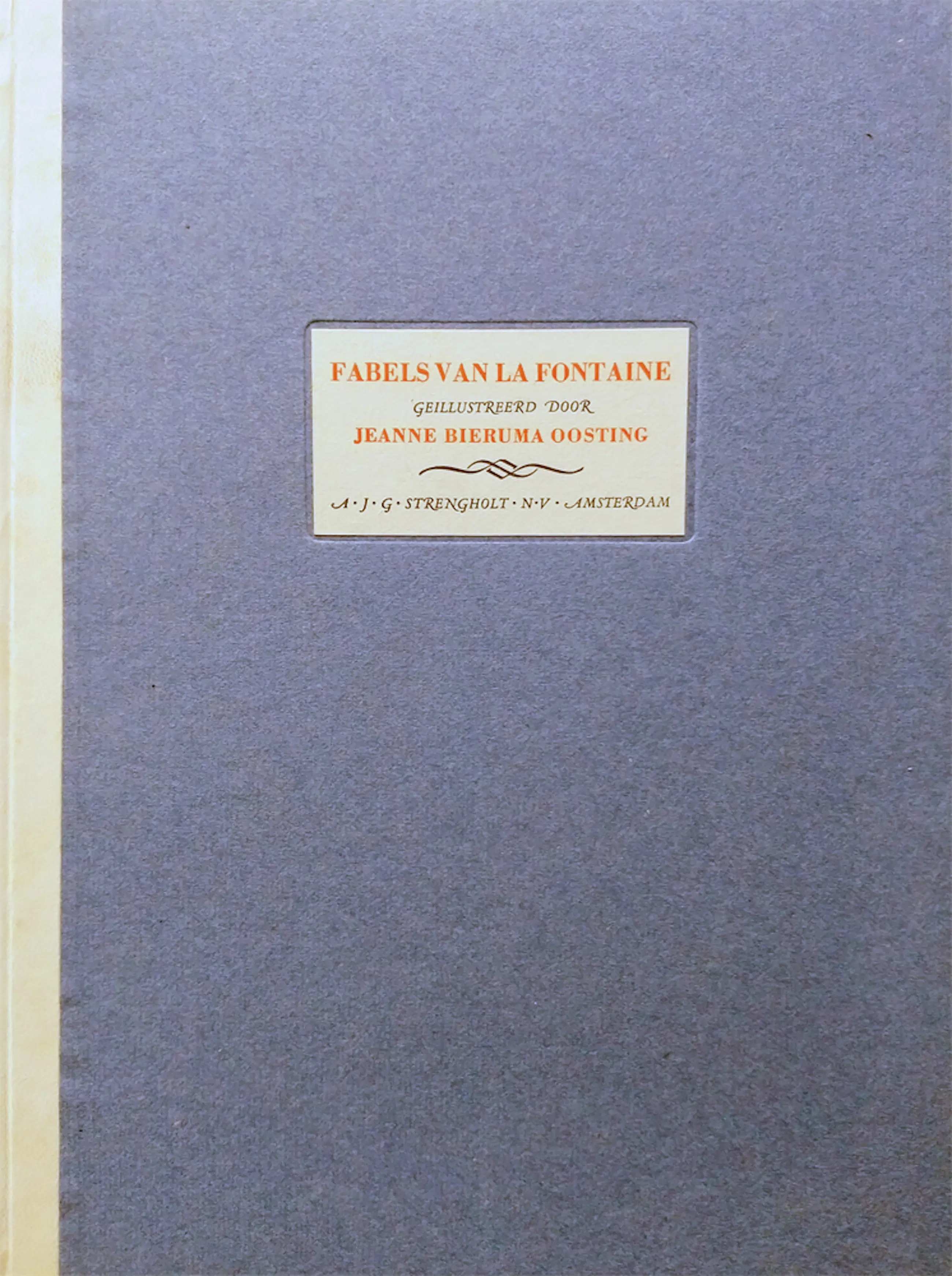 Boek met 12 etsen van de Nederlandse kunstenares Jeanne Bieruma Oosting. Betreft de fabels van La Fontaine. Het boek is uitgegeven in 1945. Genummerd 640 van 1000. Gesigneerd exemplaar.