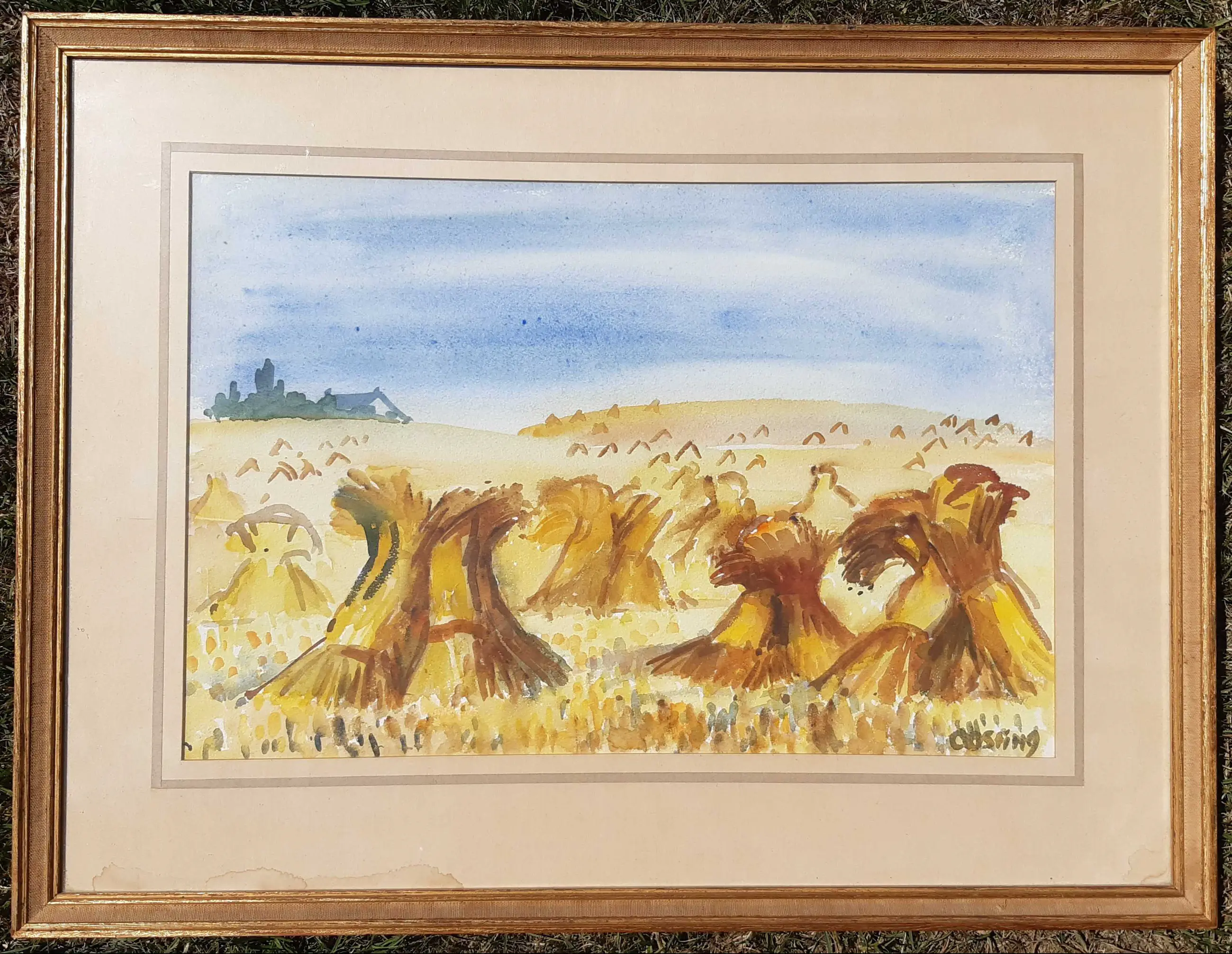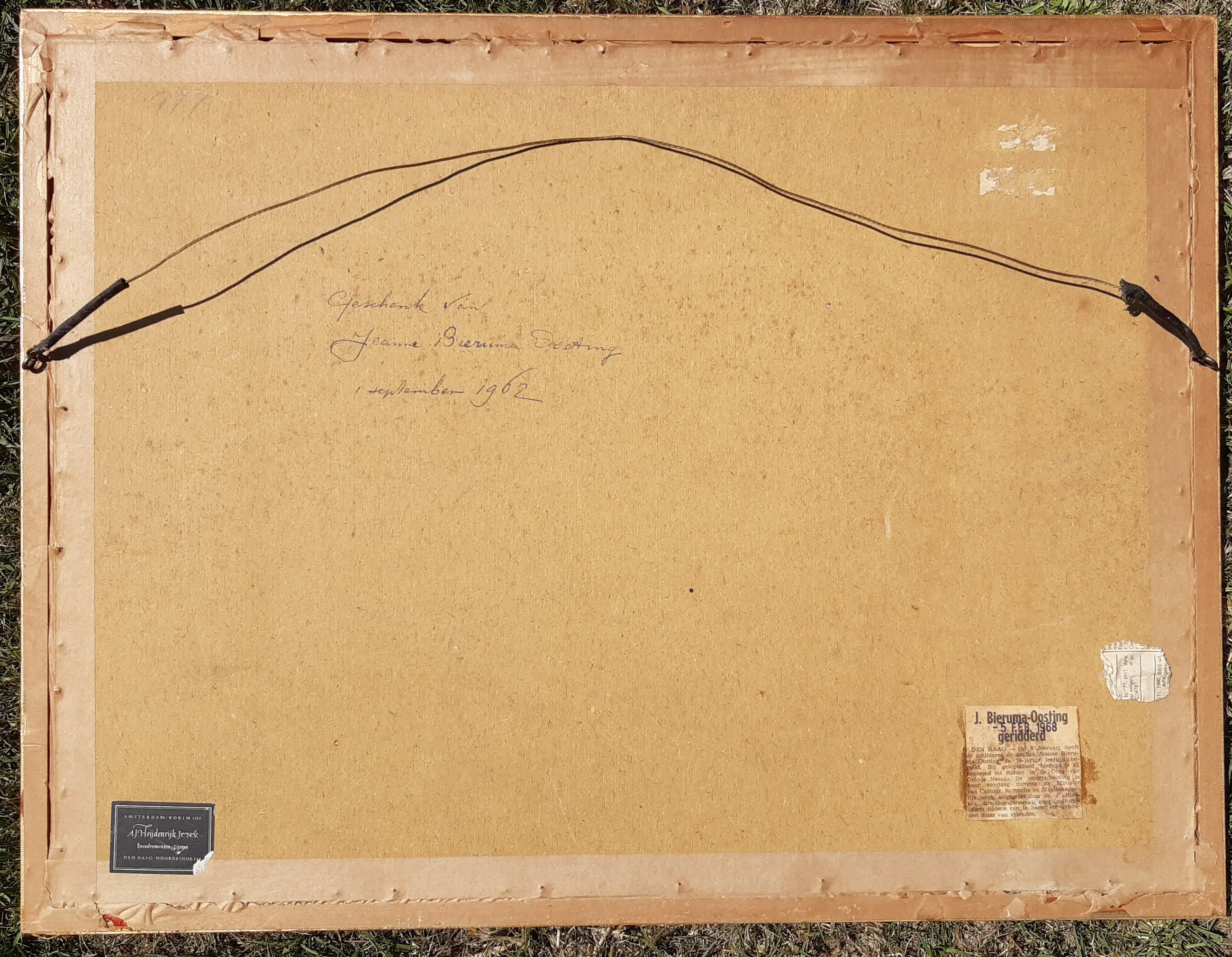 Mooi fris, zonnig werk van hooischelven in het veld. Mooie kleuren in geel en blauw. Aan achterzijde aantekening dat in 1962 door Jeanne Bieruma Oosting geschonken is. Met krantenartikel over Jeanne Bieruma Oosting geridderd in 1968. Mooie lijst van A.J.Heijdenrijk.