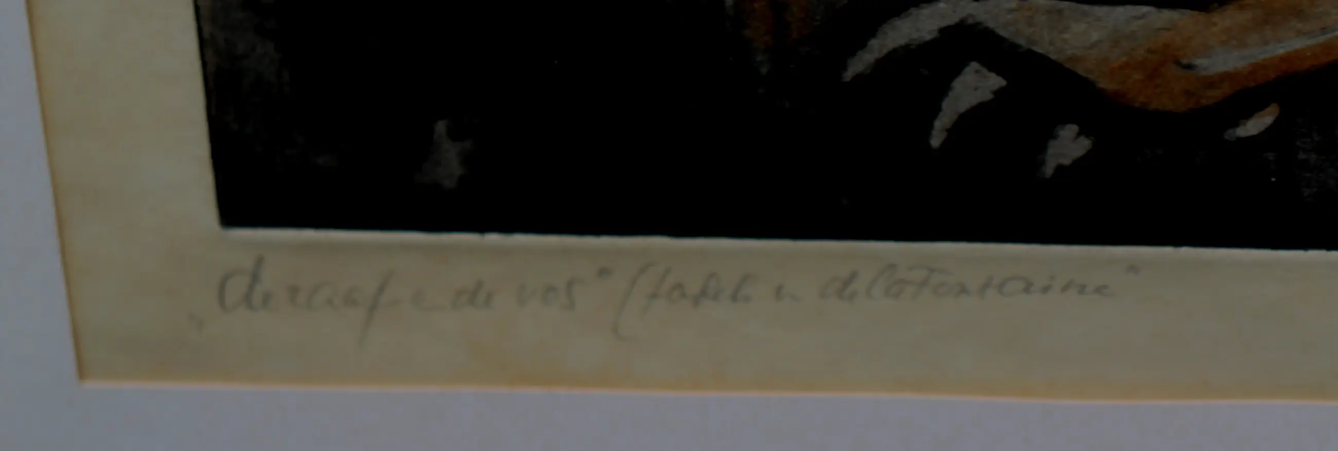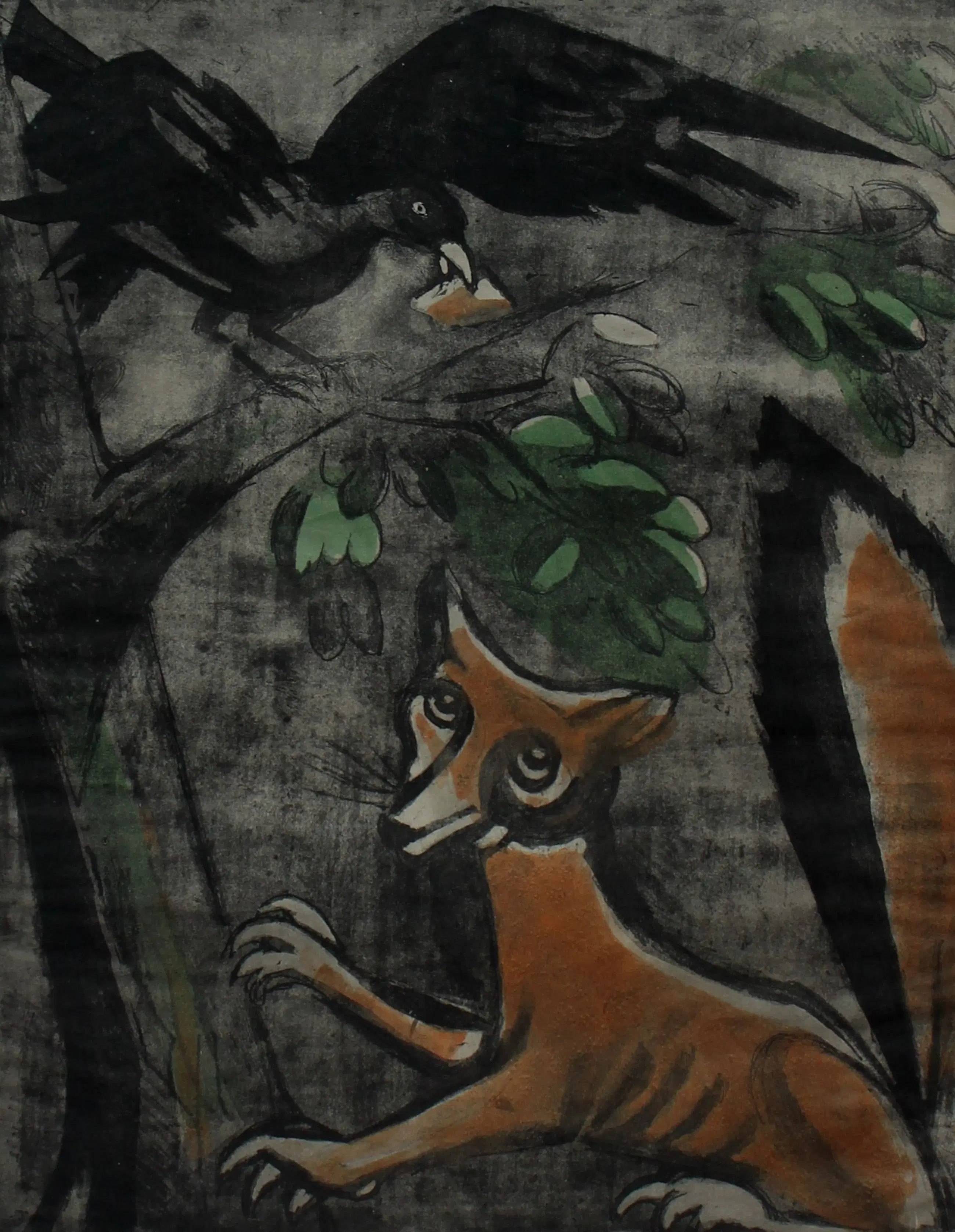 Ingelijste ets/aquatint van Jeanne Bieruma Oosting. Titel: 'De raaf en de vos(Fables de la Fontaine)' Afmetingen incl. lijst: H70.5 x B50.5cm. Afmetingen voorstelling: H45 x b36cm.