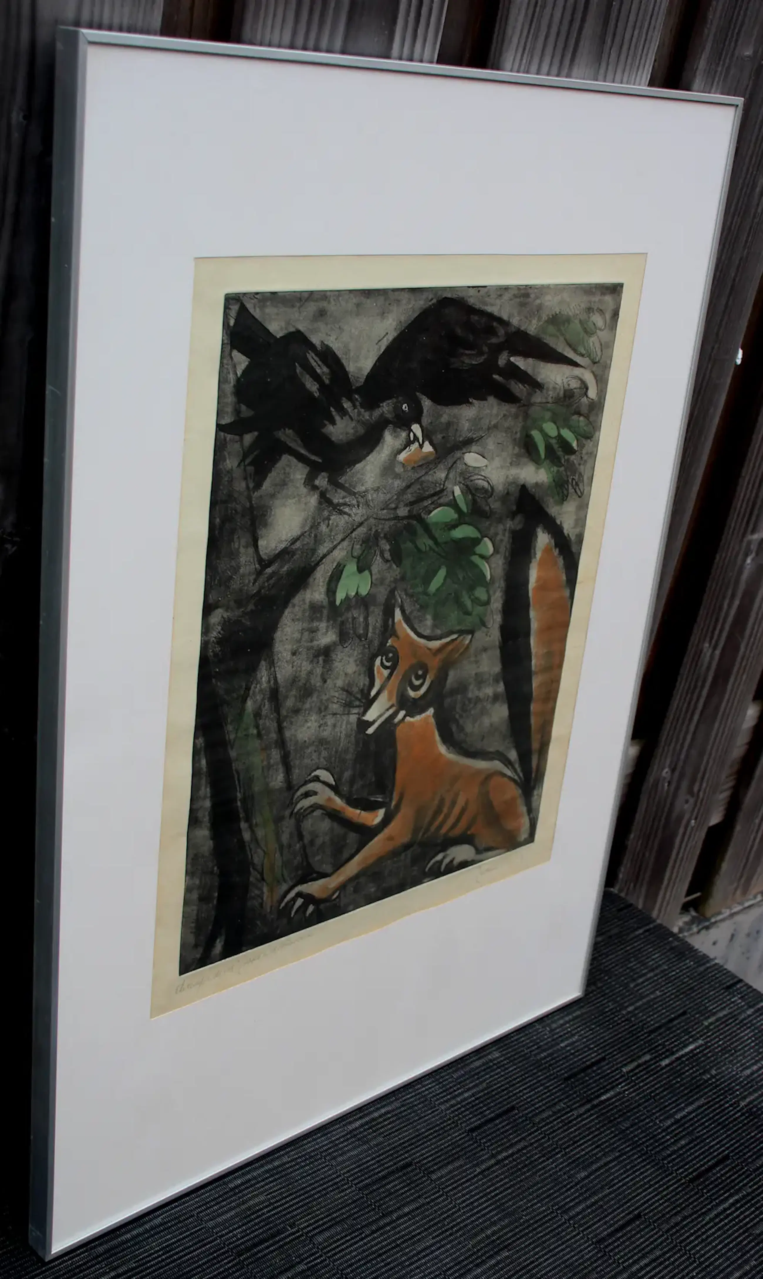 Ingelijste ets/aquatint van Jeanne Bieruma Oosting. Titel: 'De raaf en de vos(Fables de la Fontaine)' Afmetingen incl. lijst: H70.5 x B50.5cm. Afmetingen voorstelling: H45 x b36cm.