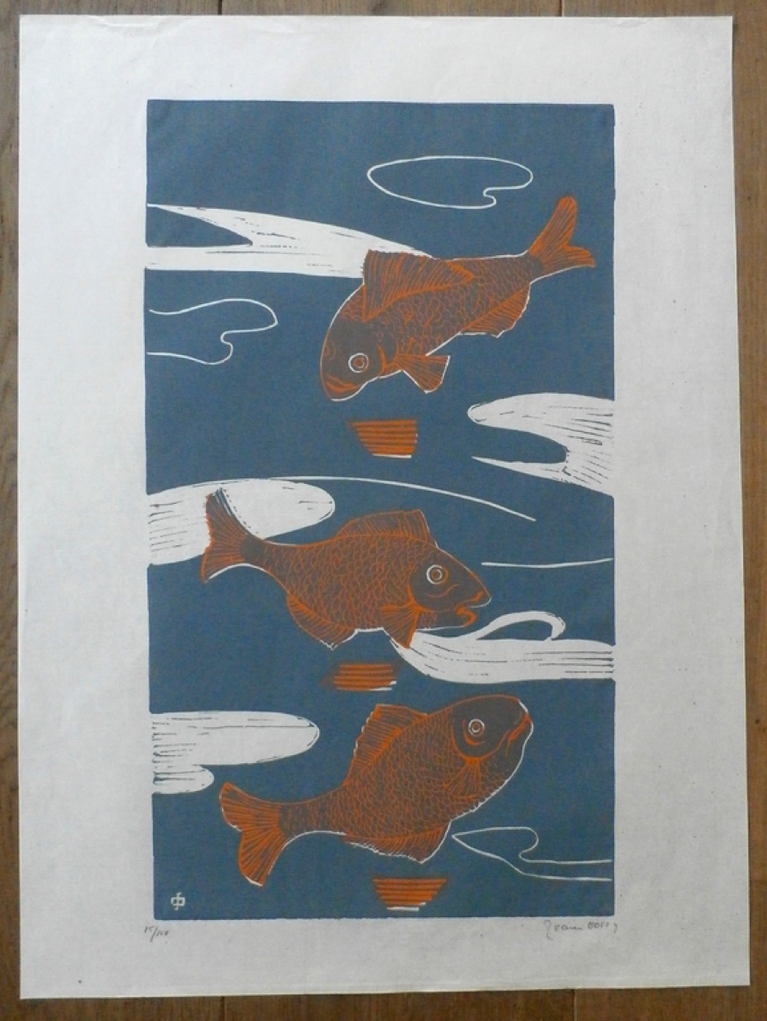 Houtsnede van Jeanne Bieruma - Oosting op rijstpapier. Titel: Goudvissen. Nummer: 15/150. Afmetingen werk: H61 x b46 cm. Afmetingen voorstelling: H51 x b29 cm. Conditie: in goede staat. Linksboven in het witte vlak zitten wat kreukels die bij inlijsting onder de passe-partout vallen.