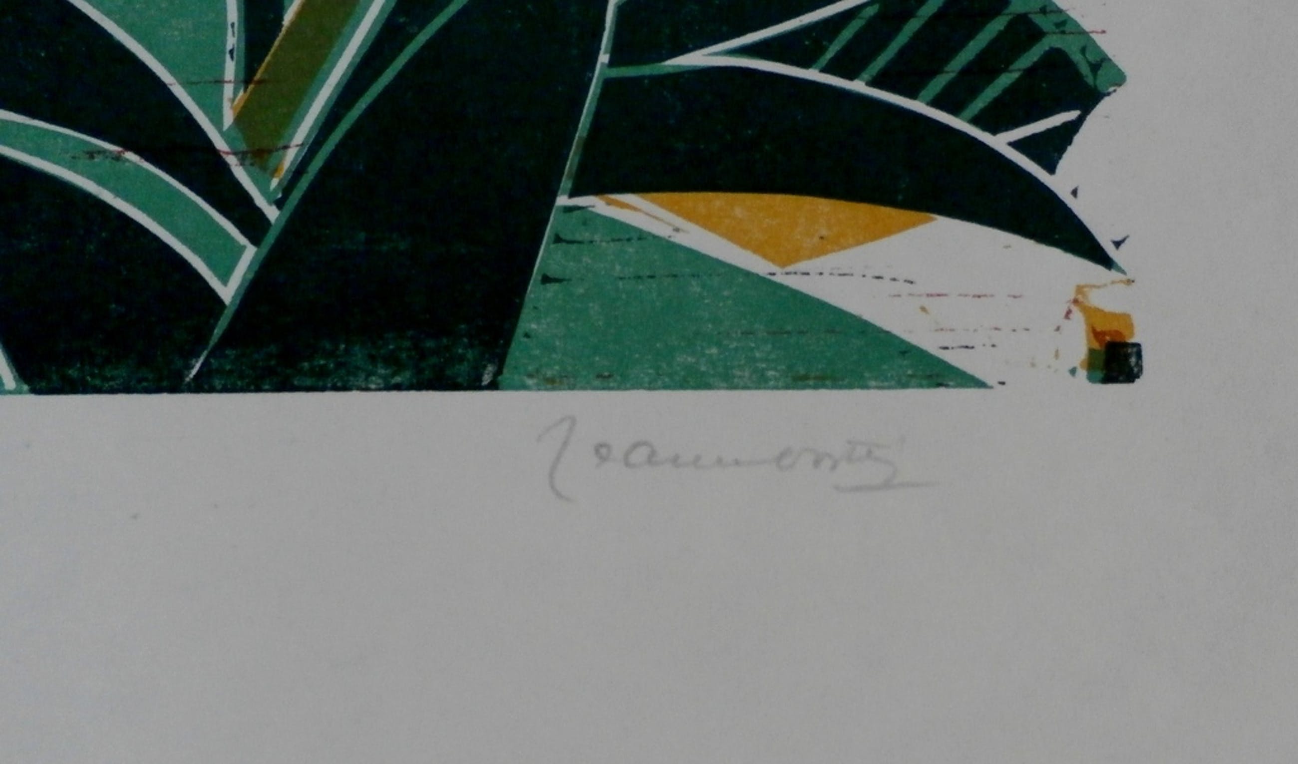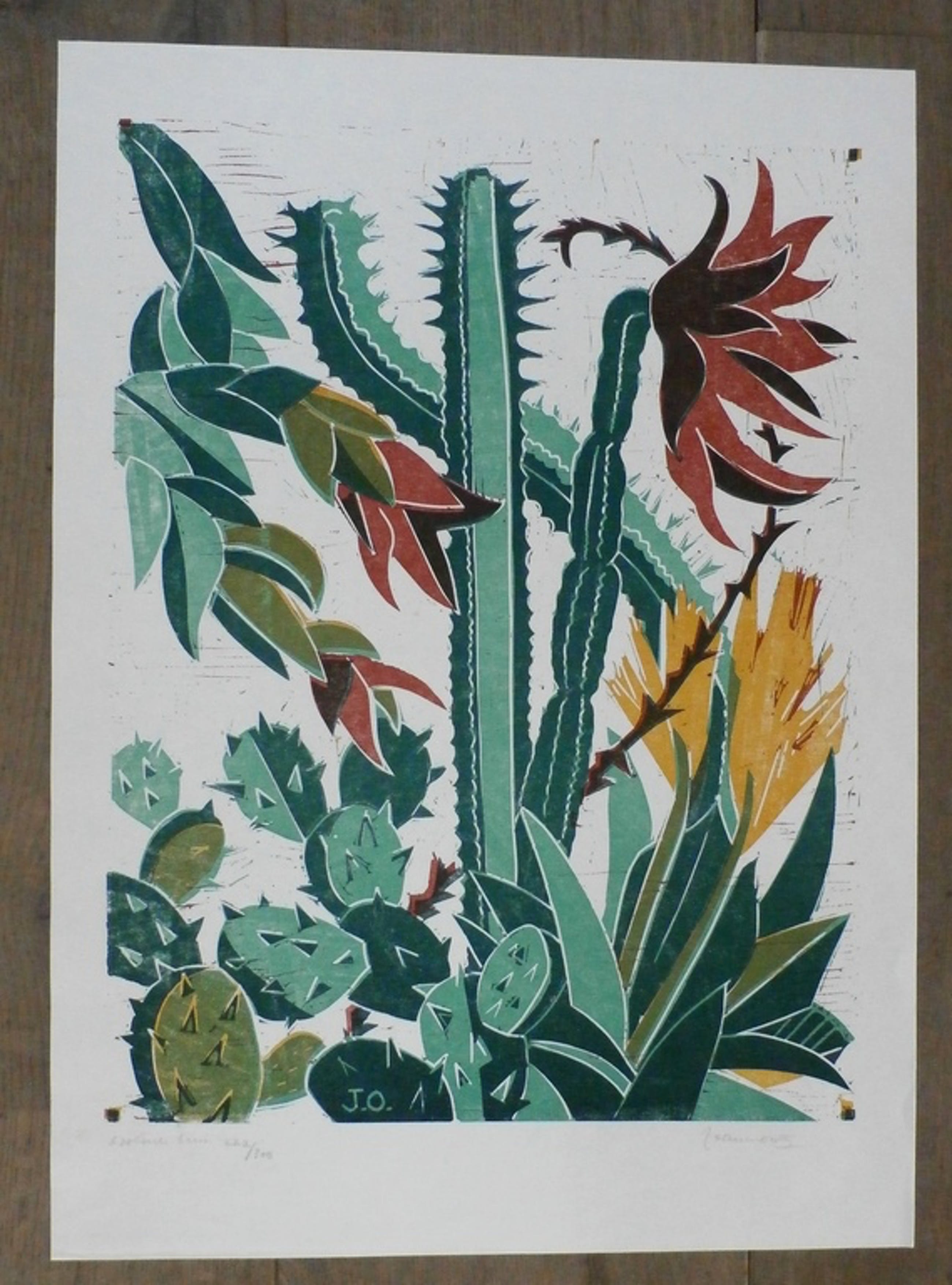 Kleurrijke linosnede vanJeanne Bieruma Oosting. Titel: exotische tuin. De linosnede is rechtsonder, met potlood, gesigneerd door de kunstenaar en in de druknlinksonder (J.O.). Nummer: 222/300. Afmetingen blad: h55 x b40 cm.