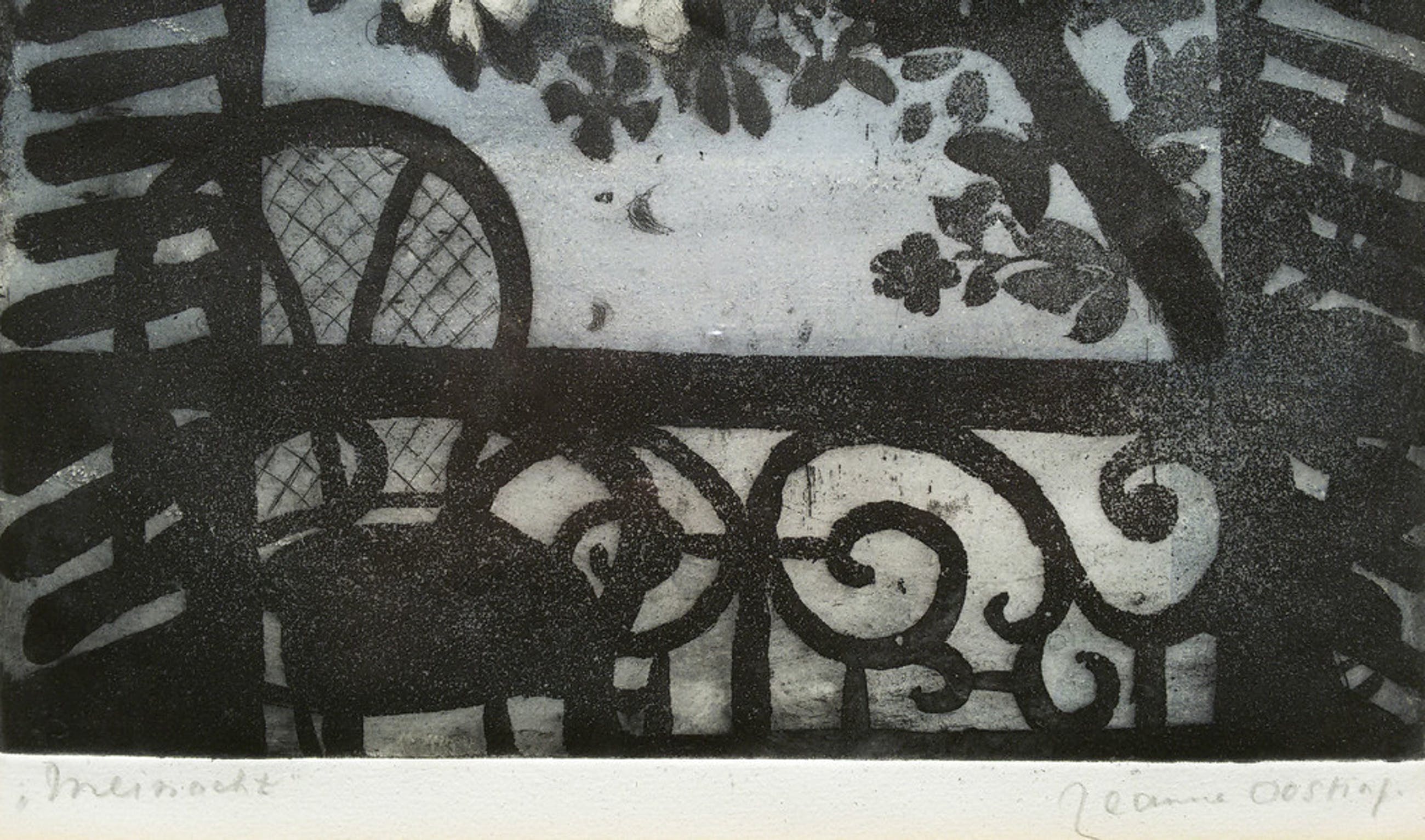 Betoverende ets van Jeanne Oosting. Strak ingelijst in zilverkleurige houten lijst, achter glas en passe-partout. Met potlood gesigneerd en getiteld. In goede conditie.