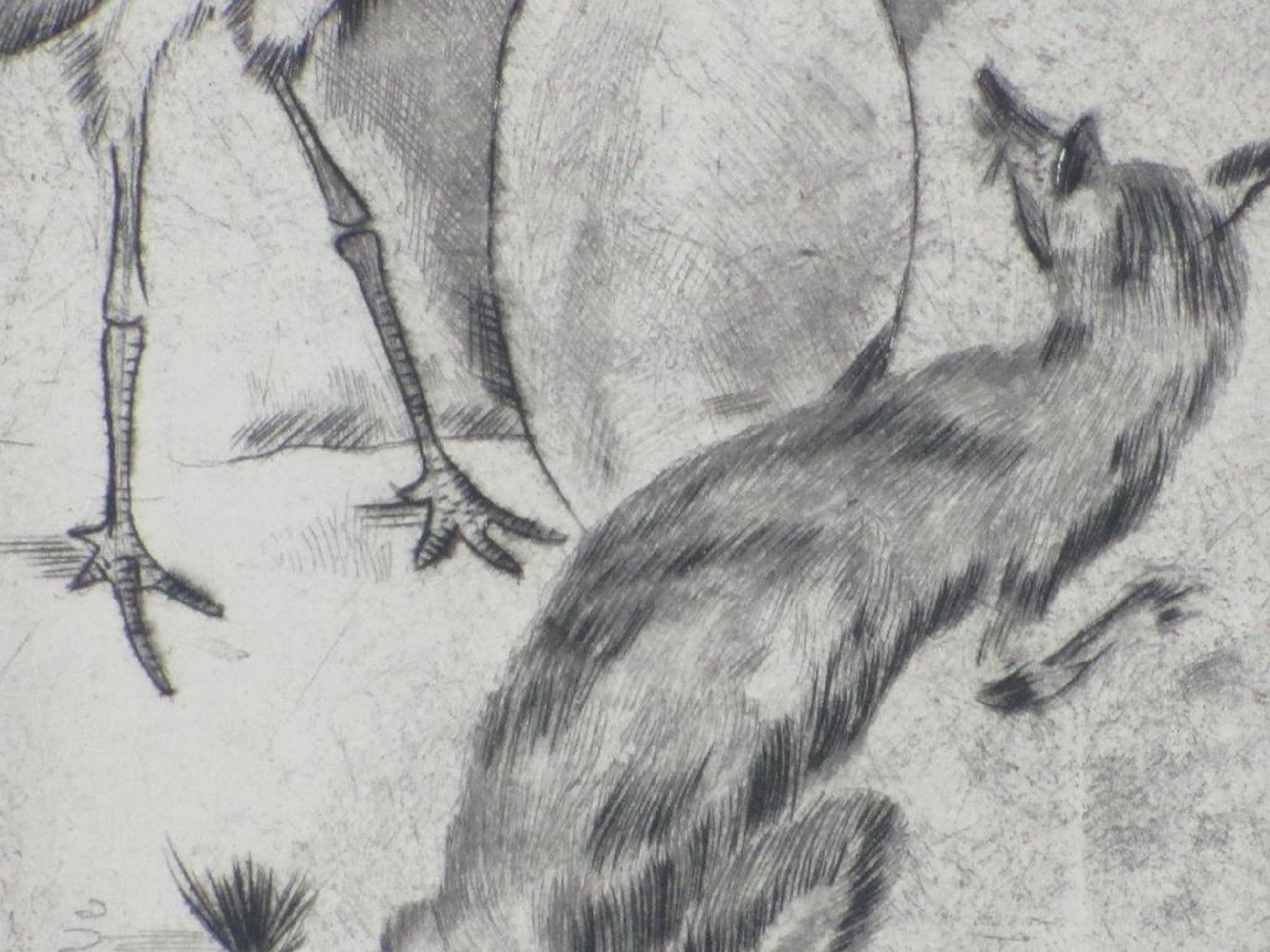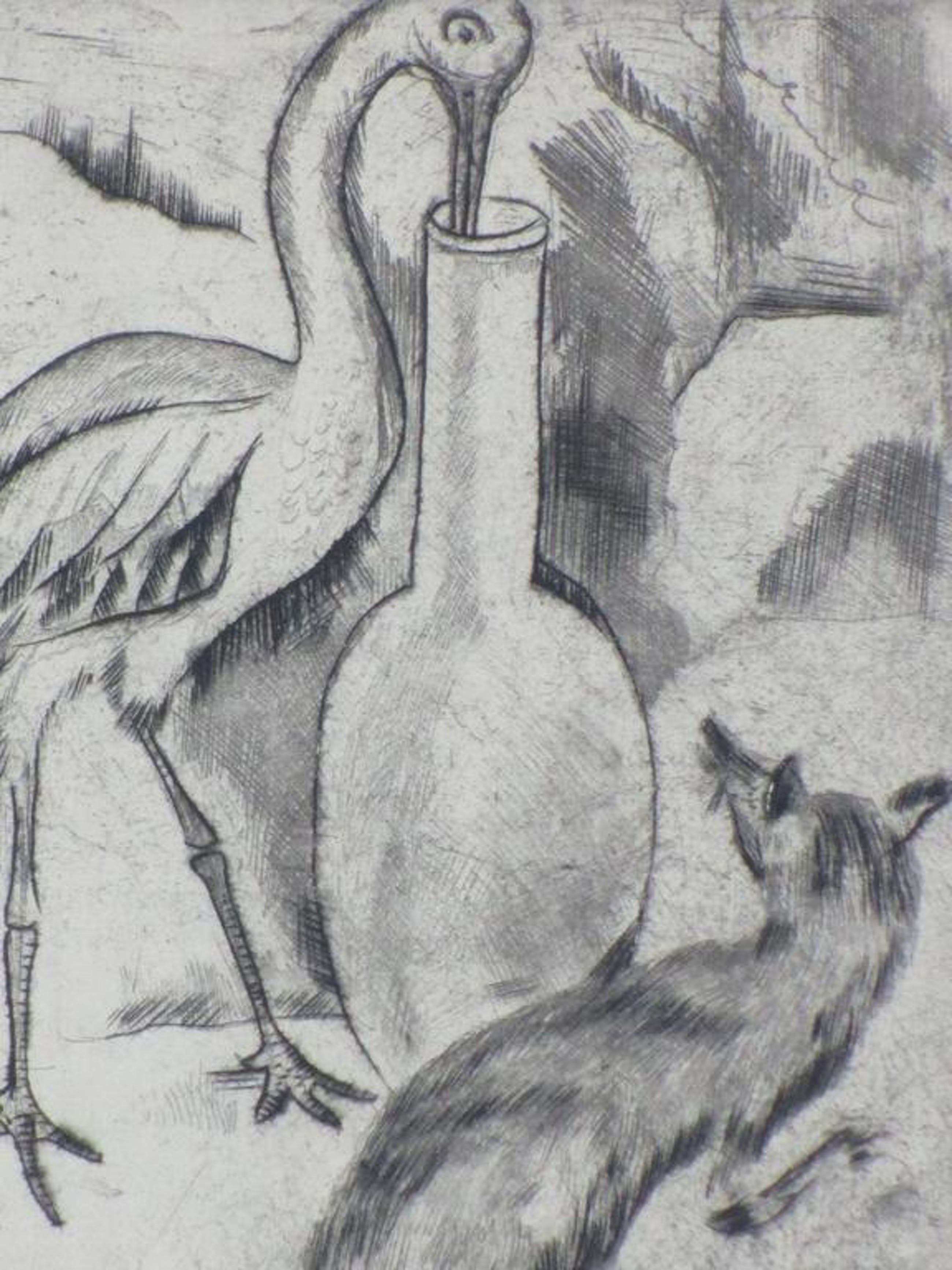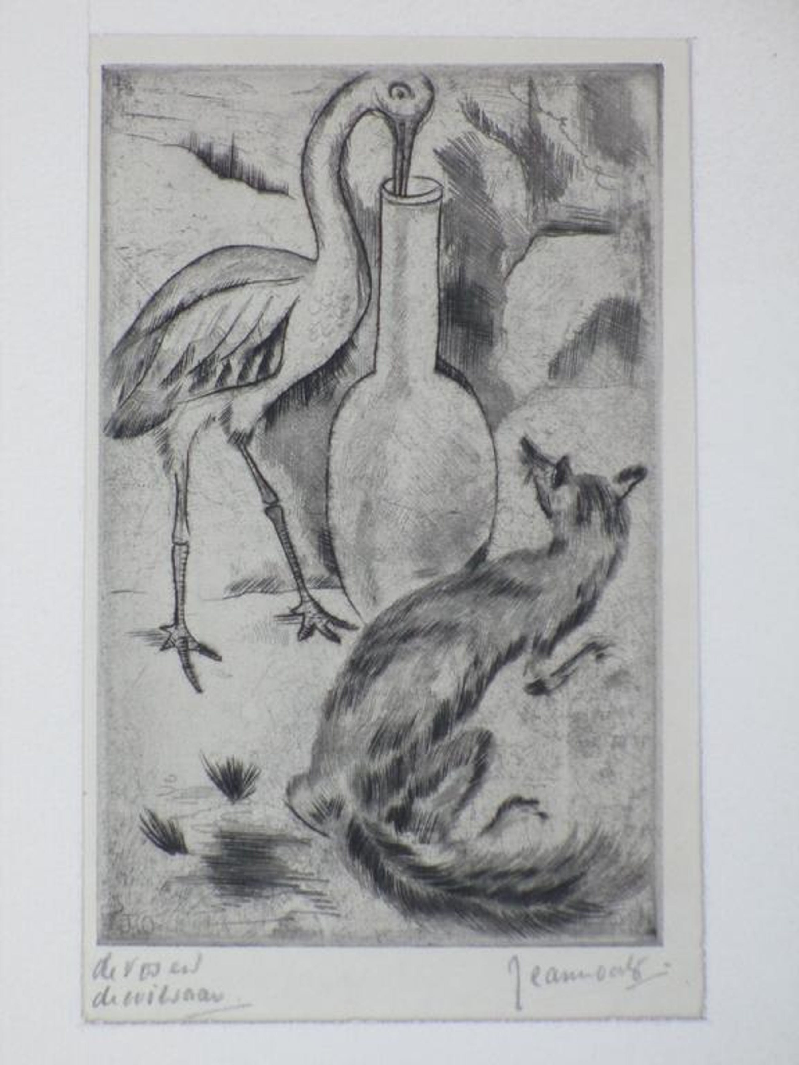 Gesigneerd r.o.'Jeanne Oosting', getiteld l.o. 'de vos en de ooievaar'