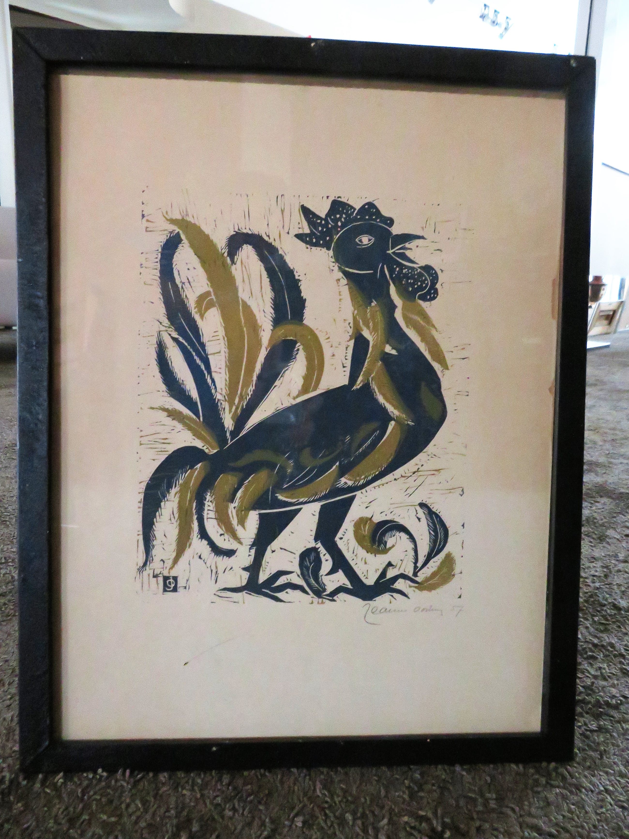 Krachtige haan in zwart en oker van Jeanne Bieruma Oosting in originele lijst.