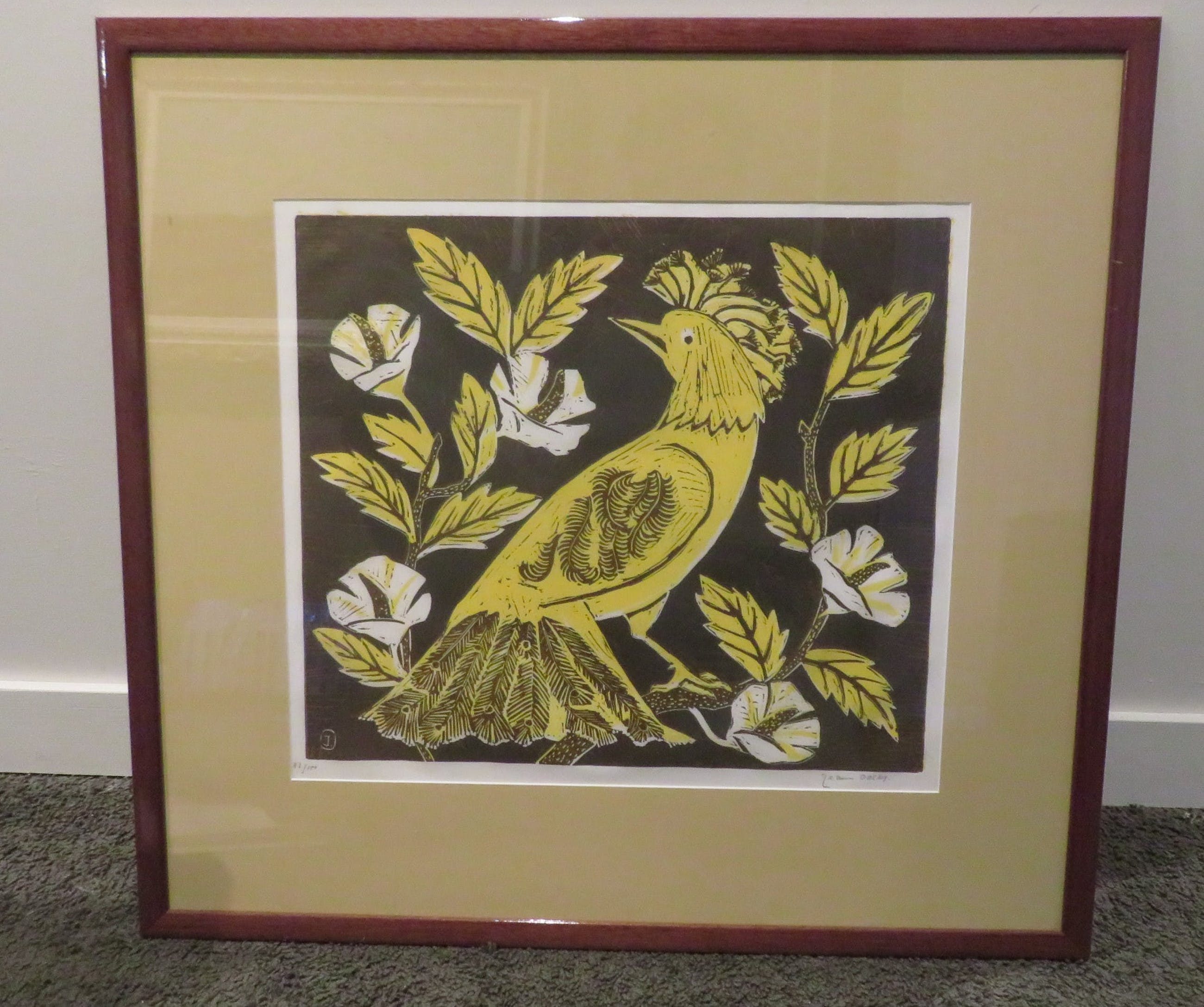 Mysterieuze tropische vogel in zwart, geel en wit van Jeanne Bieruma Oosting in originele lijst.