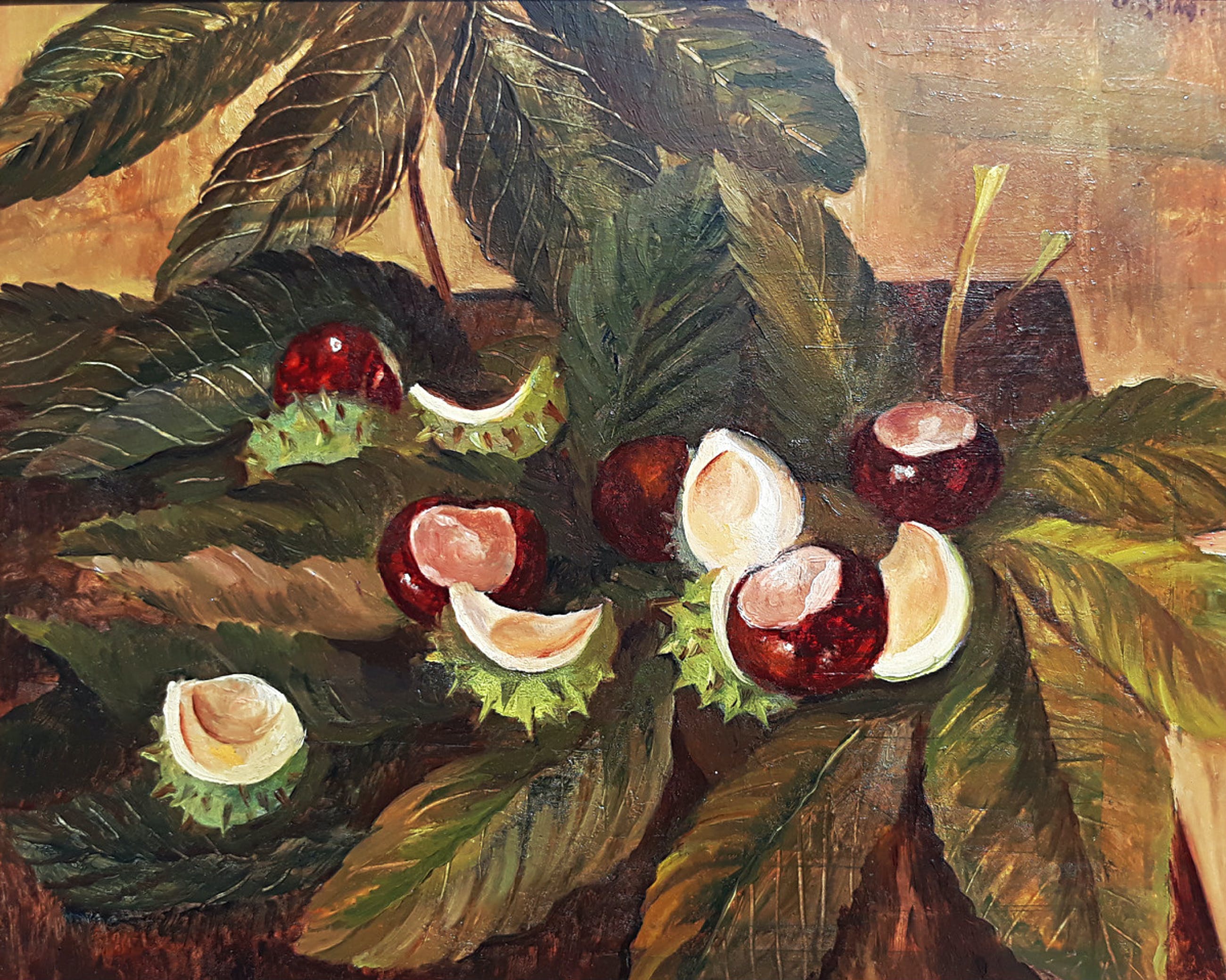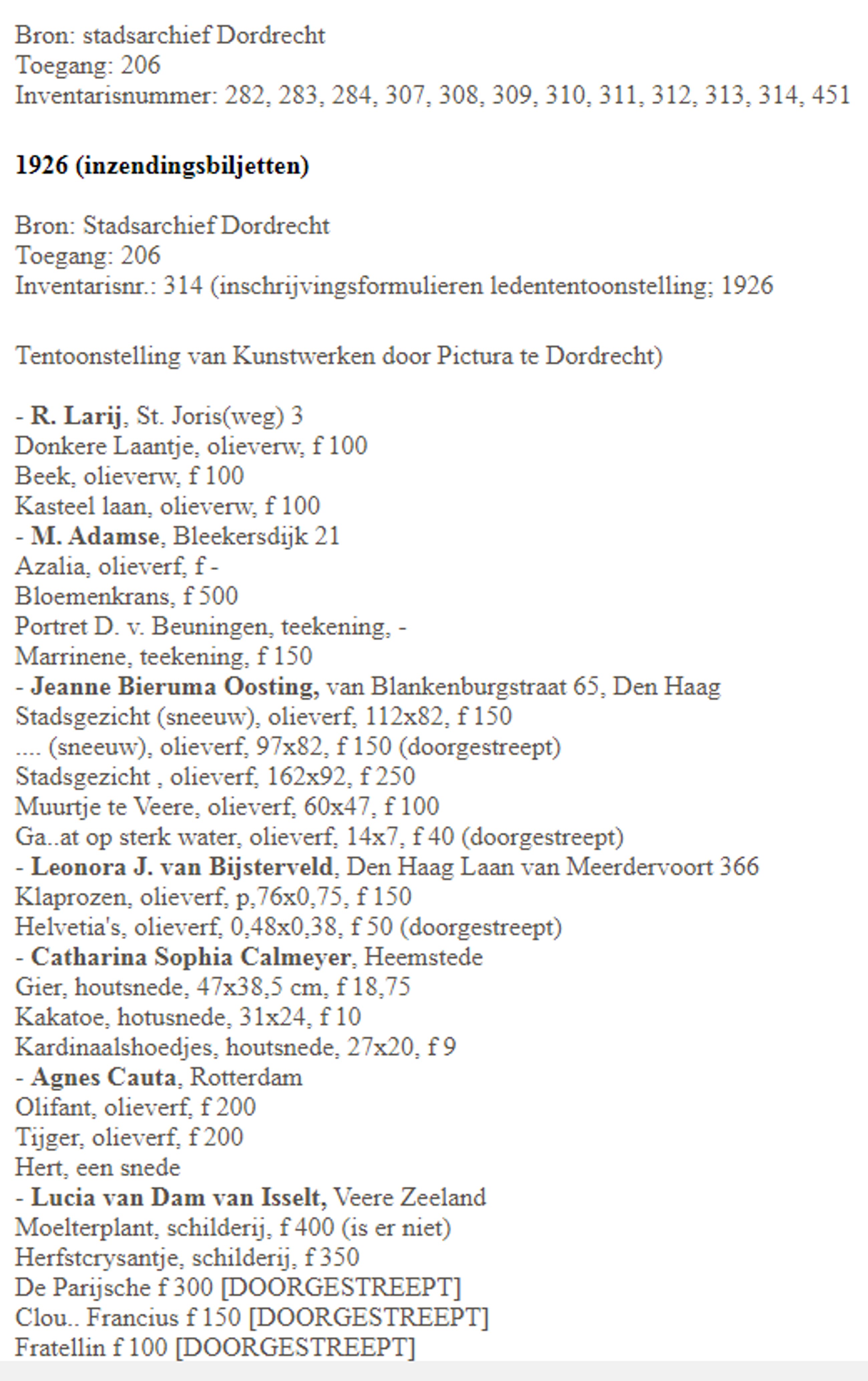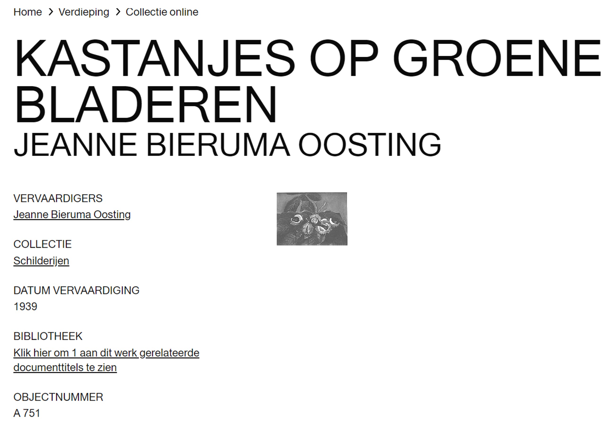 Jeanne Bieruma Oosting heeft echt op het genoemde adres geregistreerd gestaan, er is in ieder geval een vermelding in het stadsarchief van Dordrecht met betrekking tot ingebracht werk voor een tentoonstelling (zie foto 7). Ook zit er een bijna identiek schilderij uit 1939 in de collectie van het Stedelijk Museum in Amsterdam, bijna zeker geschilderd naar dezelfde selectie kastanjes en bladeren (zie foto 8).