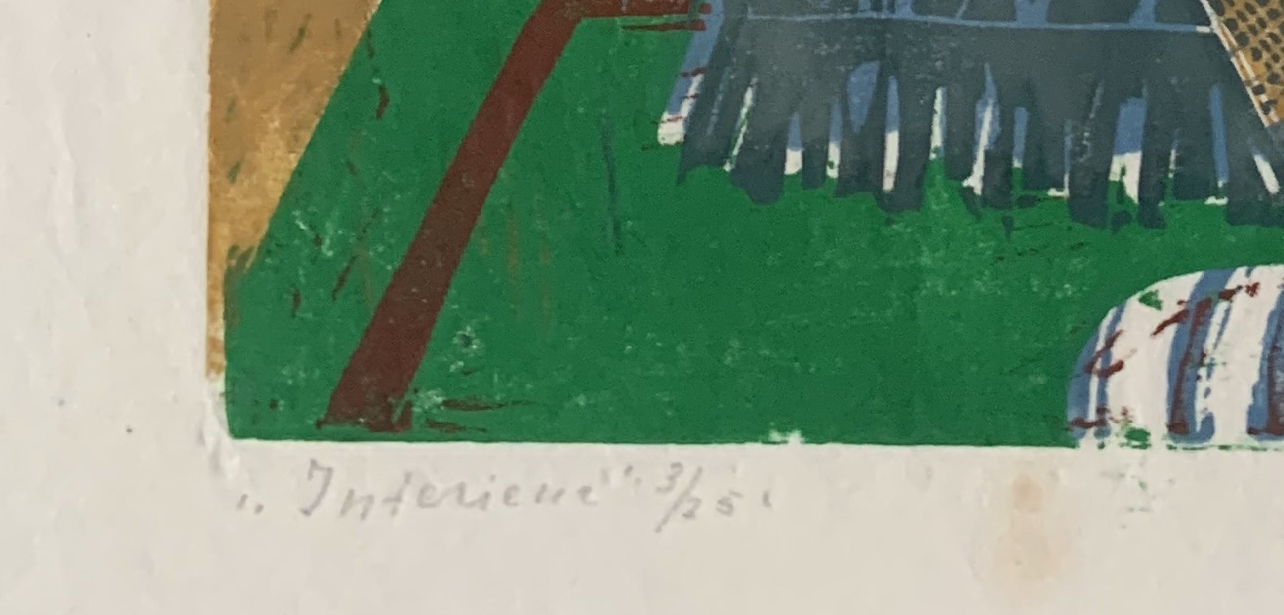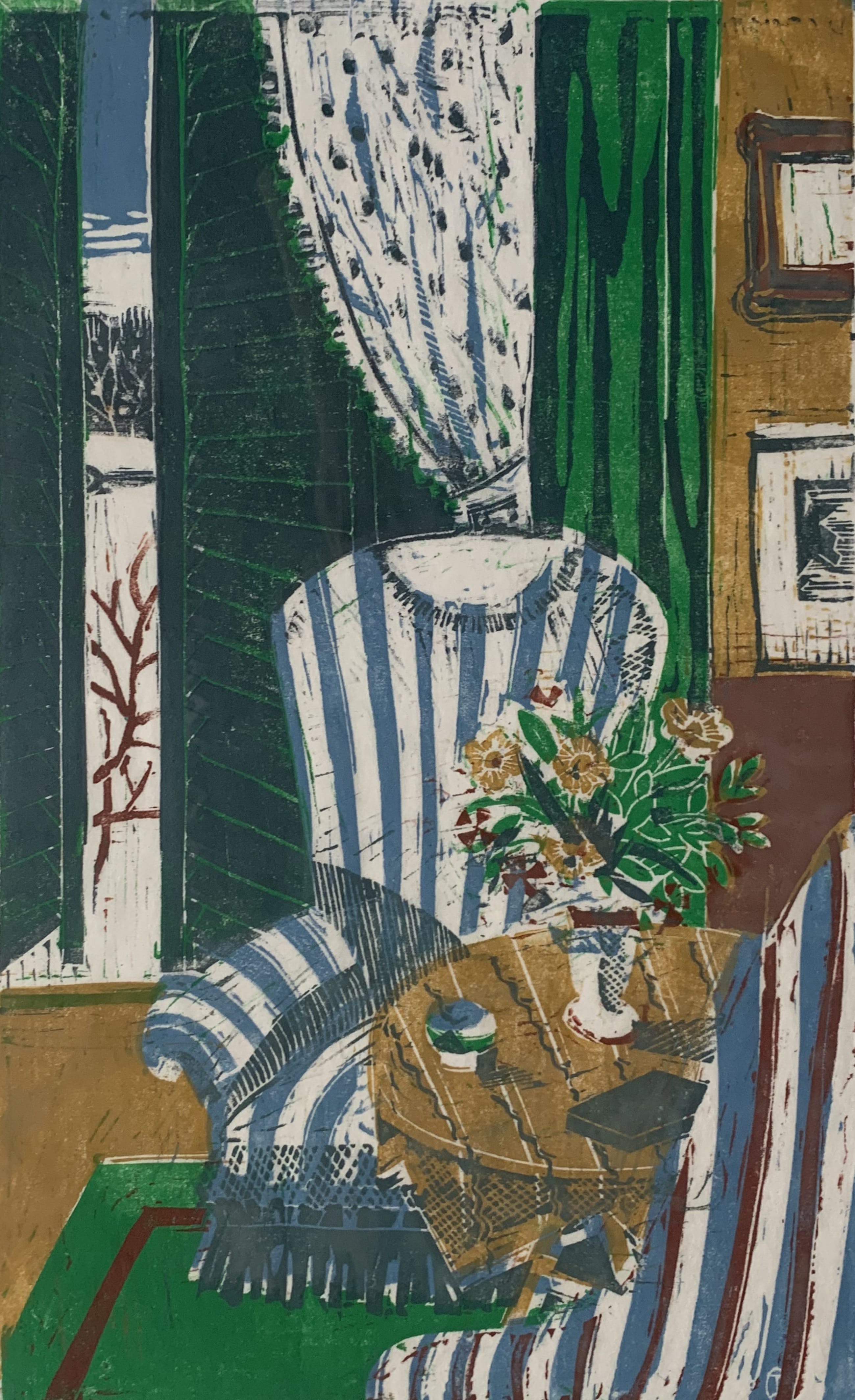 Een linosnede is een bewerkelijke techniek, door de kunstenares zelf uitgevoerd.