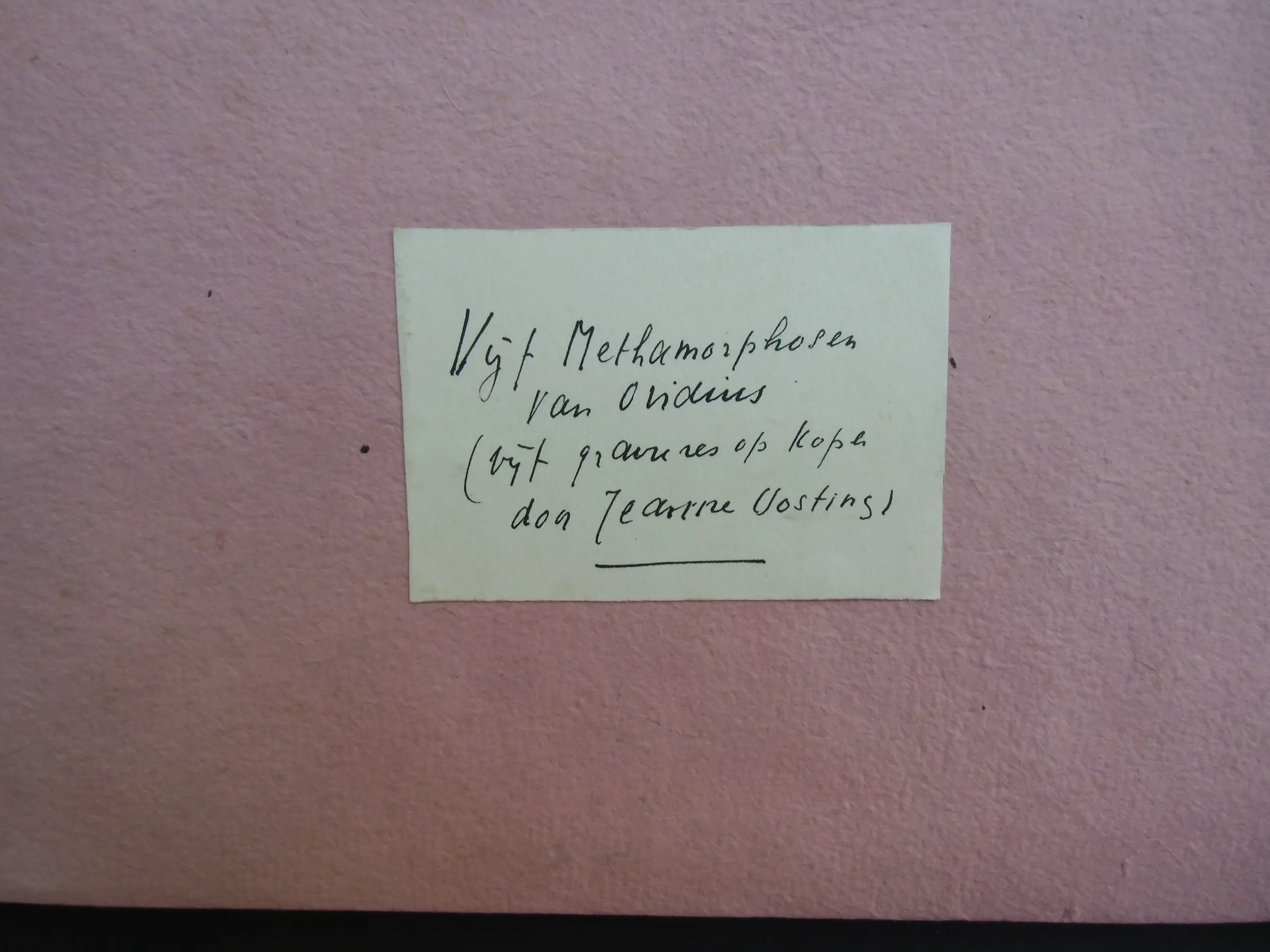 De vijf Metamorfosen van Ovidius zijn door Jeanne Oosting in de dertiger jaren van de vorige eeuw in Parijs gemaakt. Alle gravures zijn in de plaat gesigneerd. Aanwezig is de originele omslag met titels van de werken en een roze omslag van de collectioneur. Uitvoering op geschept papier.