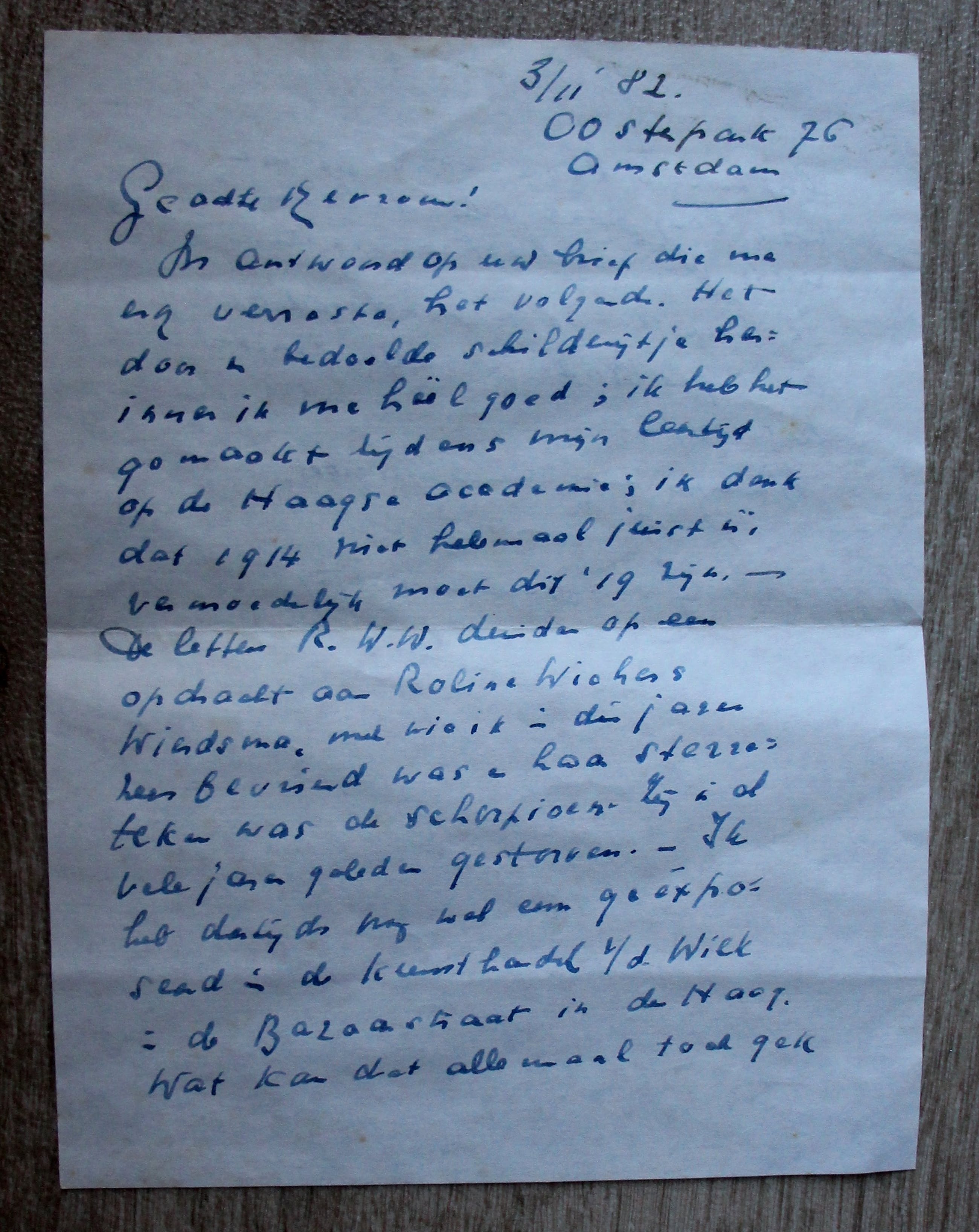 Bij dit werk een door Bieruma Oosting ondertekende brief (dd. 3 nov. 1982) waarin ze schrijft dat dit werk was opgedragen aan een goede vriendin Roline Wichers Wierdsma, die Schorpioen als sterrenbeeld had. De grafica Roline Maria Wichers Wierdsma (1891-1970) was onder andere leerlinge van Simon Moulijn en Willem van Konijnenburg en woonde sinds 1921 te Aagtekerke. Zij maakte vooral gebruiksgrafiek, zoals ex-libris, en verder bloemen, paarden, strandmotieven e.d. in droge naald, houtsnede en litho. Bekend werd de door haar ontworpen Willem de Zwijgerpostzegel (1933).
