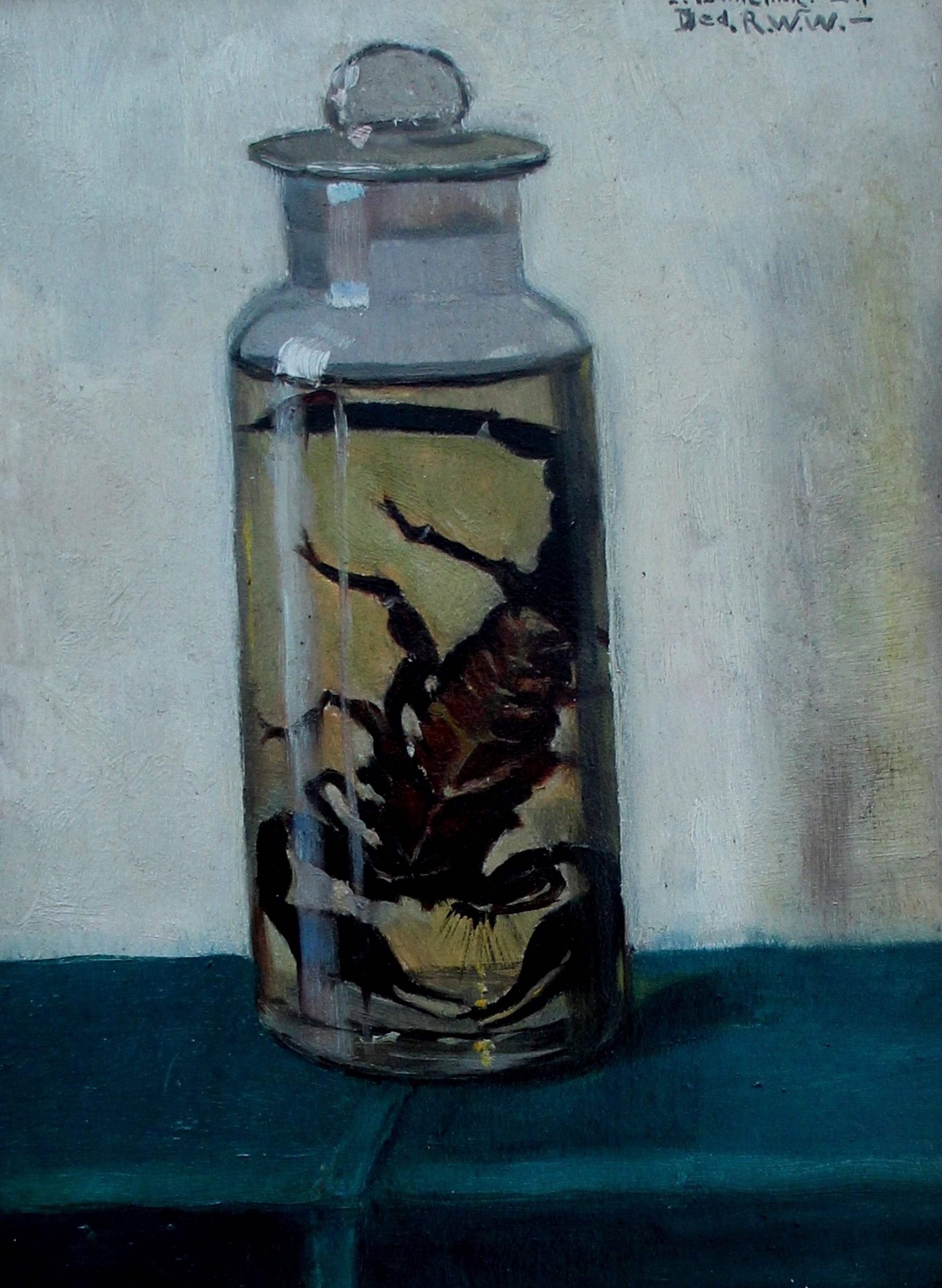 Olieverf op paneel van Jeanne Bieruma Oosting. Afmetingen werk incl lijst: H37 x b31cm. Afmetingen voorstelling: H23.5 x b17.5cm. Titel: Schorpioen. Jaar: 1924. Opdracht 'Ded. R.W.W.'. Tevens in dorso get. en getiteld op handgeschreven etiket.
