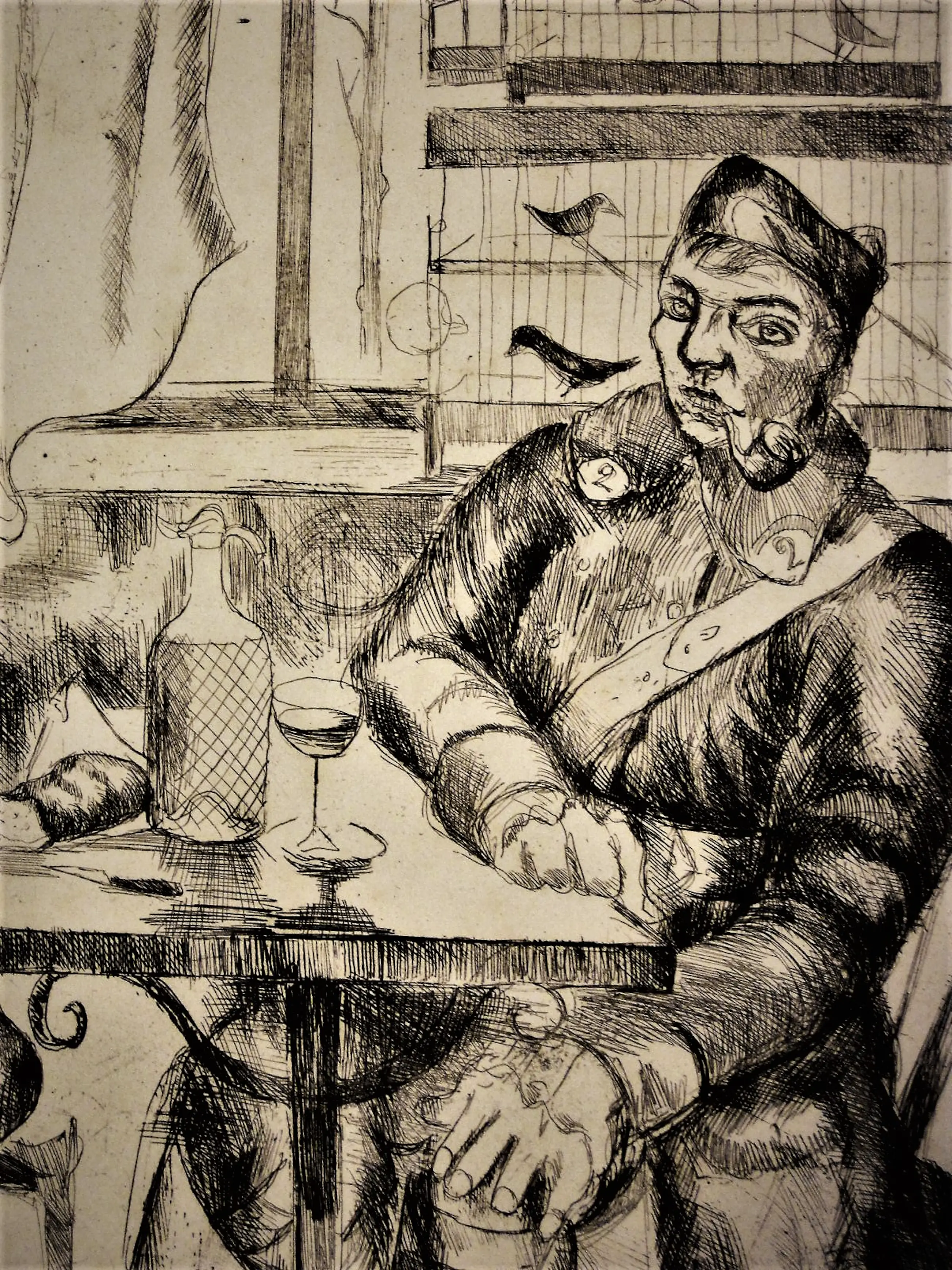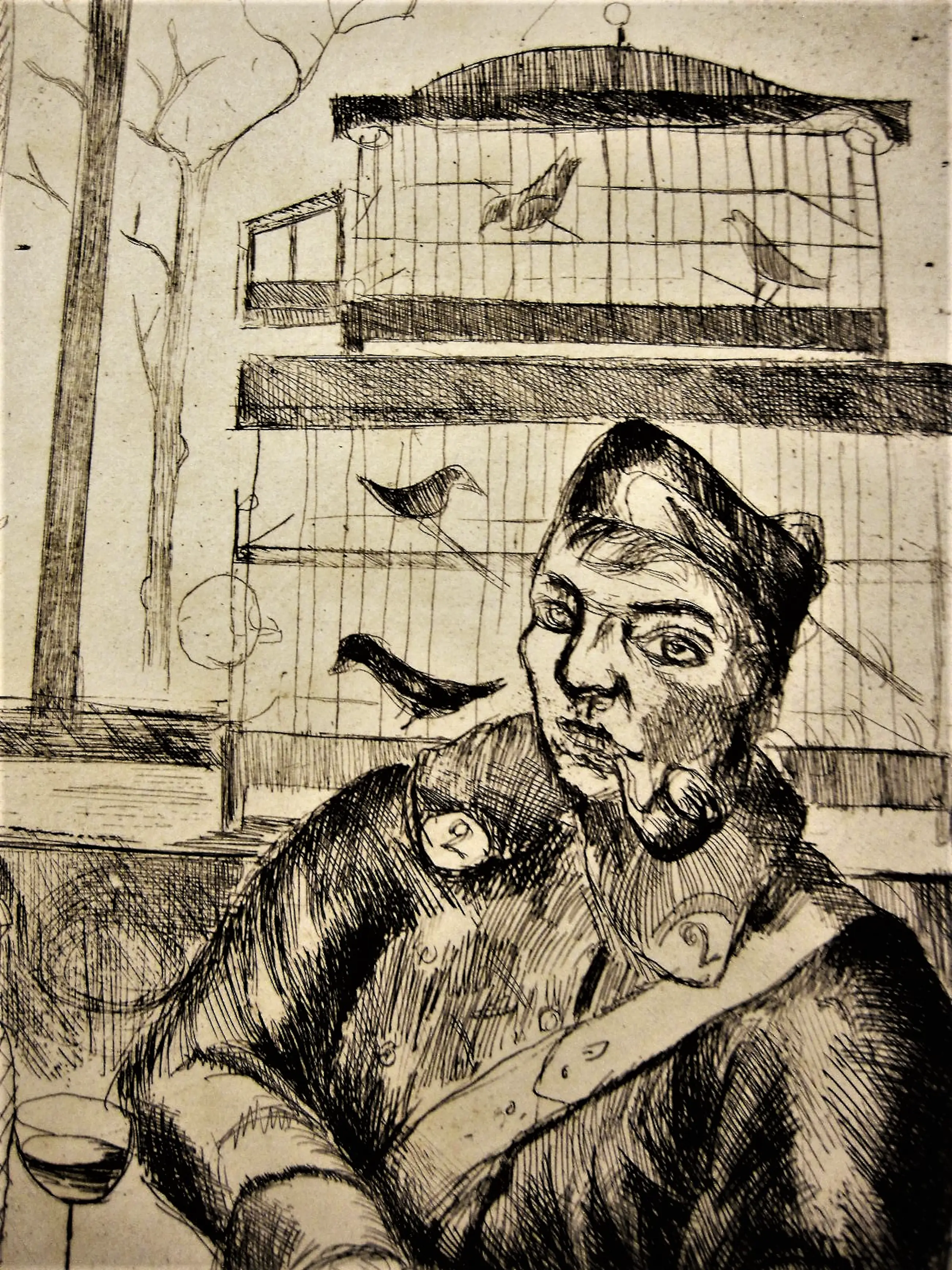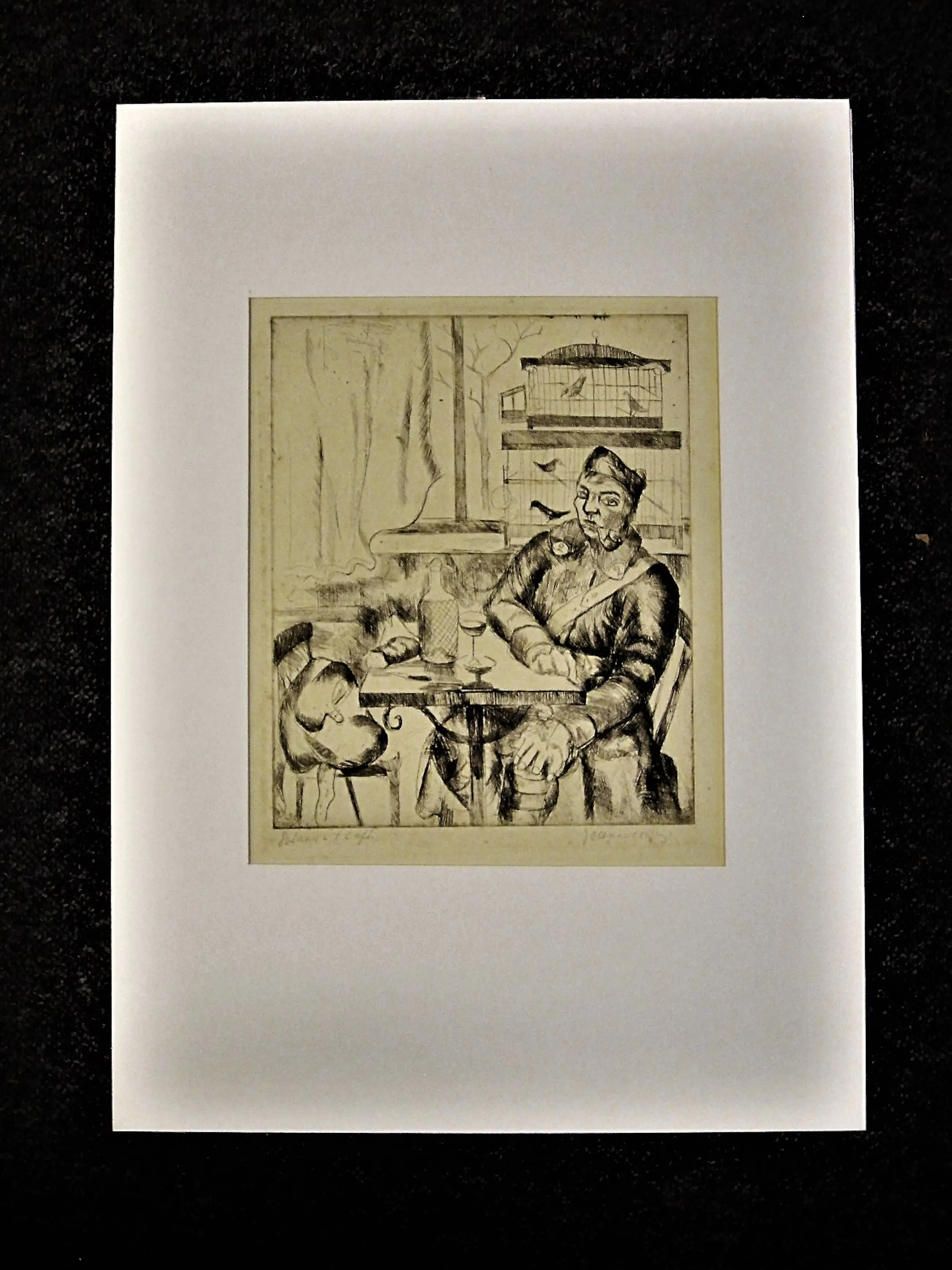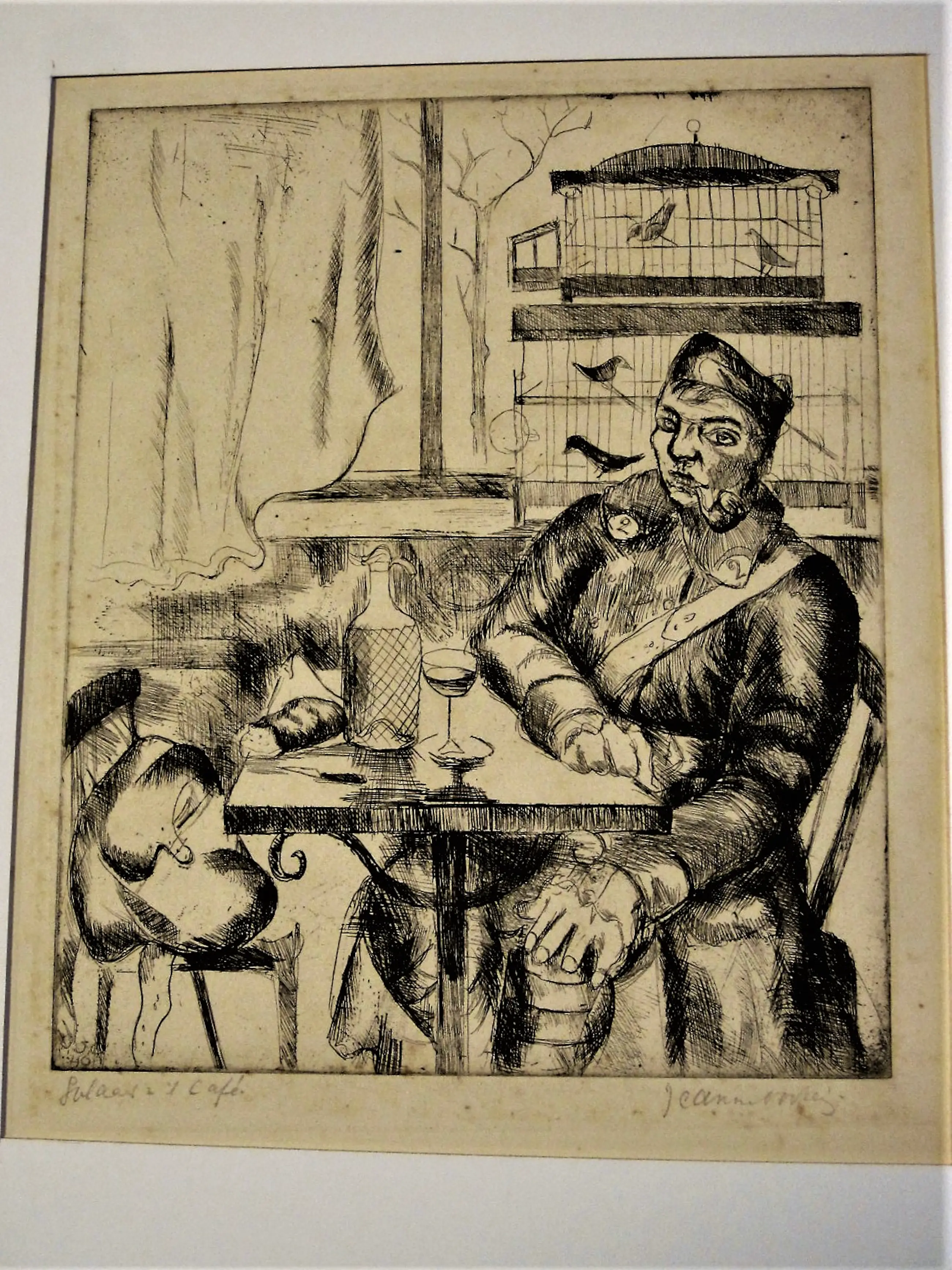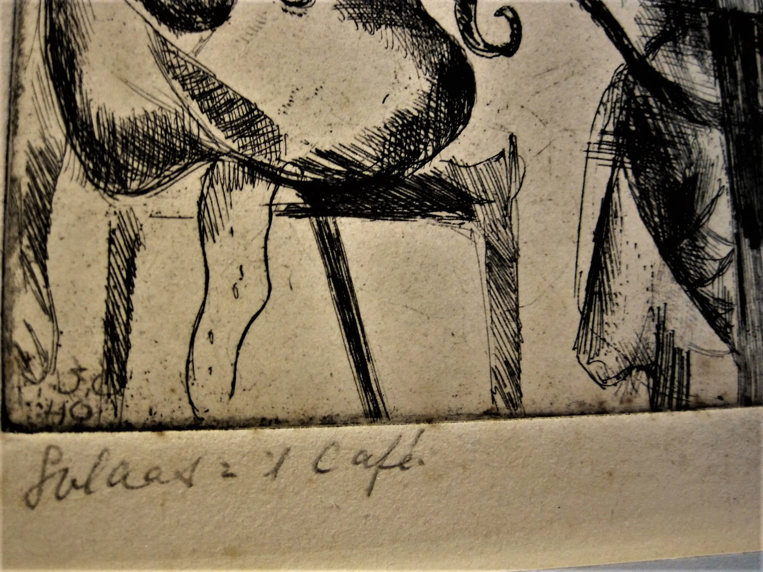 - Bijzondere, in 1940 door jeanne Bieruma Oosting gemaakte "oorlogs" - Ets met voorstelling van een Nederlandse soldaat in een cafe. De Ets verkeert in goede staat en is zowel in de plaat alsook met potlood getiteld en gesigneerd. Afmetingen van de Ets zijn ca. 20x25cm (BxH)