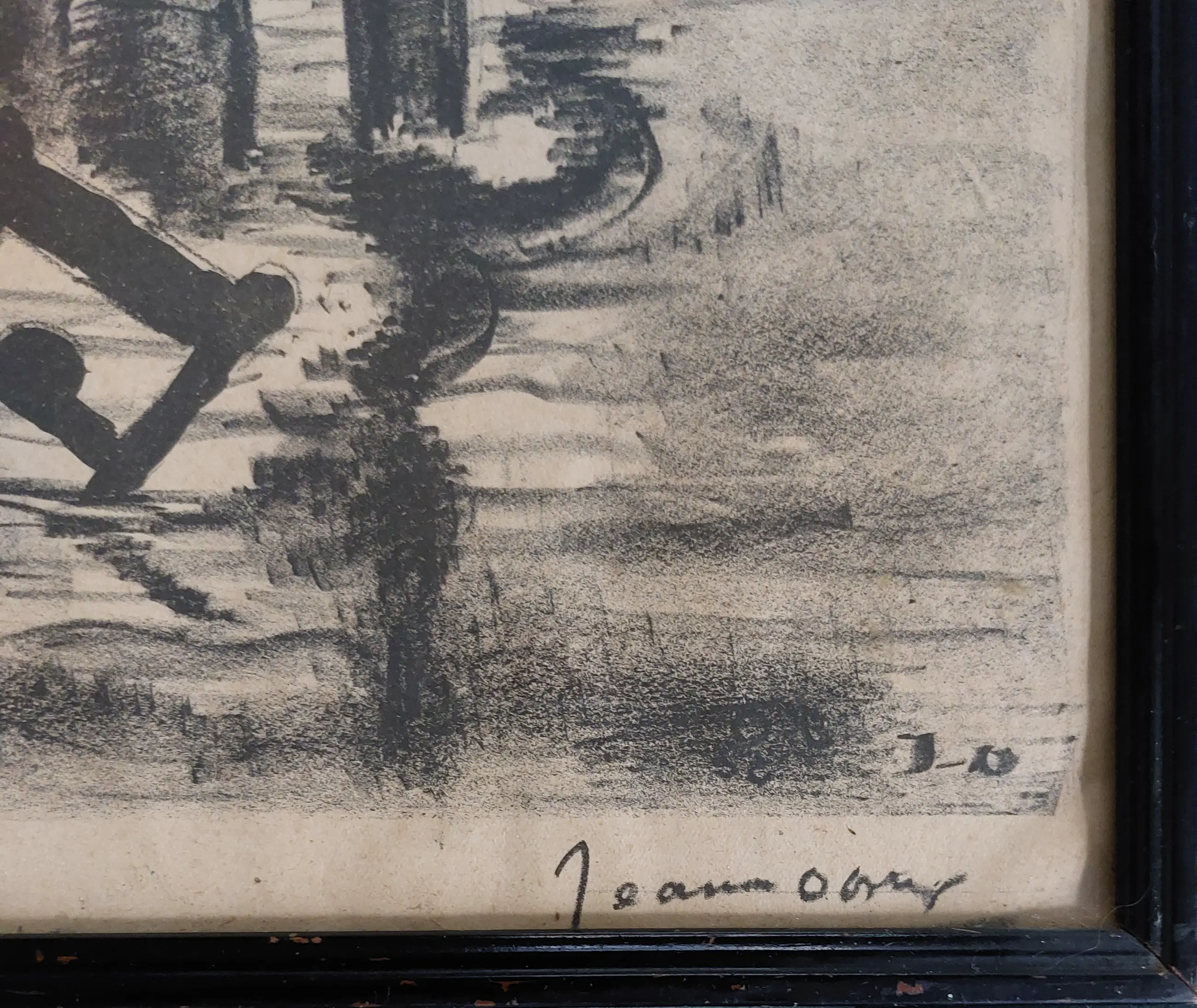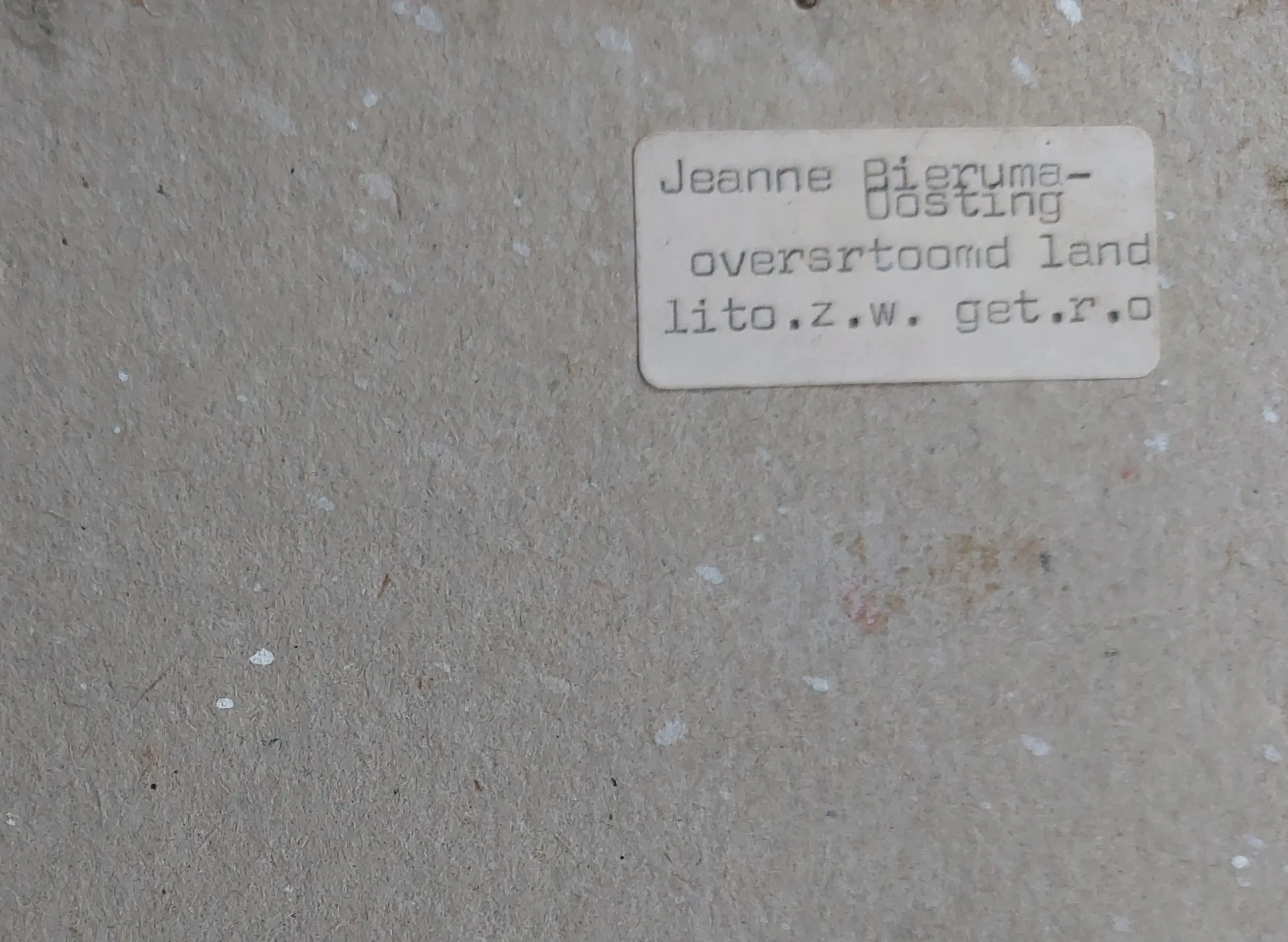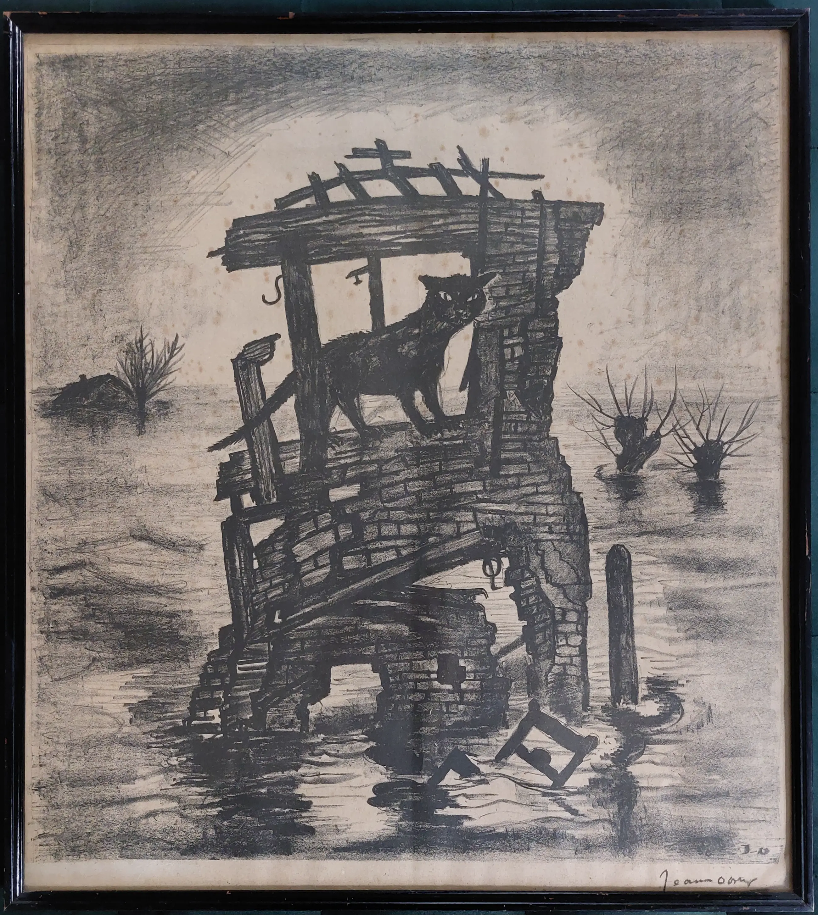 Zeldzame grote litho van Jeanne Bieruma Oosting getiteld 'Overstroomd land'. Handgesigneerd rechtsonder. In oude lijst.