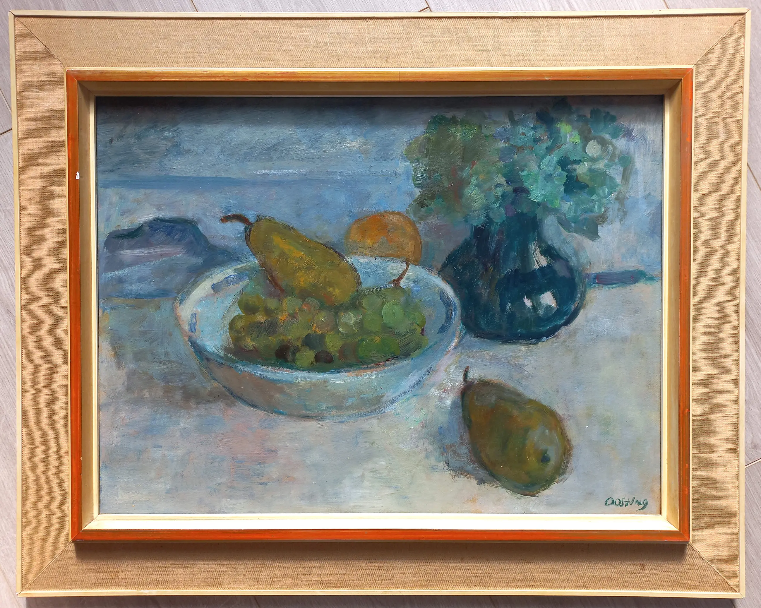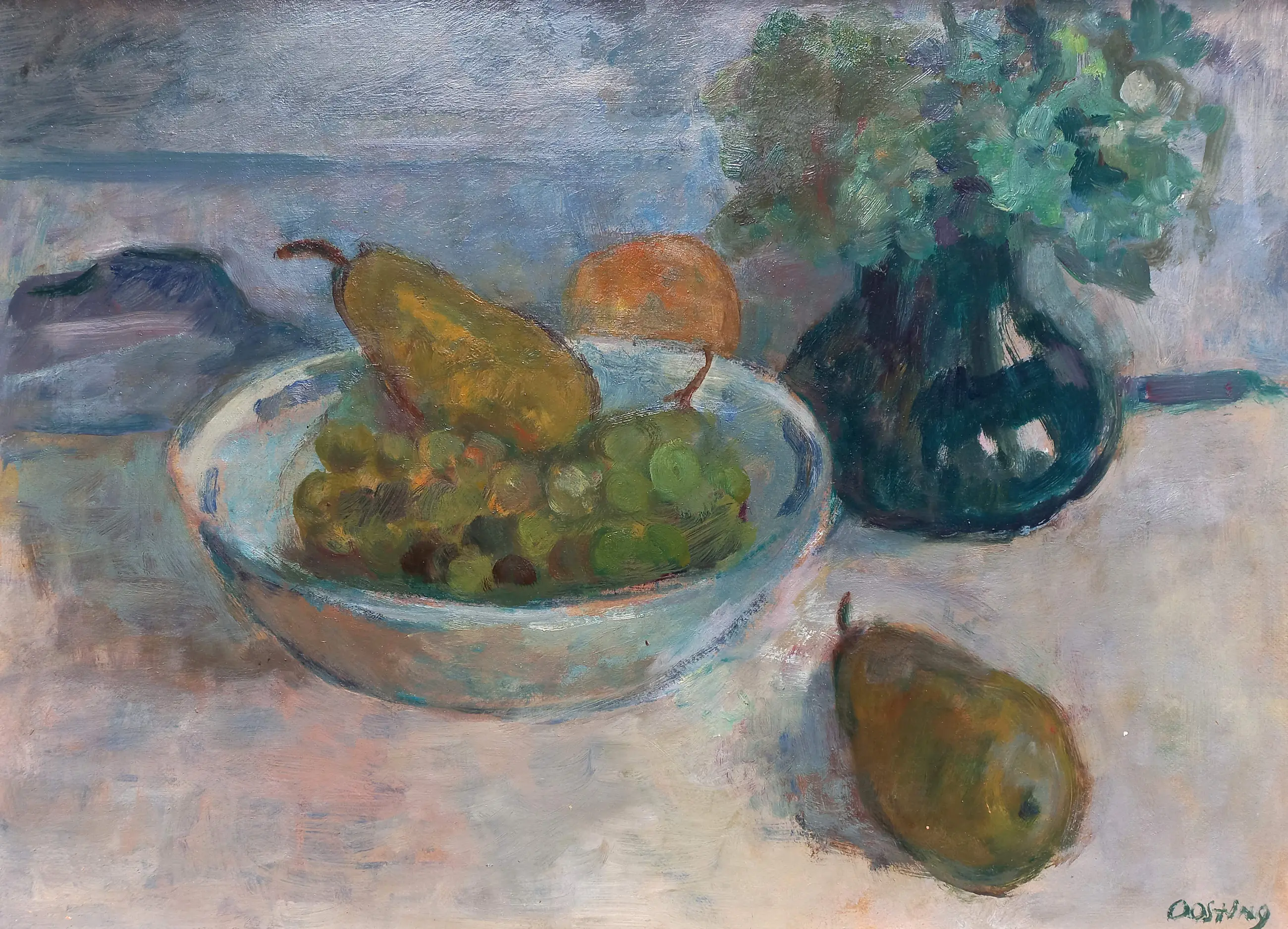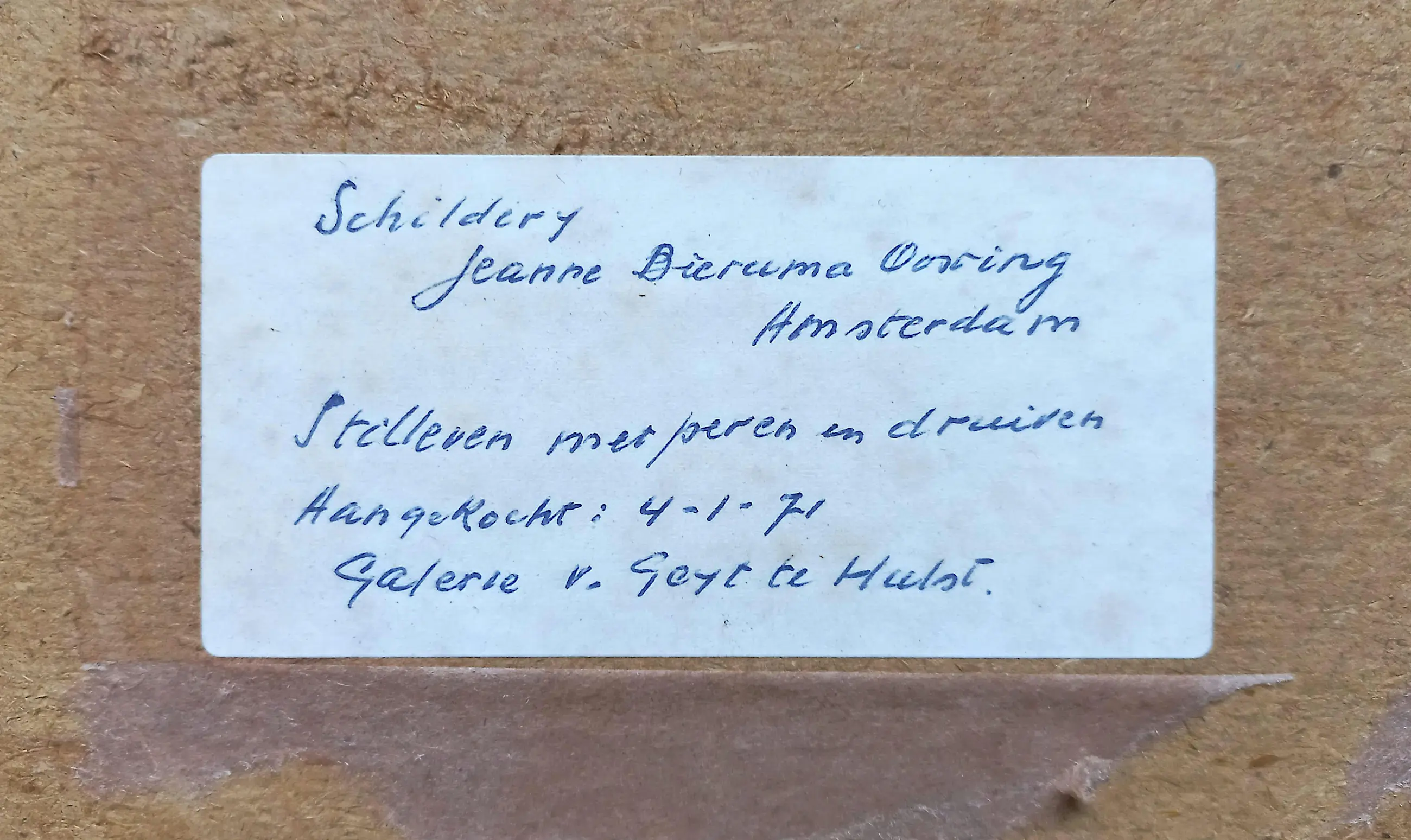 Zeer mooi stilleven van Jeanne Bieruma Oosting. Olieverf op board, gesigneerd rechtsonder, in (waarschijnlijk) originele lijst. Geheel in goede conditie; schilderij in zeer goede conditie maar verdient een nieuwe lijst. Herkomst: Galerie van Geyt, Hulst (1971).