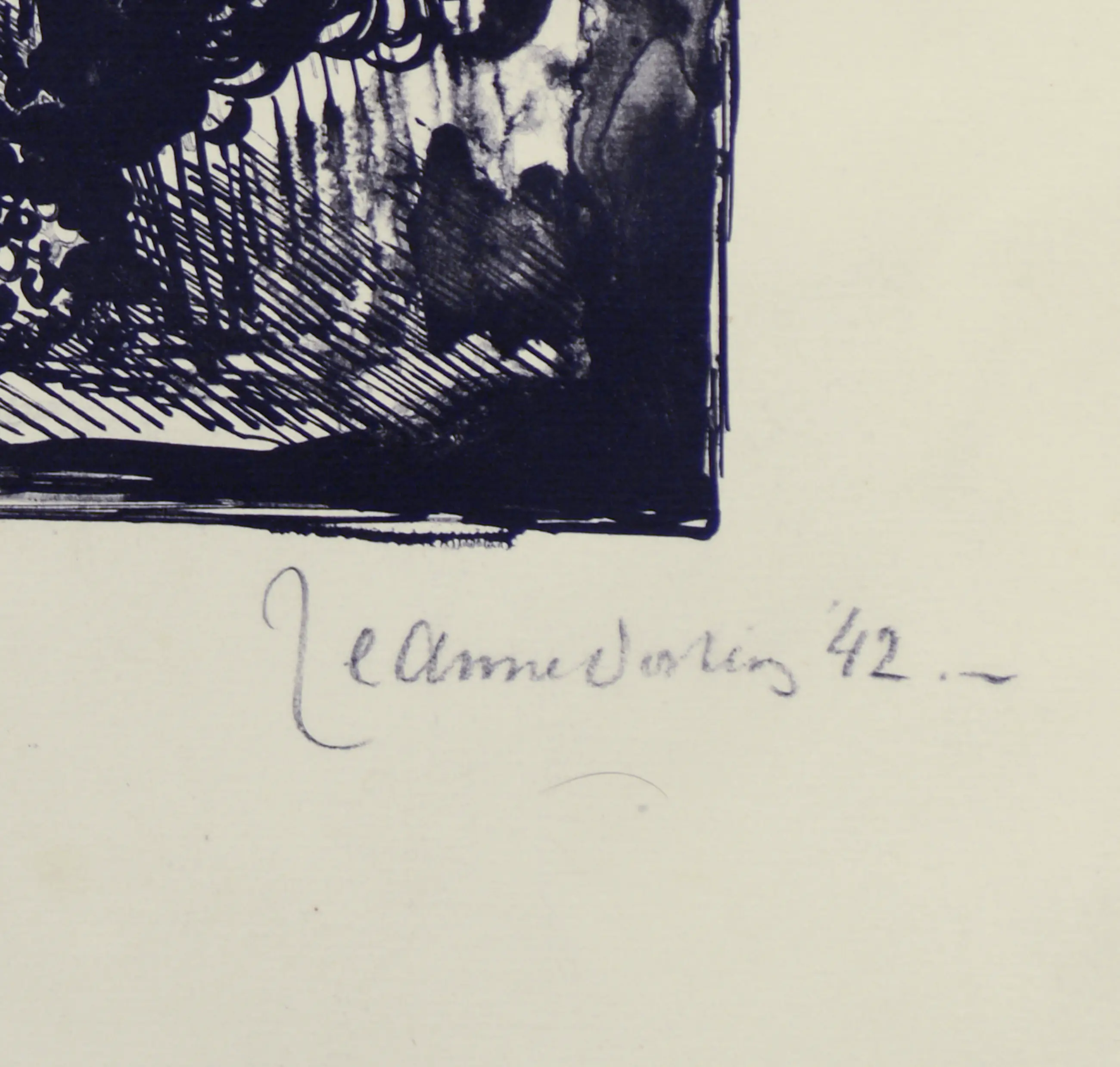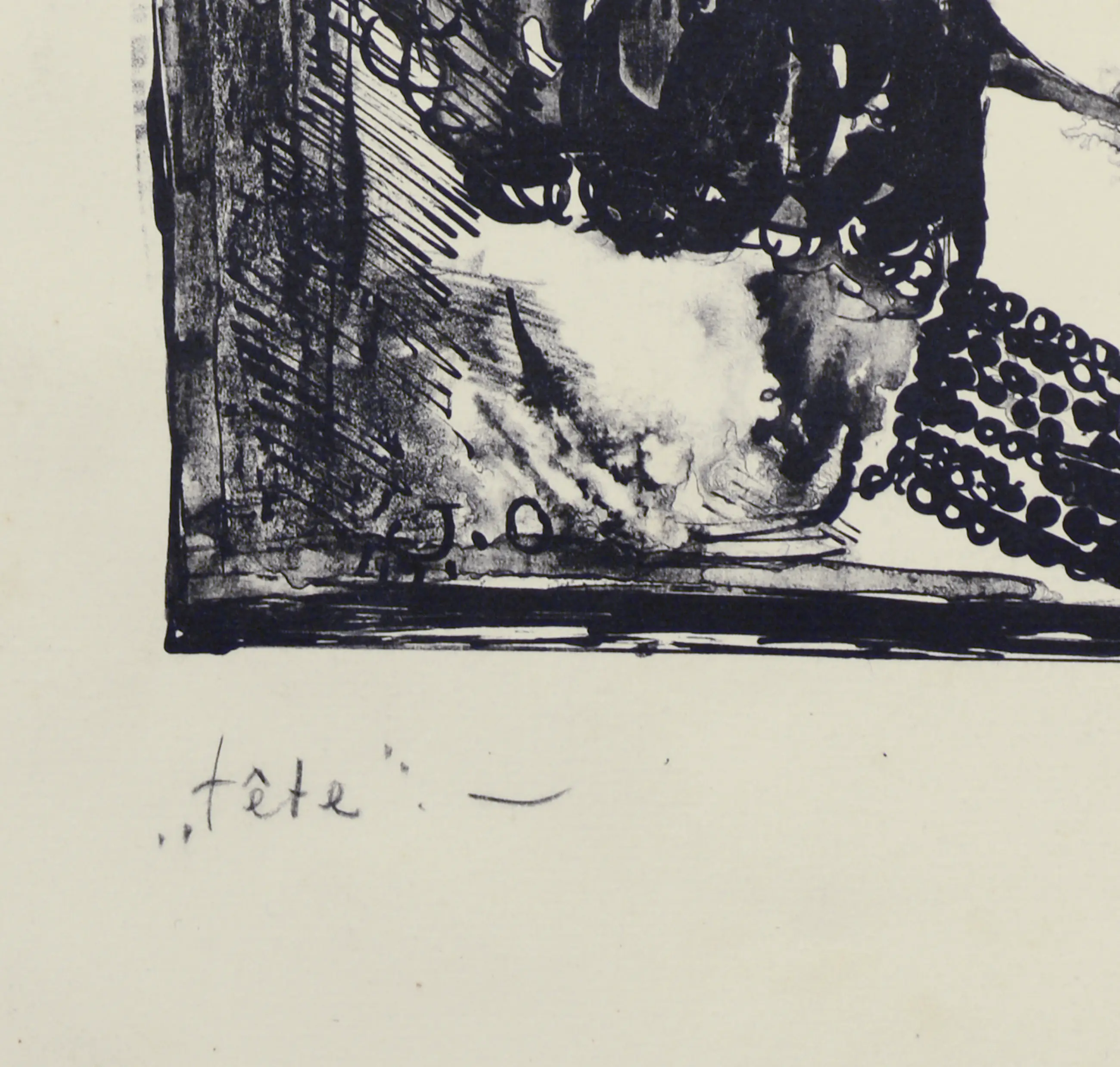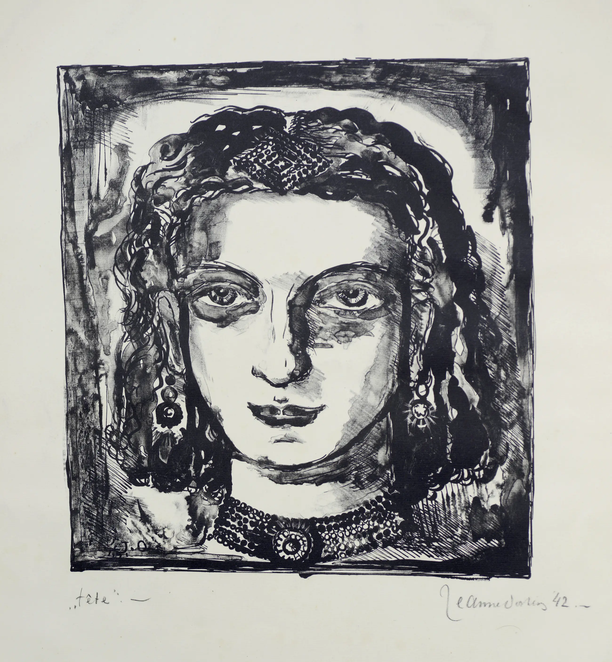 Lithografie in tusche 290x260mm. De litho is getekend op een steen van 42x37cm en gedrukt op gevergeerd papier, bladmaat 58x45cm, waarschijnlijk Van Gelder en Zonen. De omtrekafdruk van de steen is nog duidelijk te zien. Signatuur, ' tete' en 1942 in potlood en het monogram JO l.o. in de steen. De litho is in het Rijksprenten Kabinet als ‘Portret onbekende vrouw’, gesigneerd, in een oplage van 15. Deze prent is vrijhangend gemonteerd op een zuurvrij achterblad, met idem passepartout. In onberispelijke conditie.