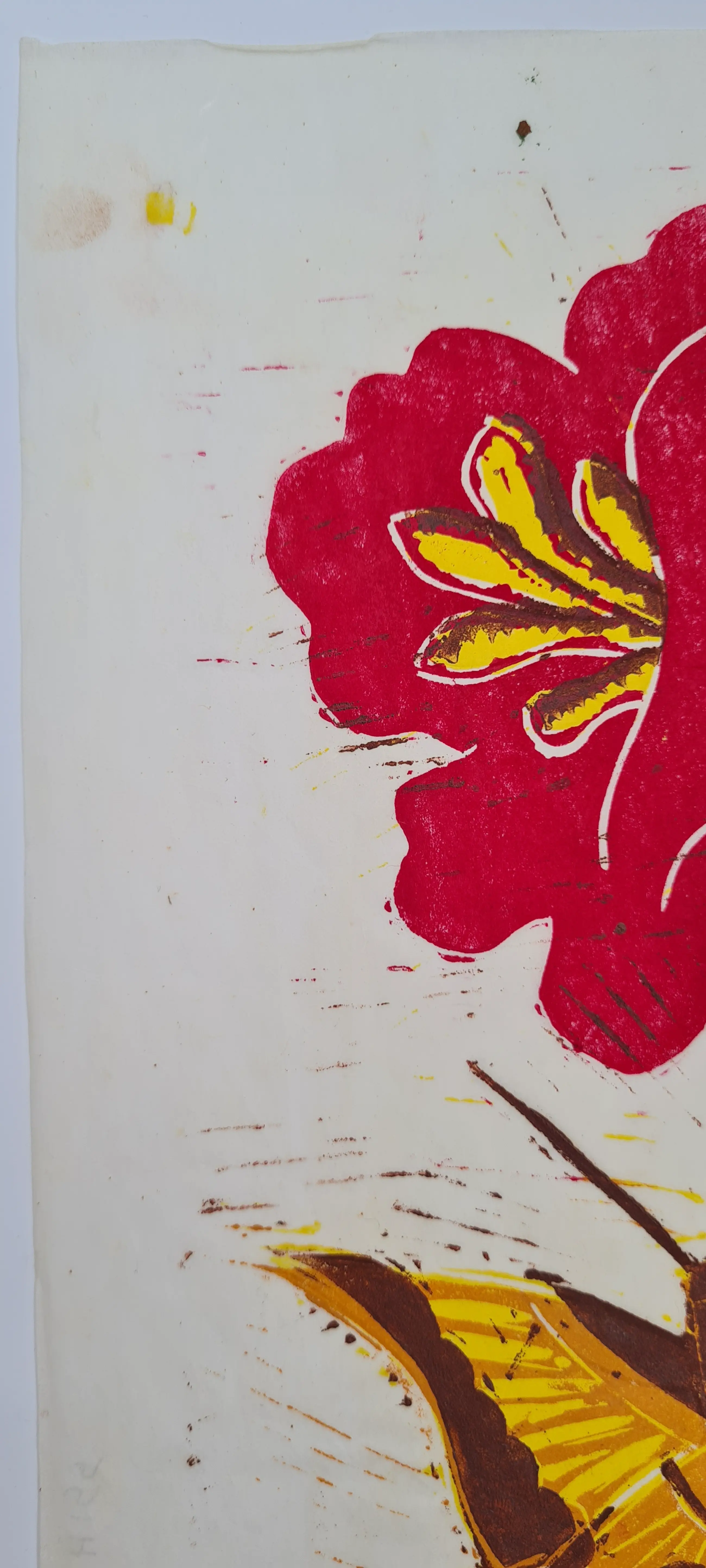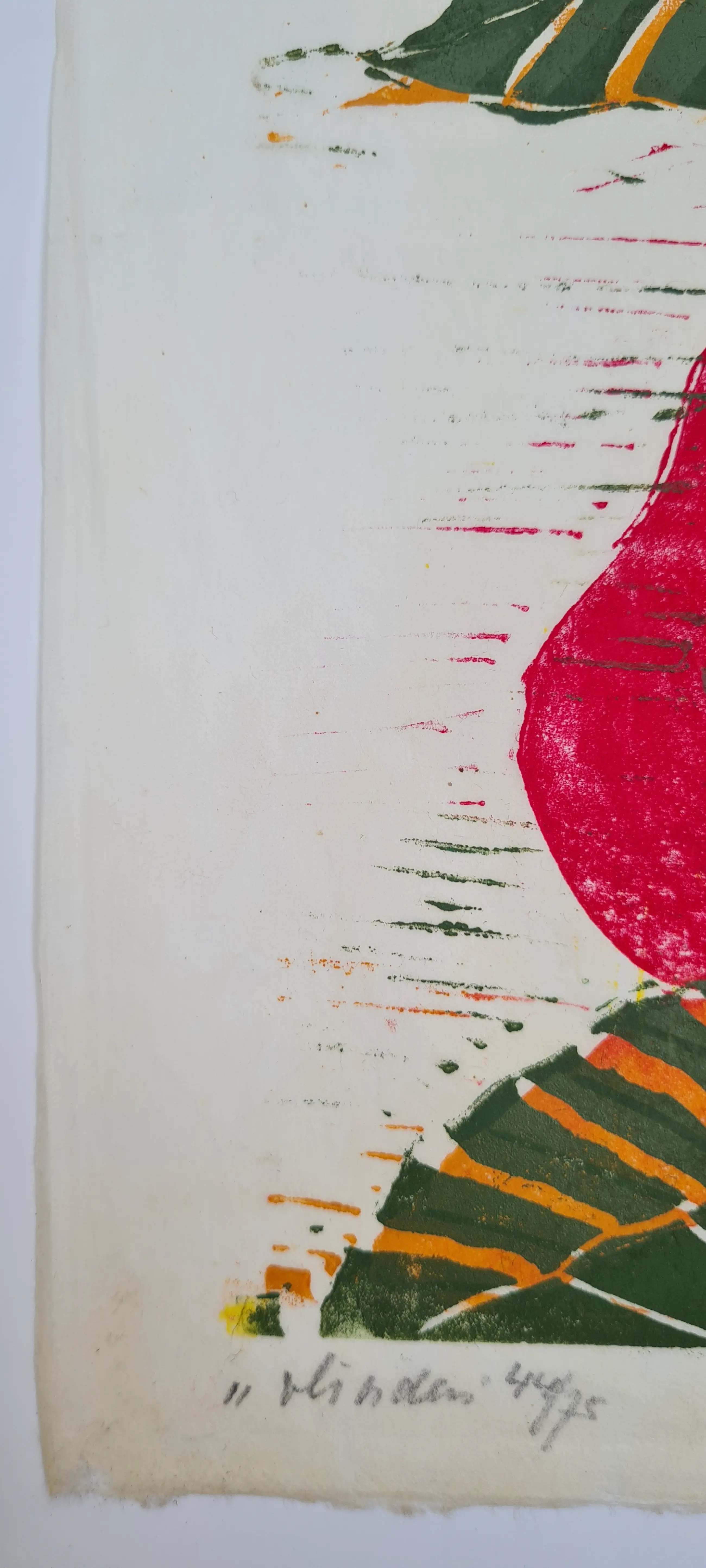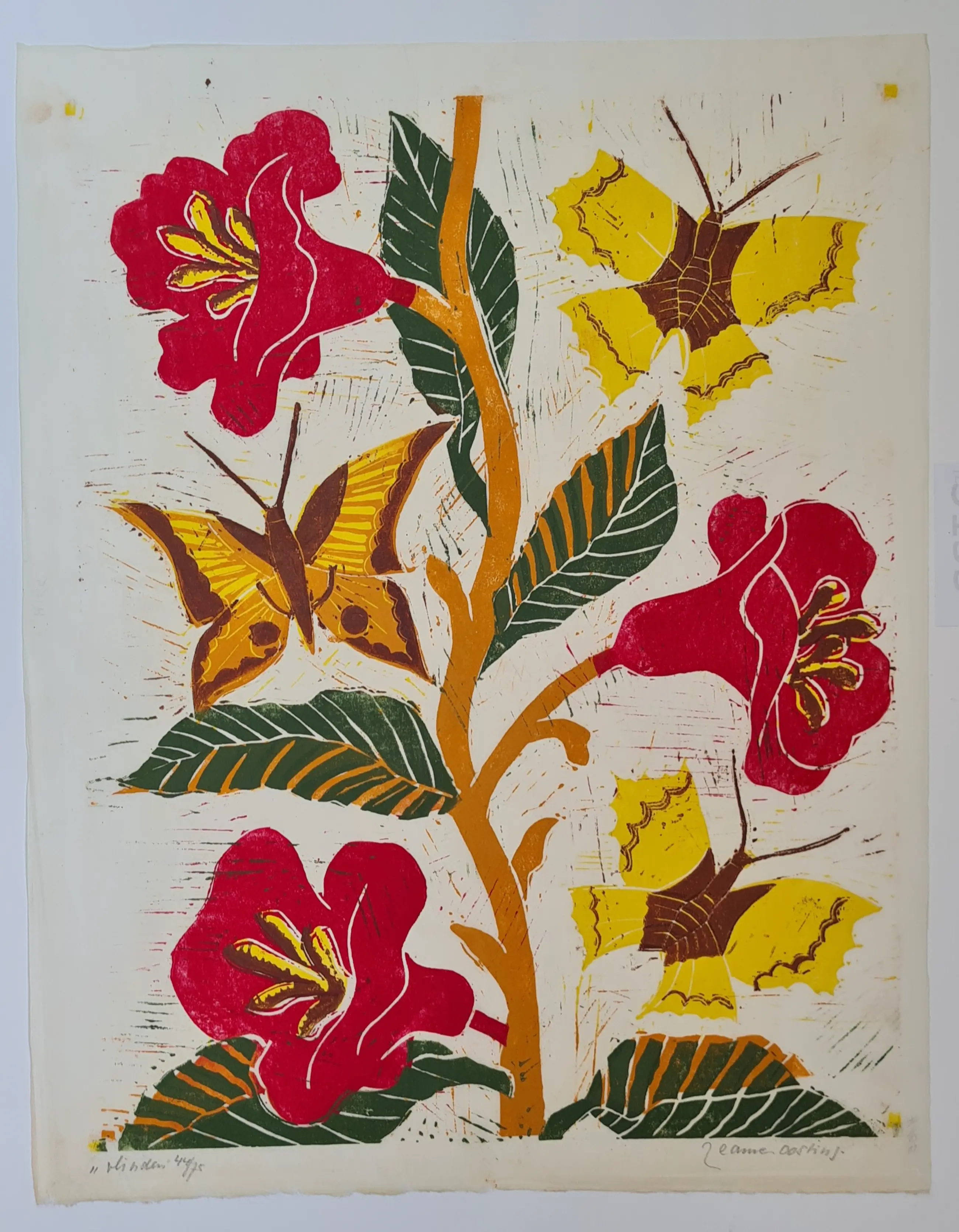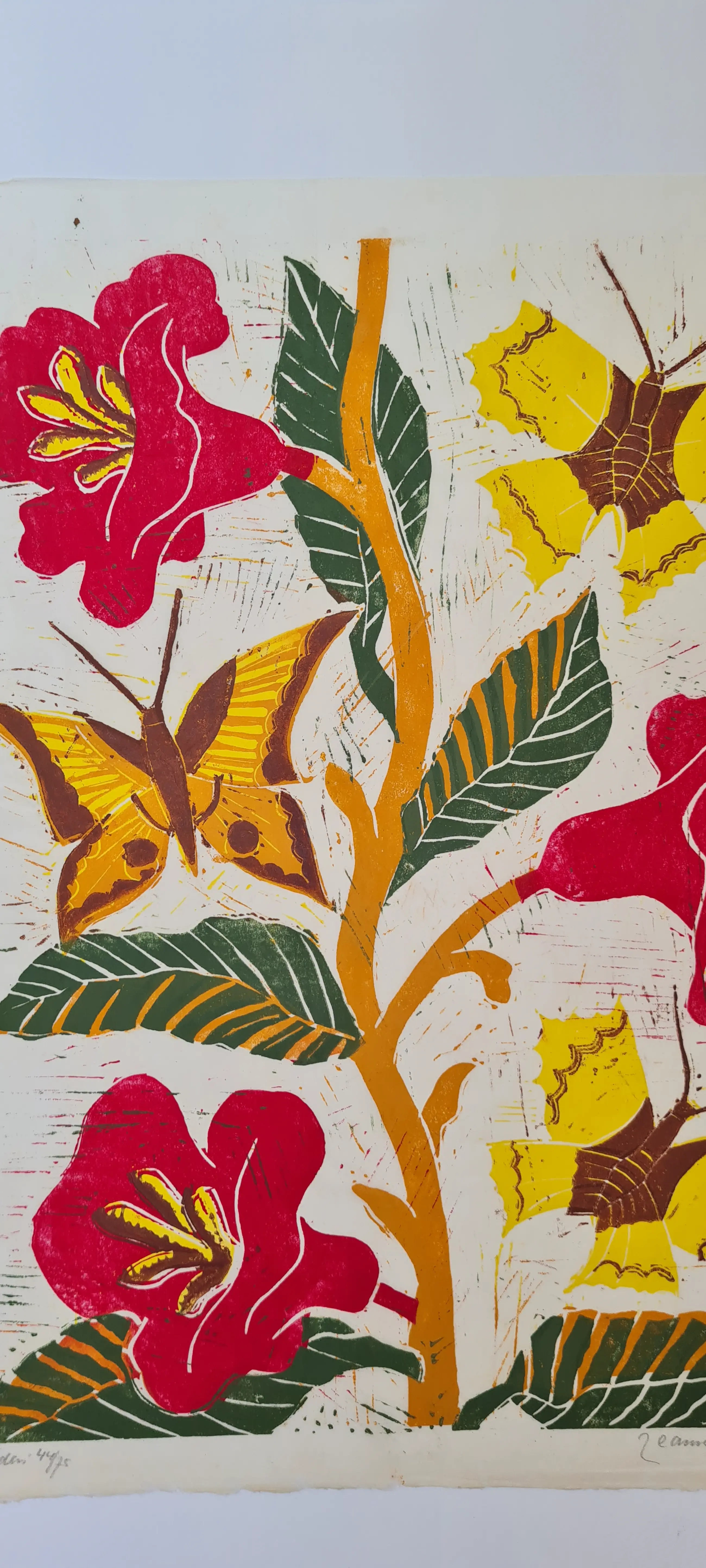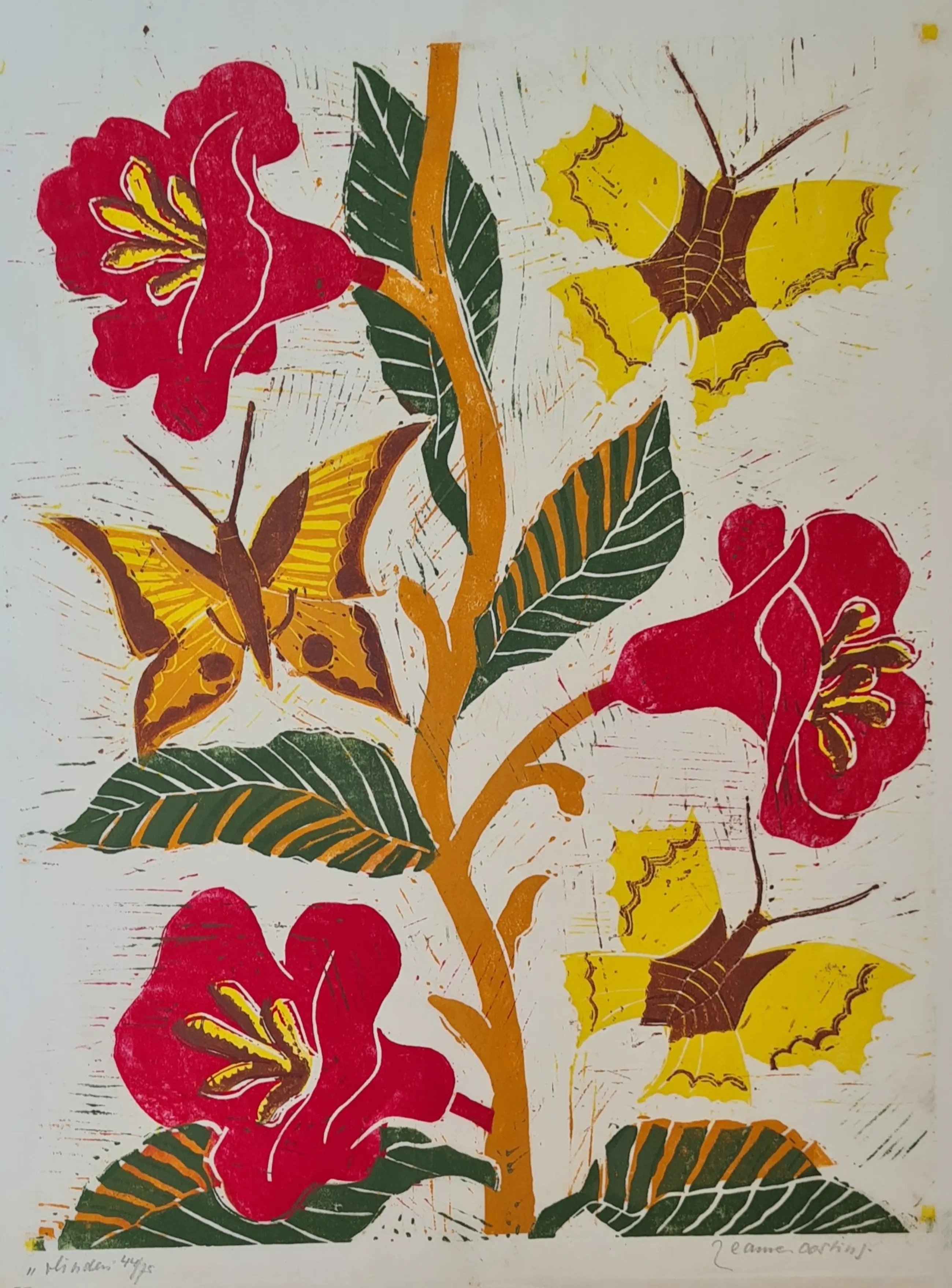 Prachtige linosnede van Jeanne Bieruma Oosting, gedrukt in 75 gesigneerde exemplaren op Chinees papier.