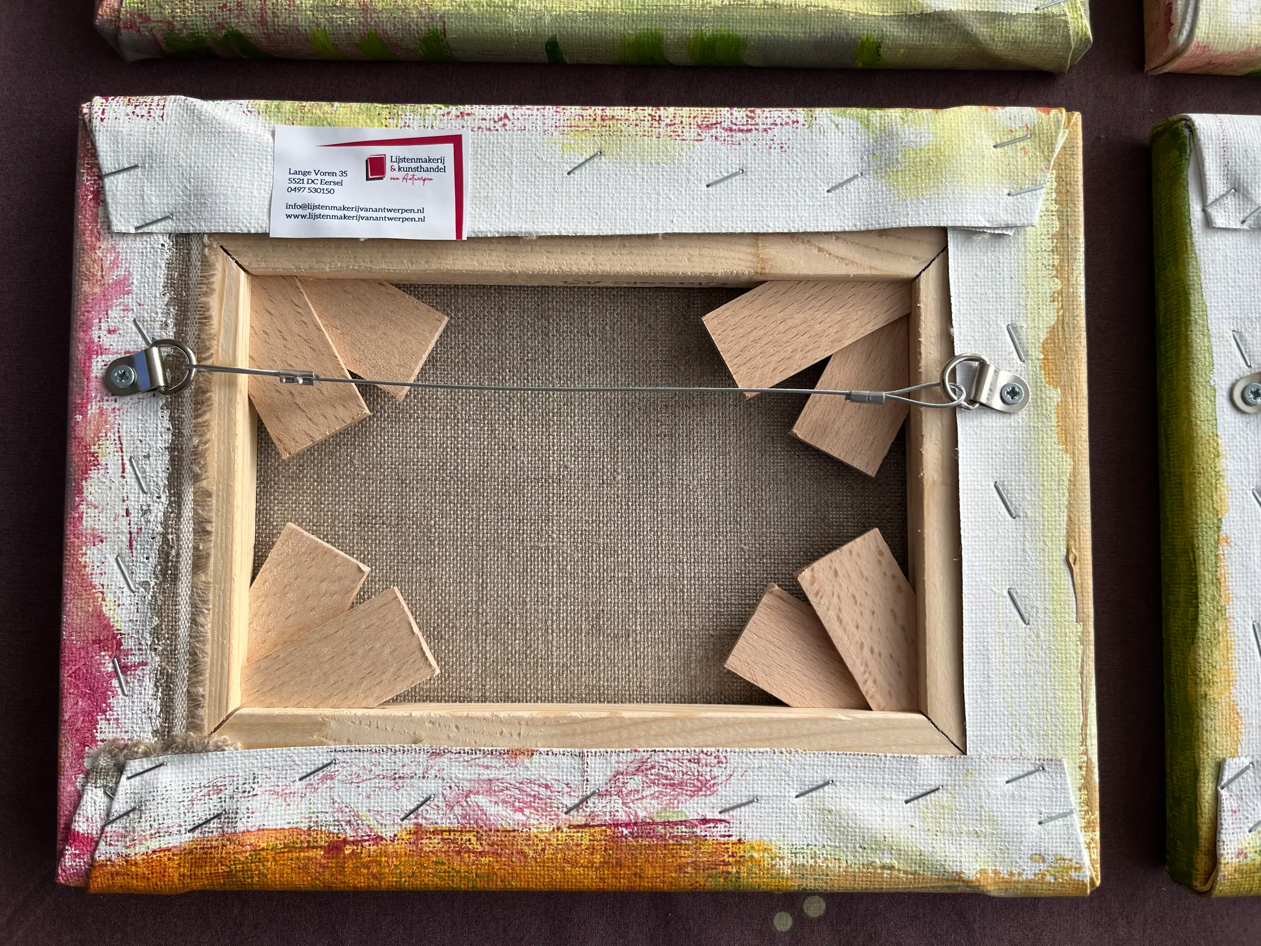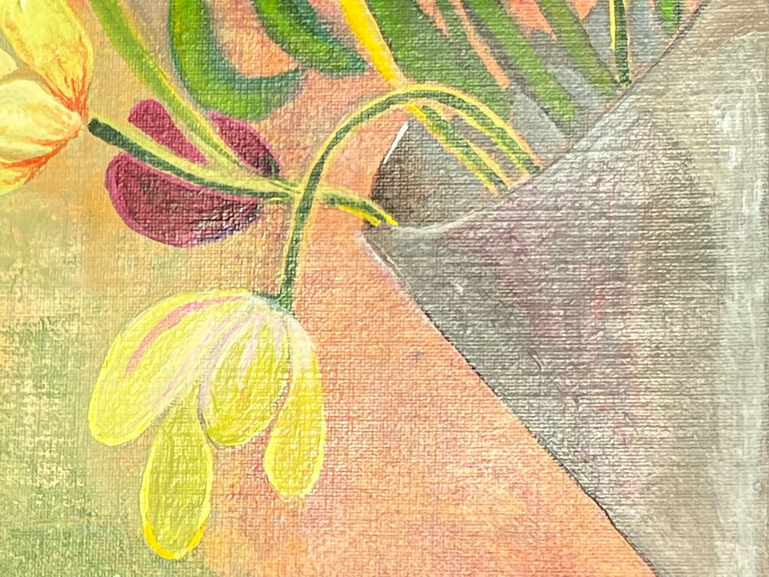 Kleurrijk tafereel: een waar lentedoekje.... Op linnen geschilderd. Één van vier. Gezamenlijk, maar ook apart, fraaie wandversiering.
