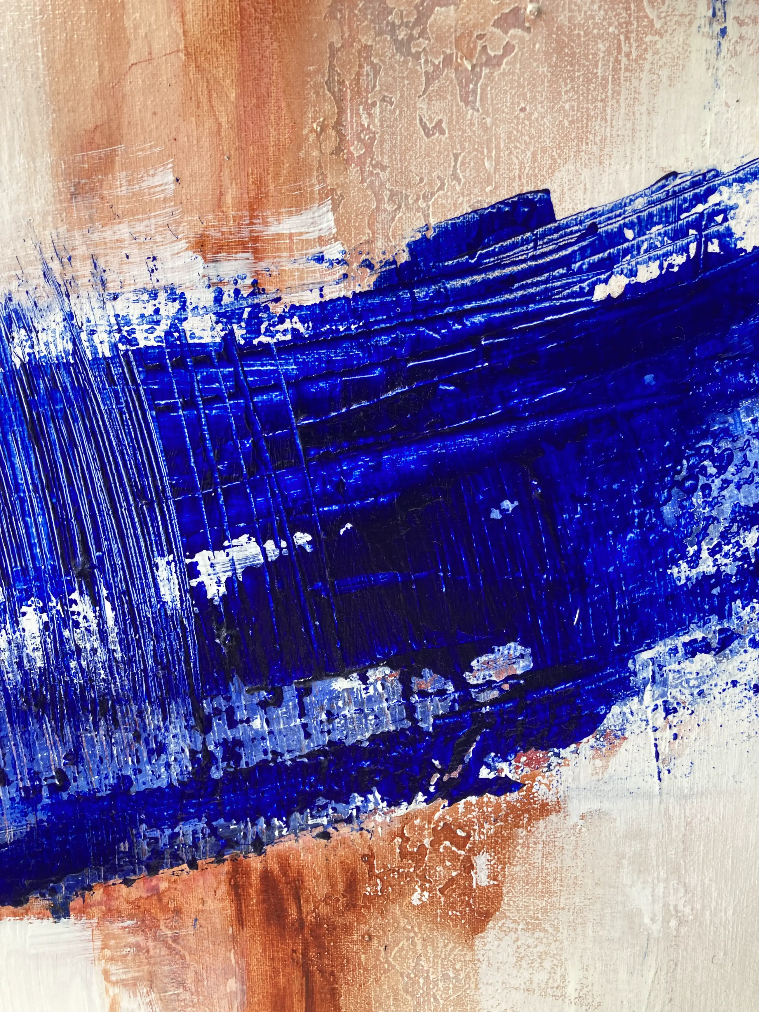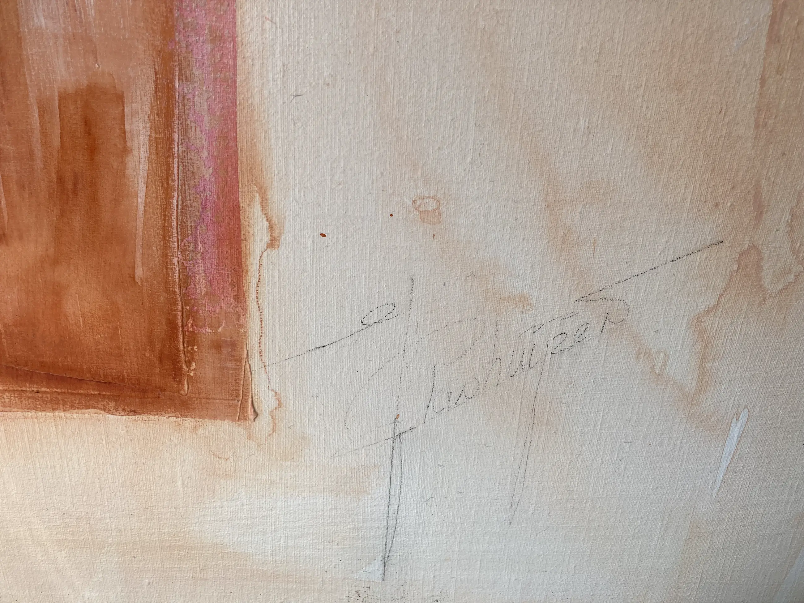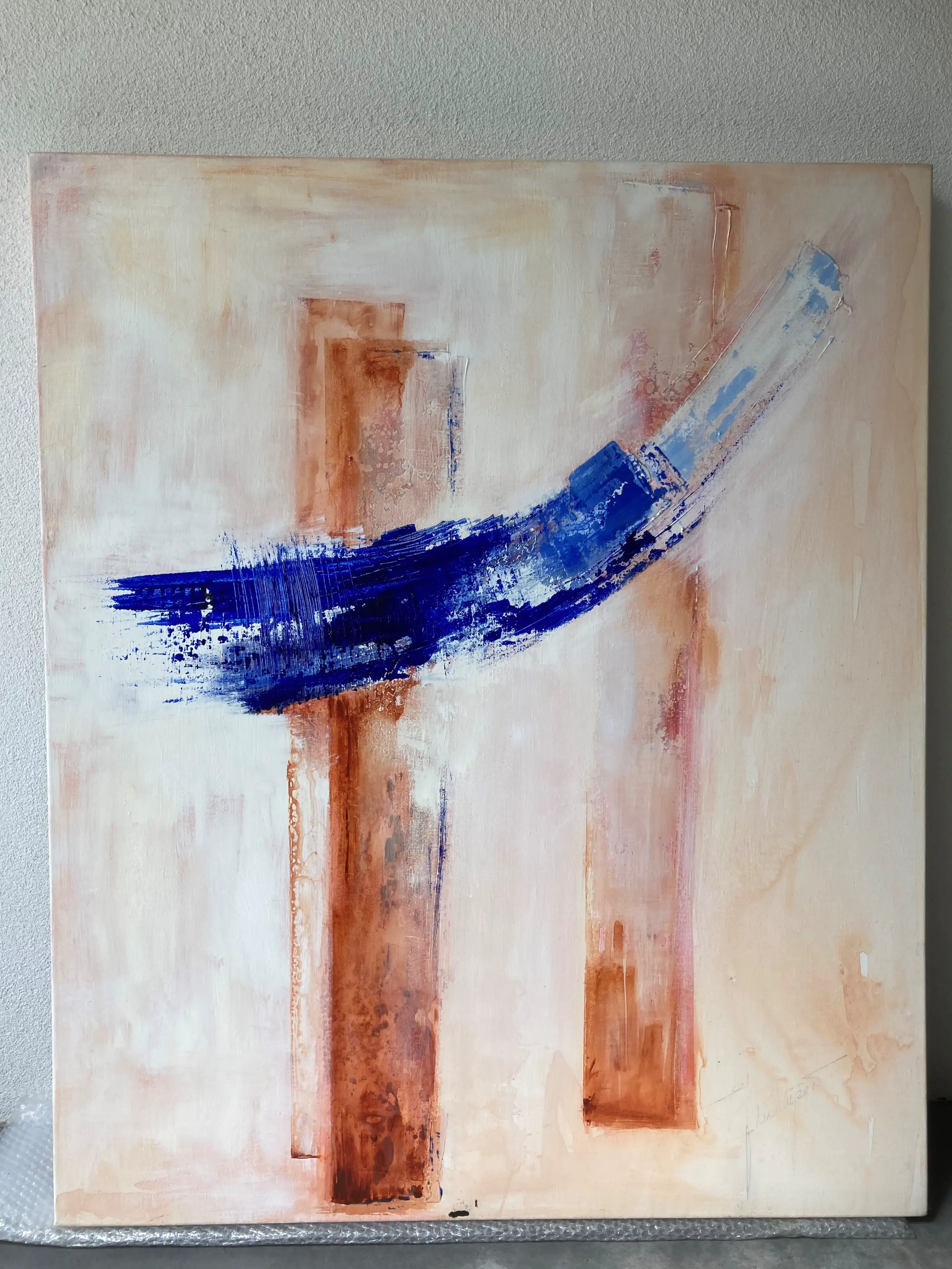Het schilderij is opgebouwd uit lagen; door de structuur draagt het de schoonheid van verval in zich. Het schilderij wordt onbeschadigd aangeboden.
