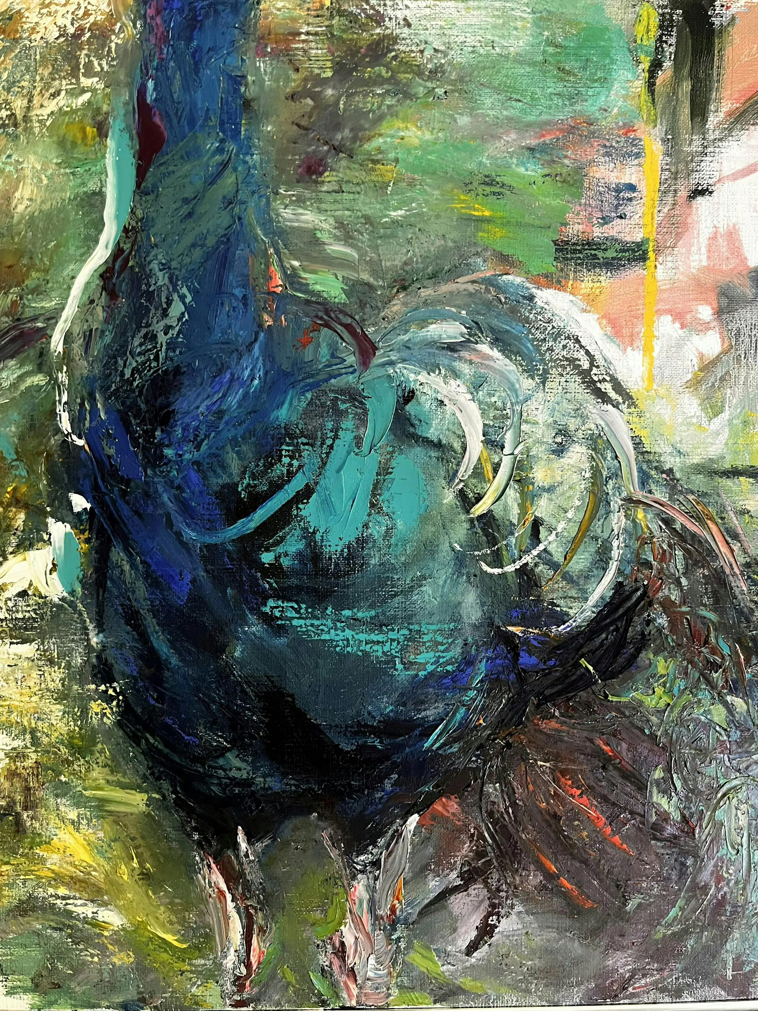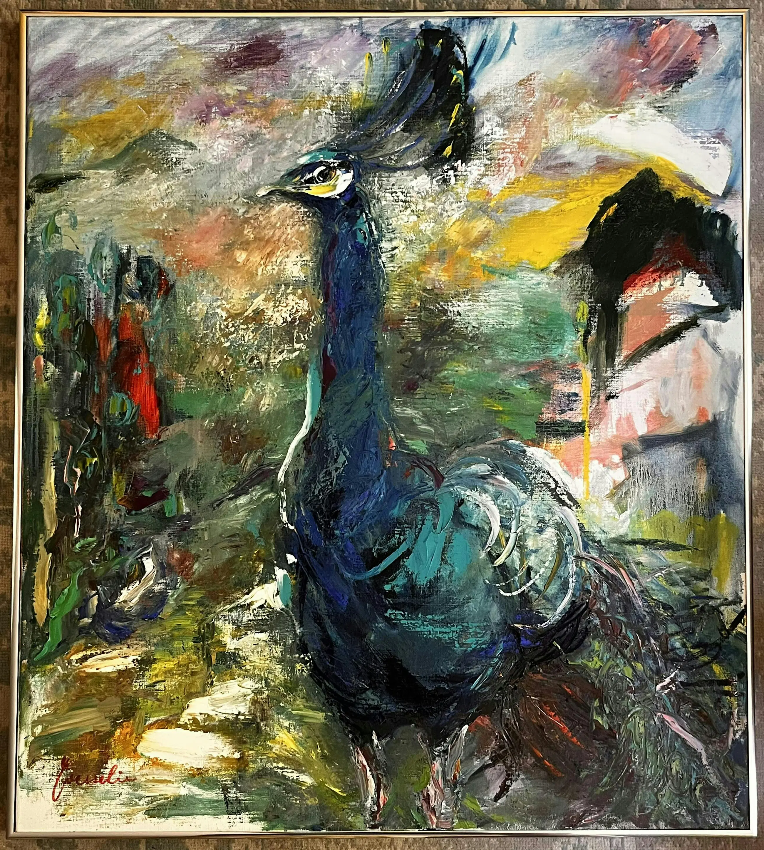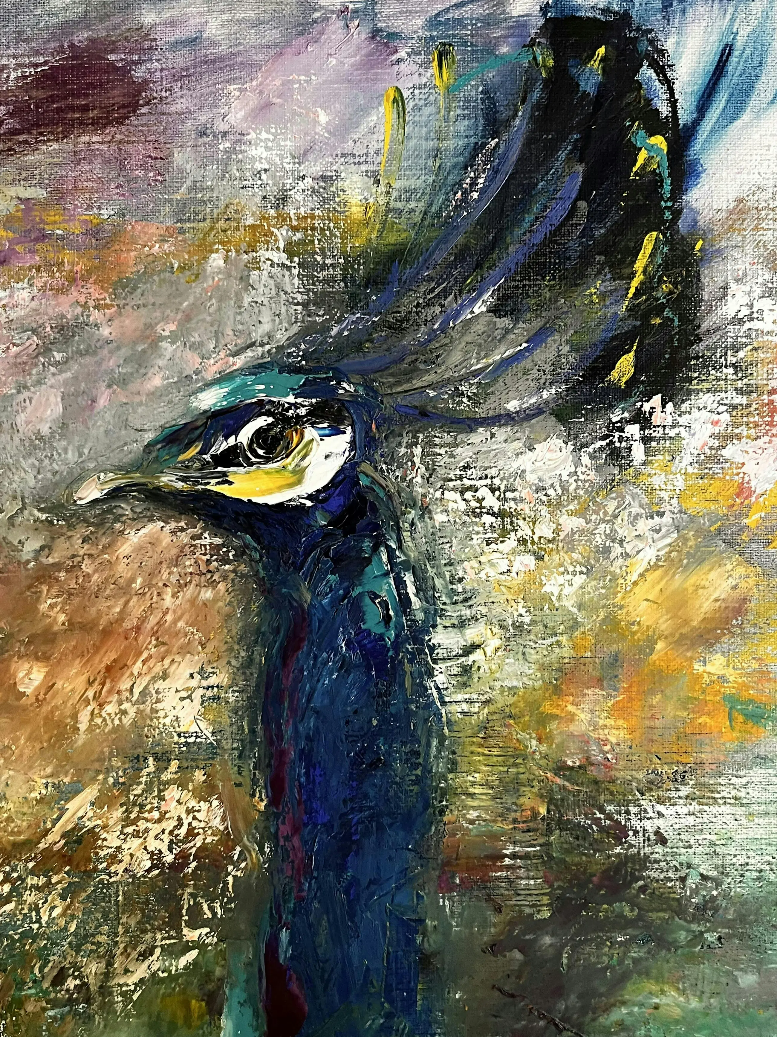 Dit werk van 90 x 80 cm is een ode aan kleur, beweging en symboliek – de pauw als teken van trots, schoonheid en hernieuwde energie. Ideaal voor wie op zoek is naar een blikvanger met karakter, geschikt voor zowel moderne interieurs als eclectische kunstcollecties.