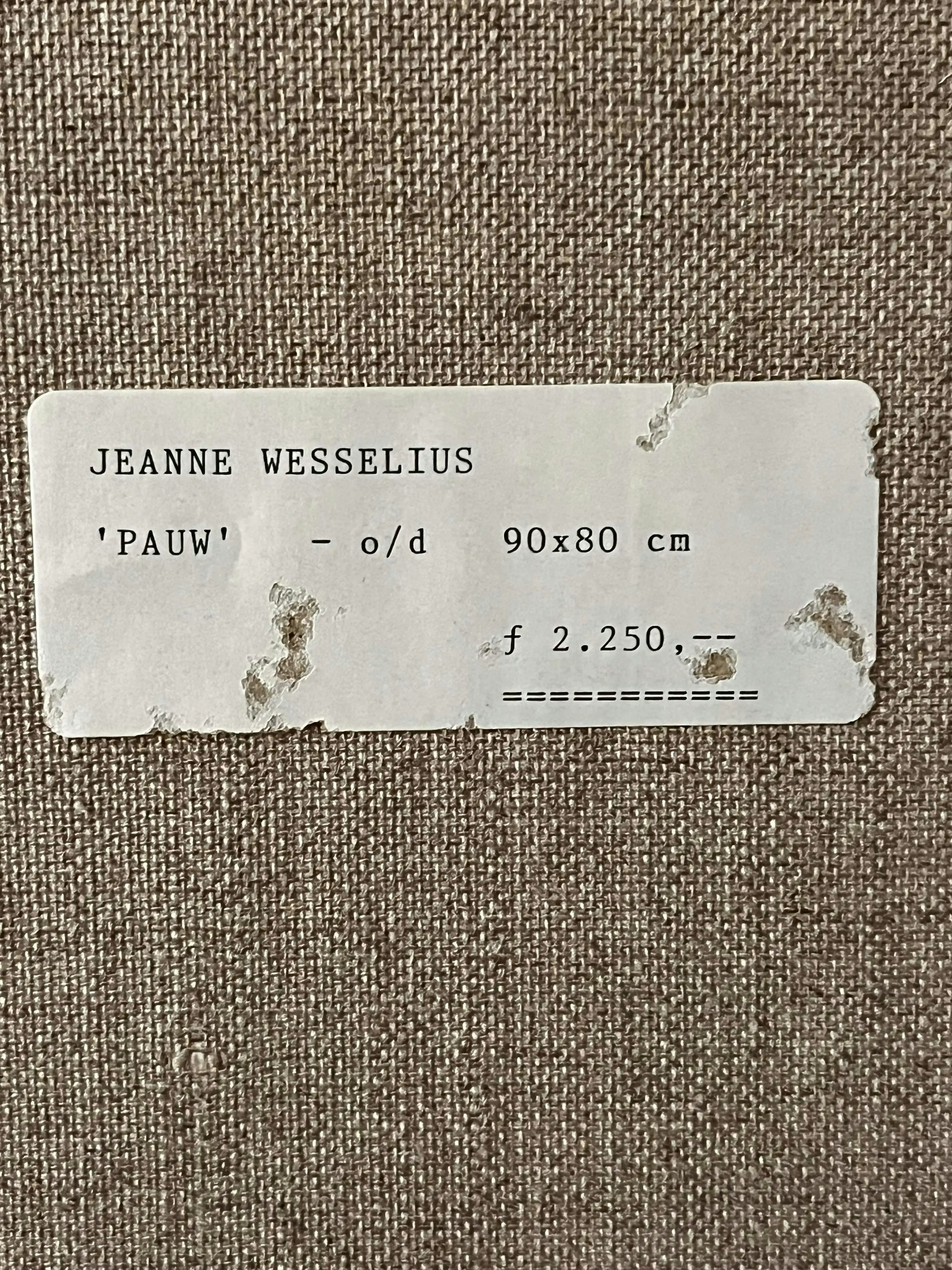 Laat je overweldigen door de expressieve kracht van deze originele schildering op doek van Jeanne Wesselius. Met krachtige penseelstreken en een levendig palet brengt zij een pauw tot leven die majestueus uit het doek lijkt te treden. De achtergrond, een abstract kleurenspel van warme en koele tinten, laat de verenpracht van de vogel nog intenser spreken.