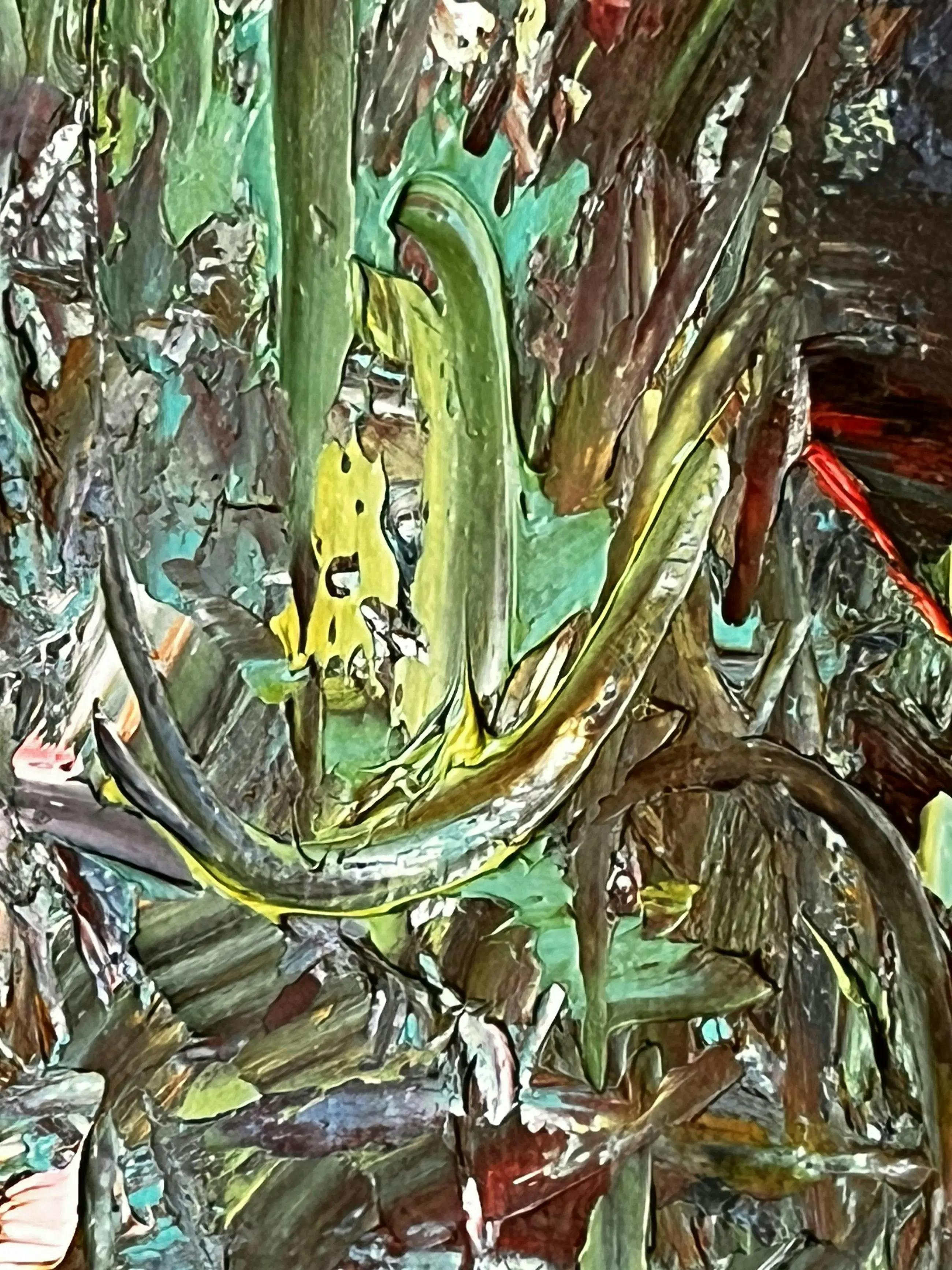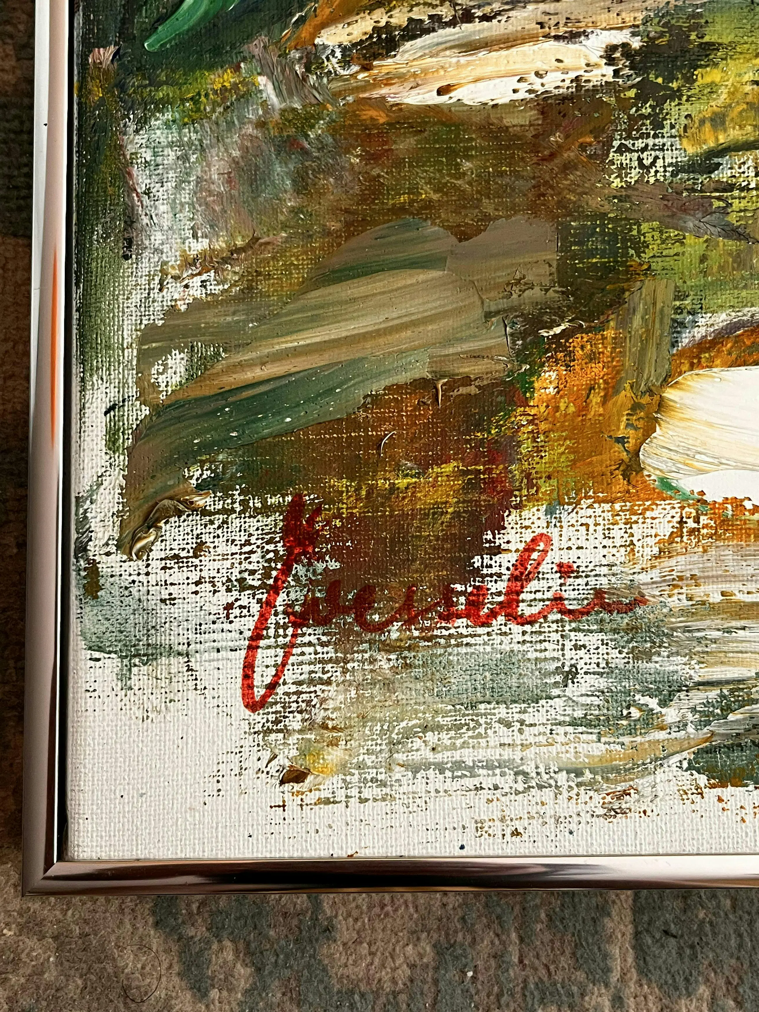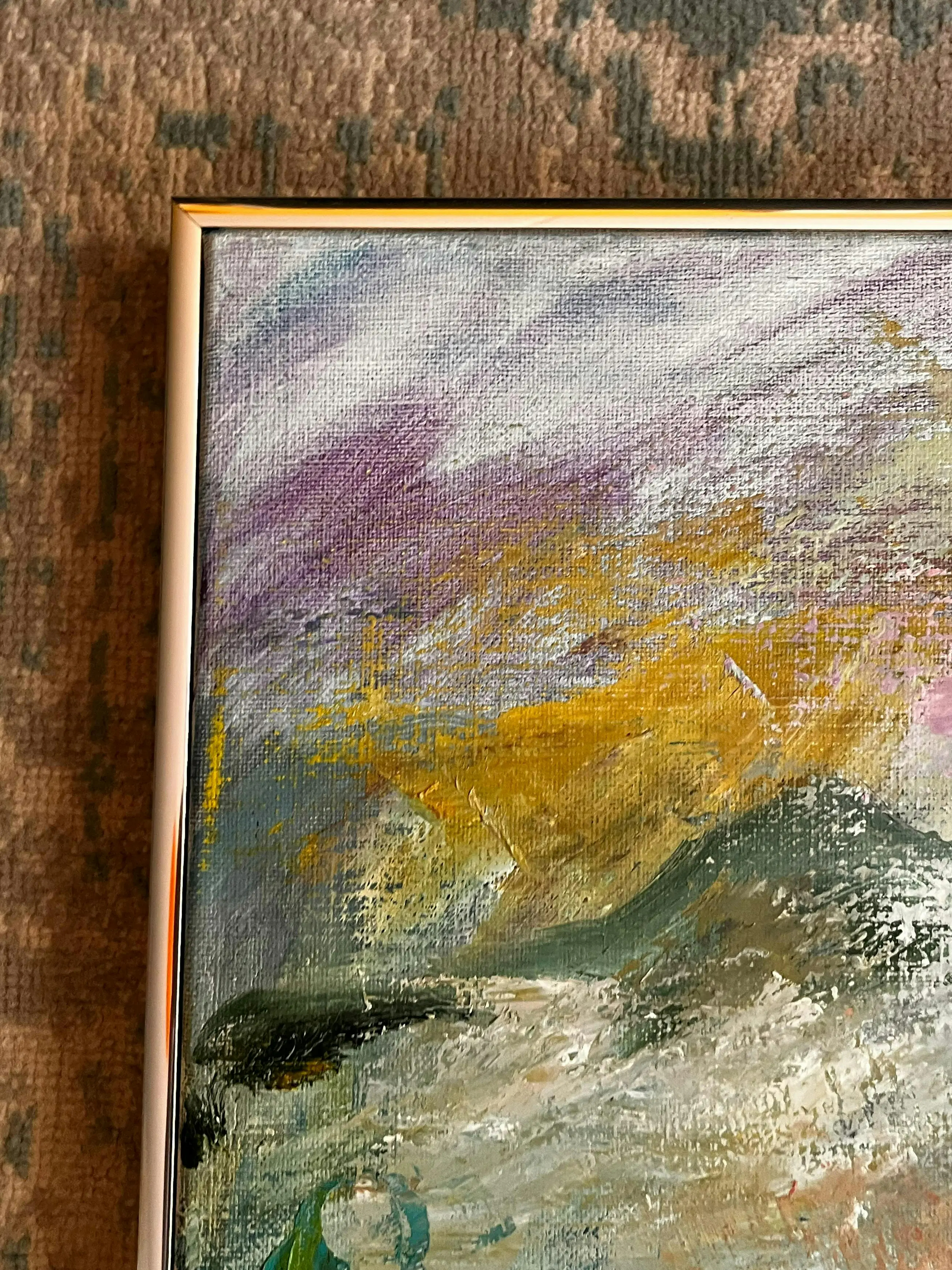 PS de laatste foto is slechts bedoeld als impressie om u een beetje een beeld te geven hoe het werk bij u thuis zou kunnen hangen. Het is geen waarheidsgetrouw beeld van het schilderij in deze impressie. Dit beeld is door AI gegenereerd.