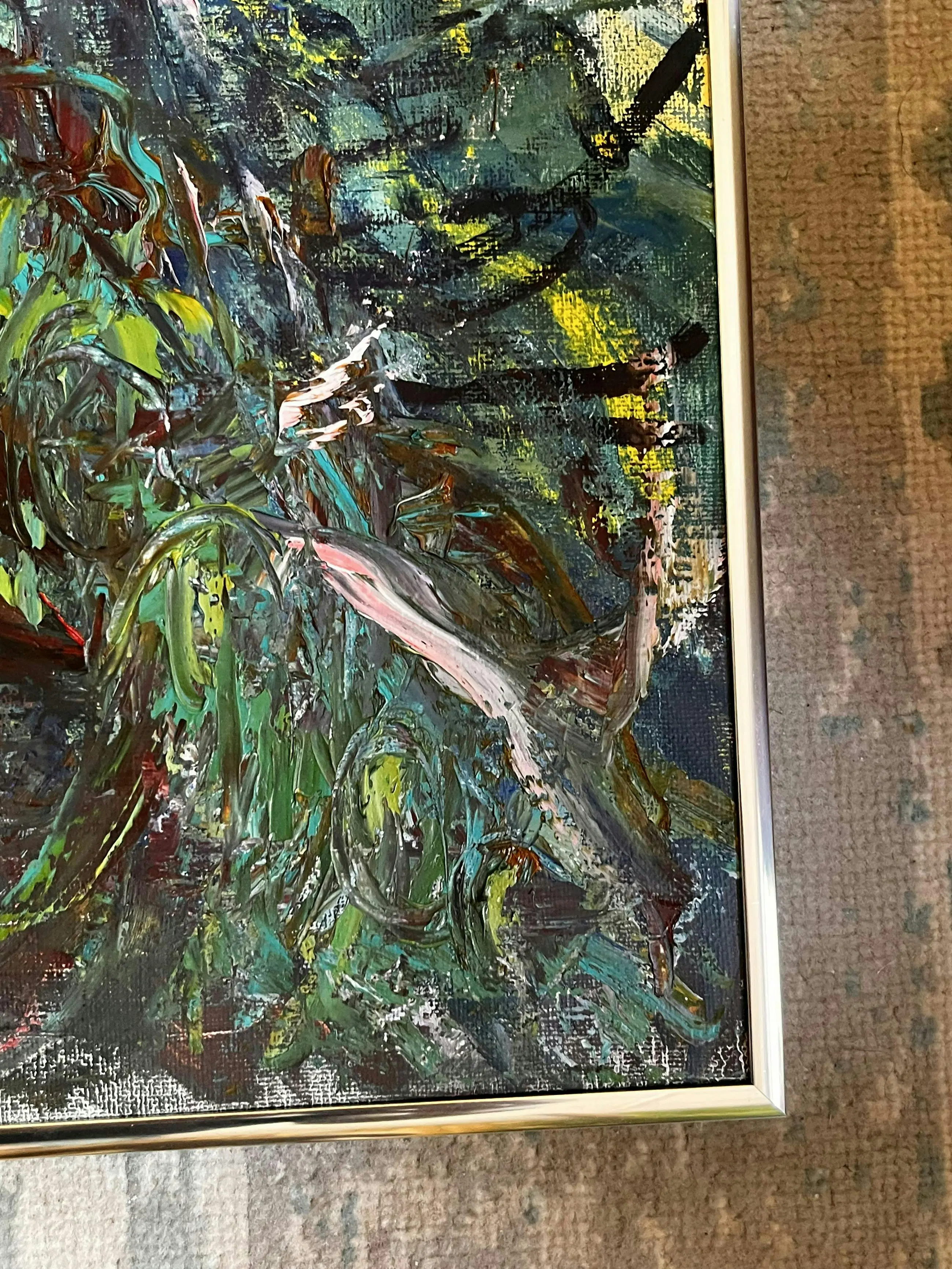 Techniek: Olieverf op doek Afmetingen: 90 x 80 cm Ingelijst in een aluminium lijst direct om het doek heen. Herkomst: Derksen Veilinghuis Signatuur: L.O.