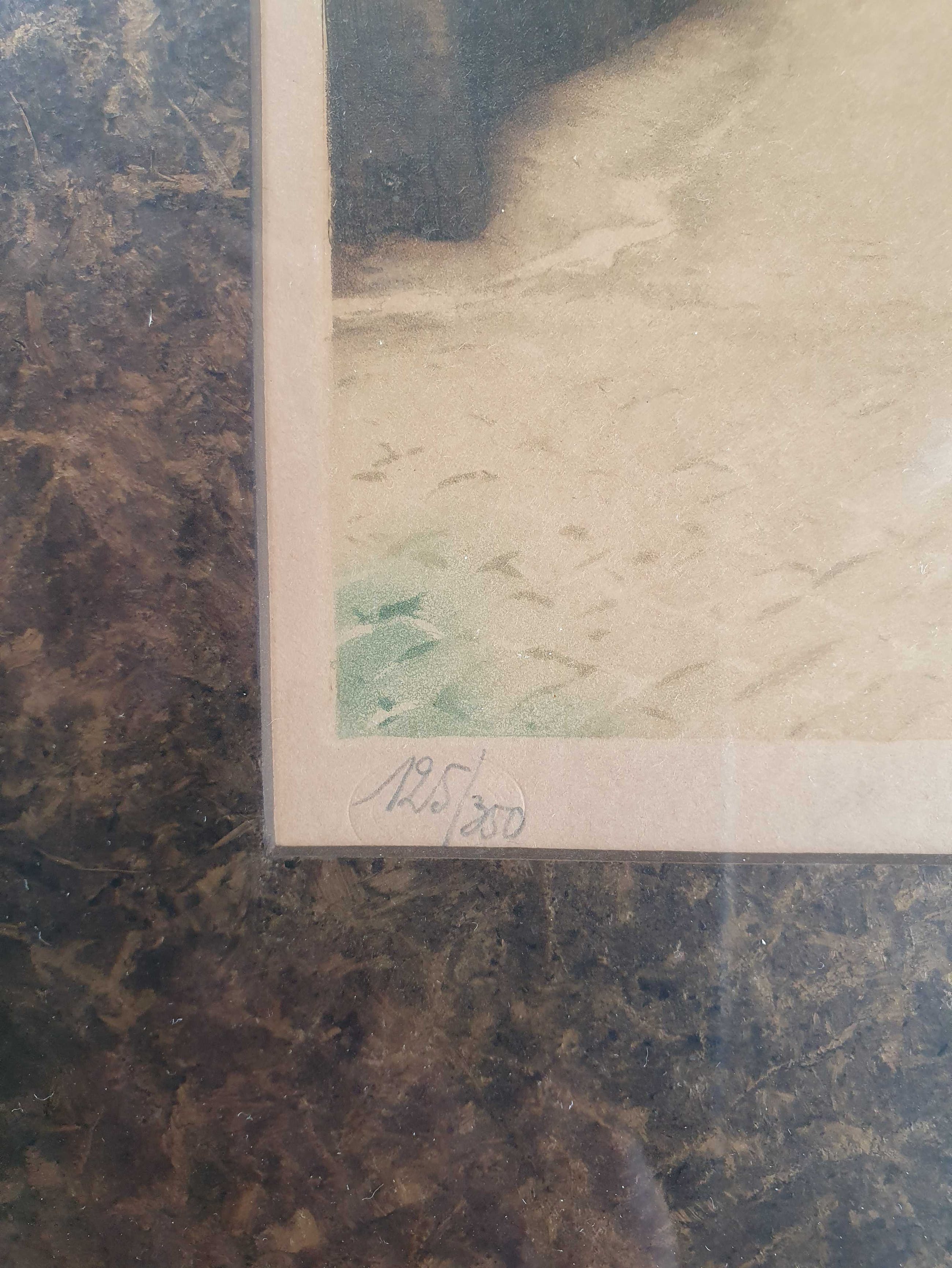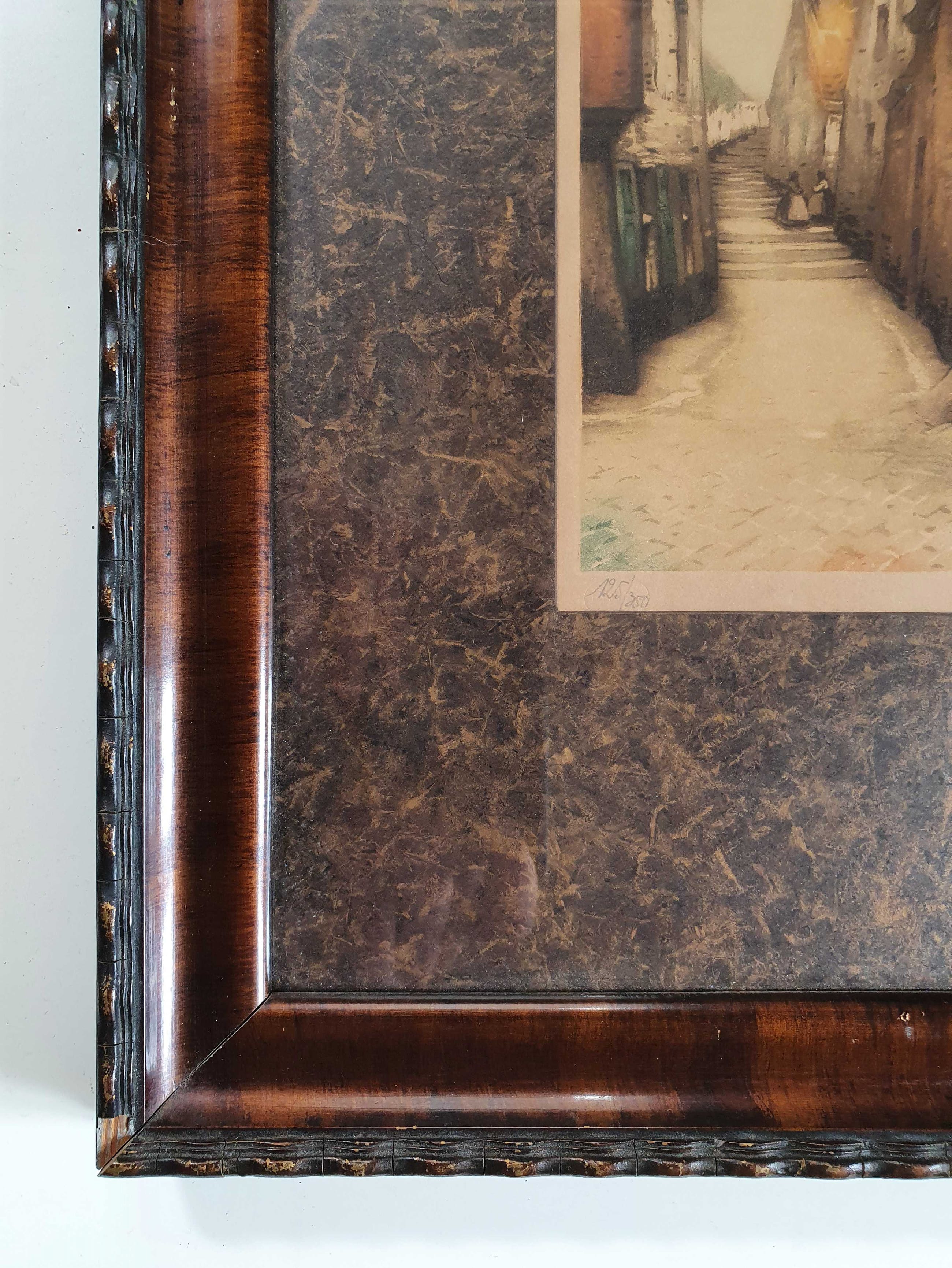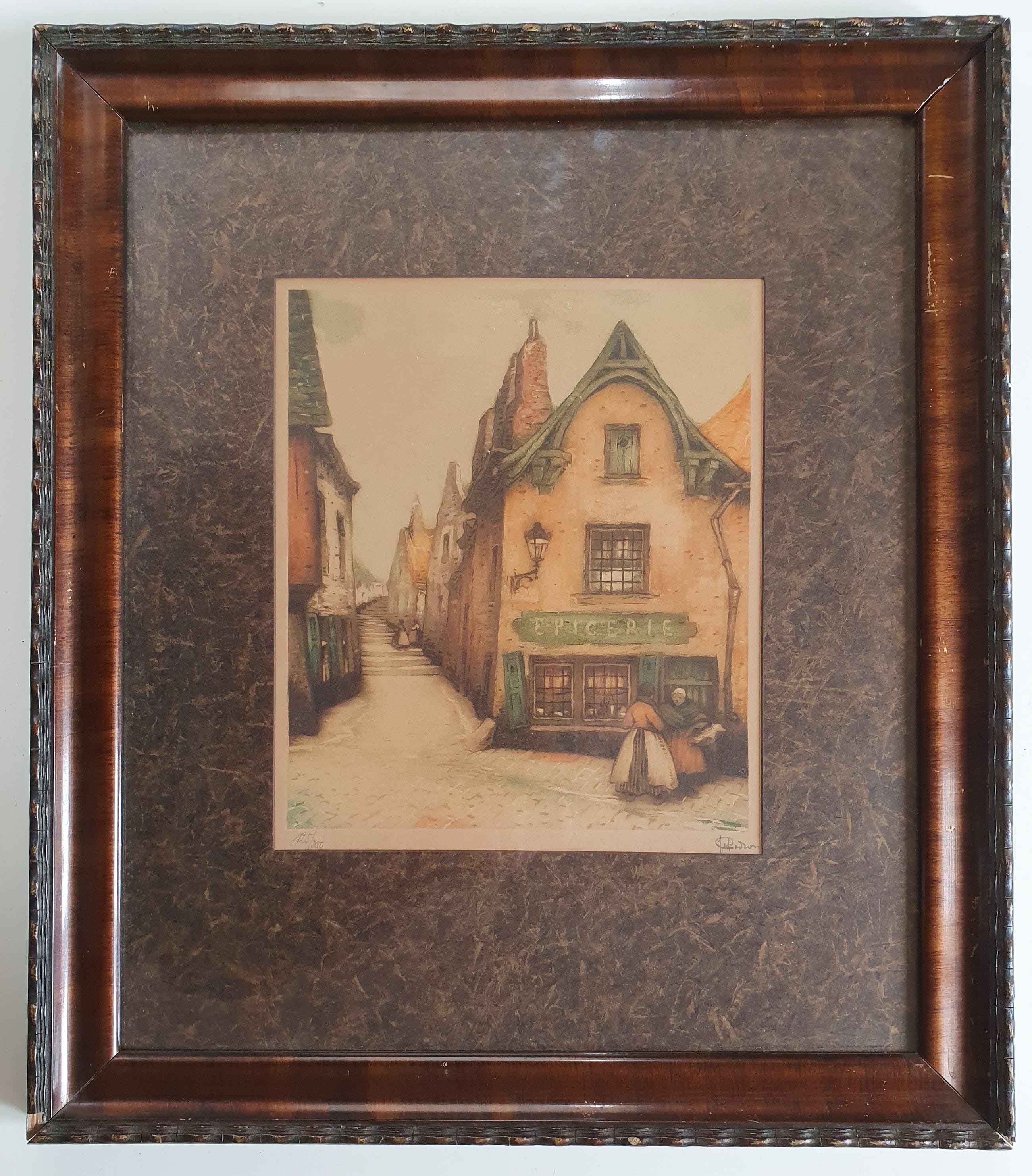 Sfeervolle kleurenets van een Brussels straatbeeld uit het begin van de 20e eeuw, met enkele vrouwen voor een kruidenierszaak, van de hand van Jef Codron. Gevat achter oud glas in een goudgemarmerd passe-partout in een luxe contemporaine geschulpte coromandelhouten lijst. Genummerd (125/350) en gesigneerd in potlood.