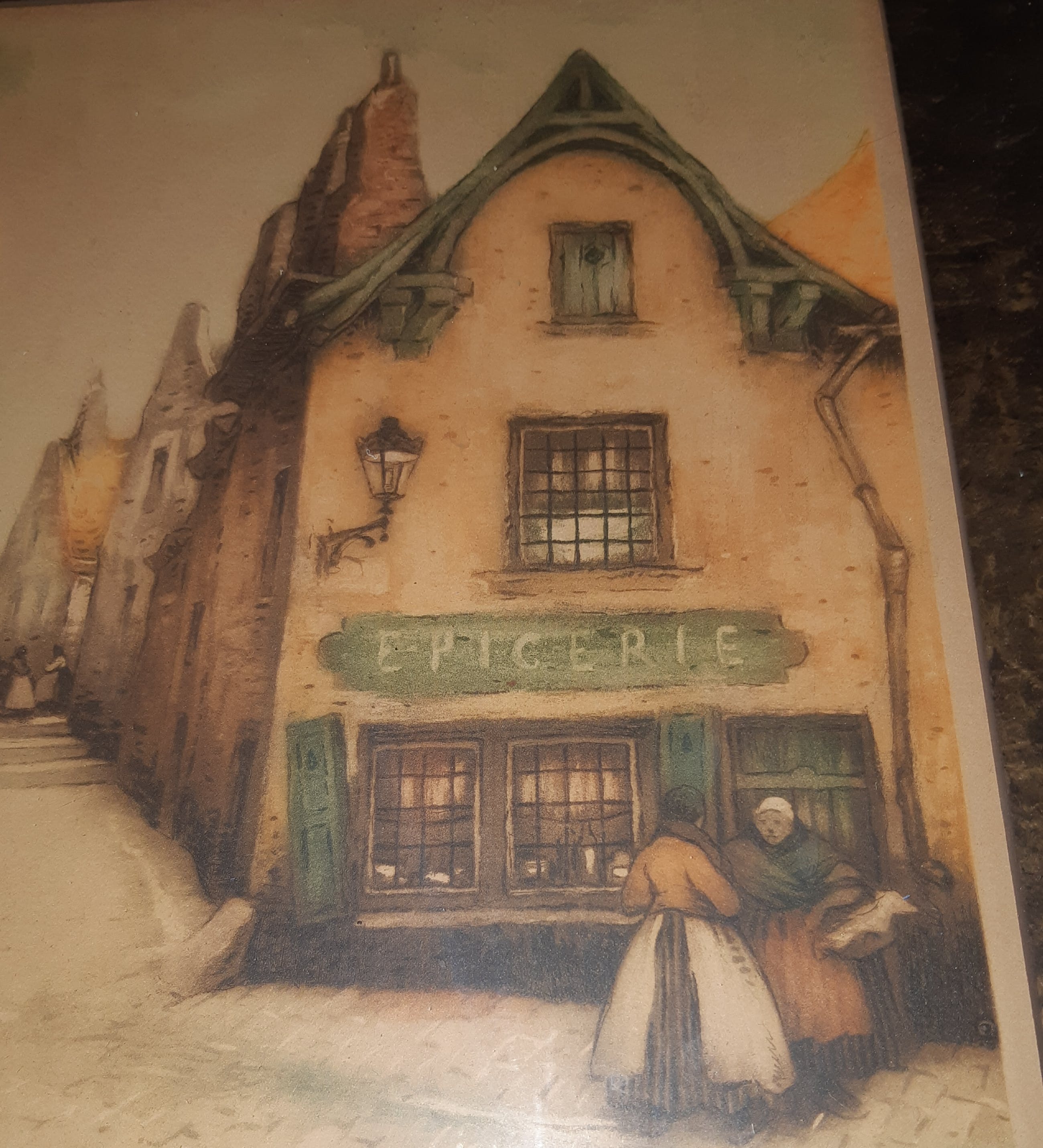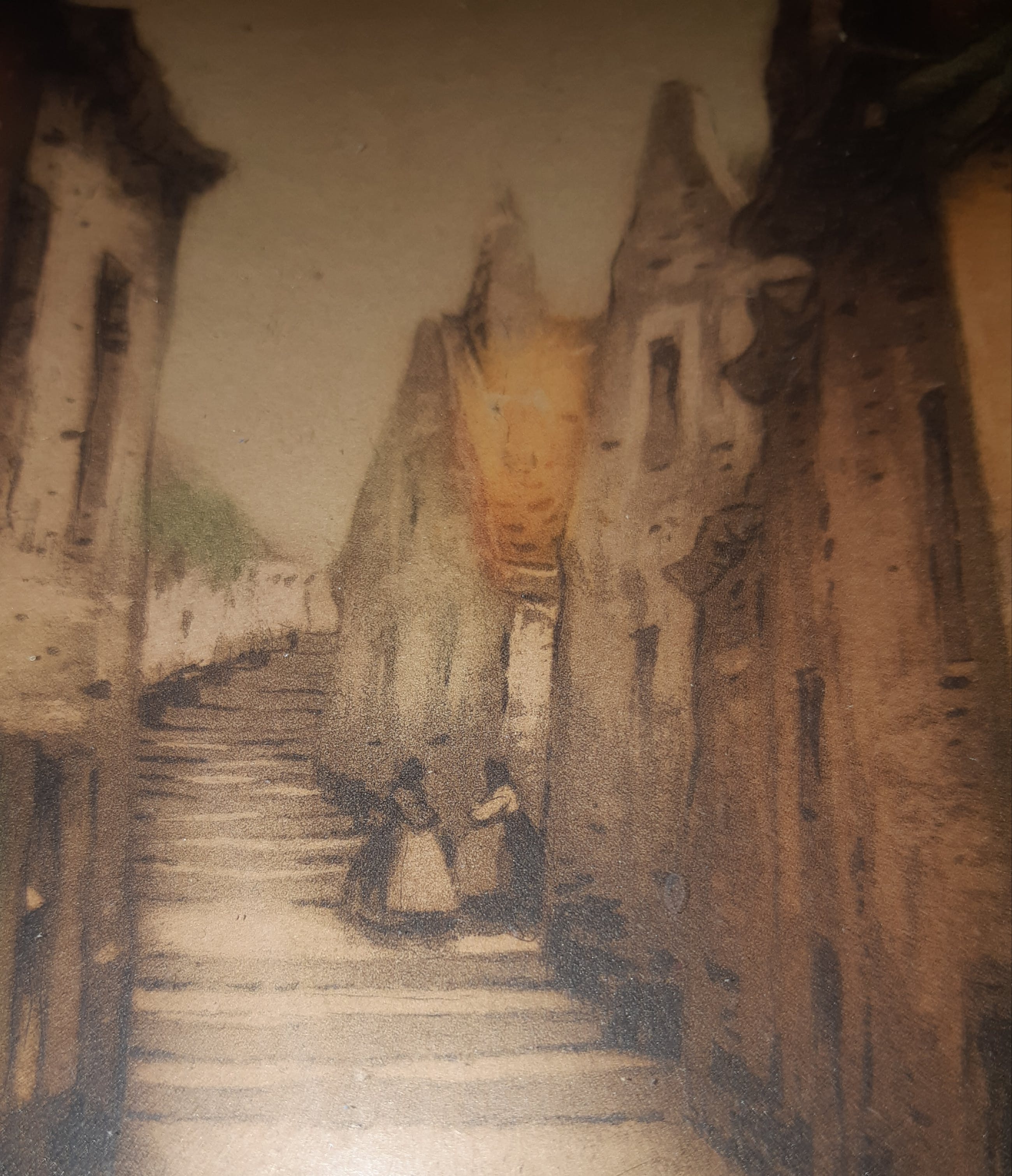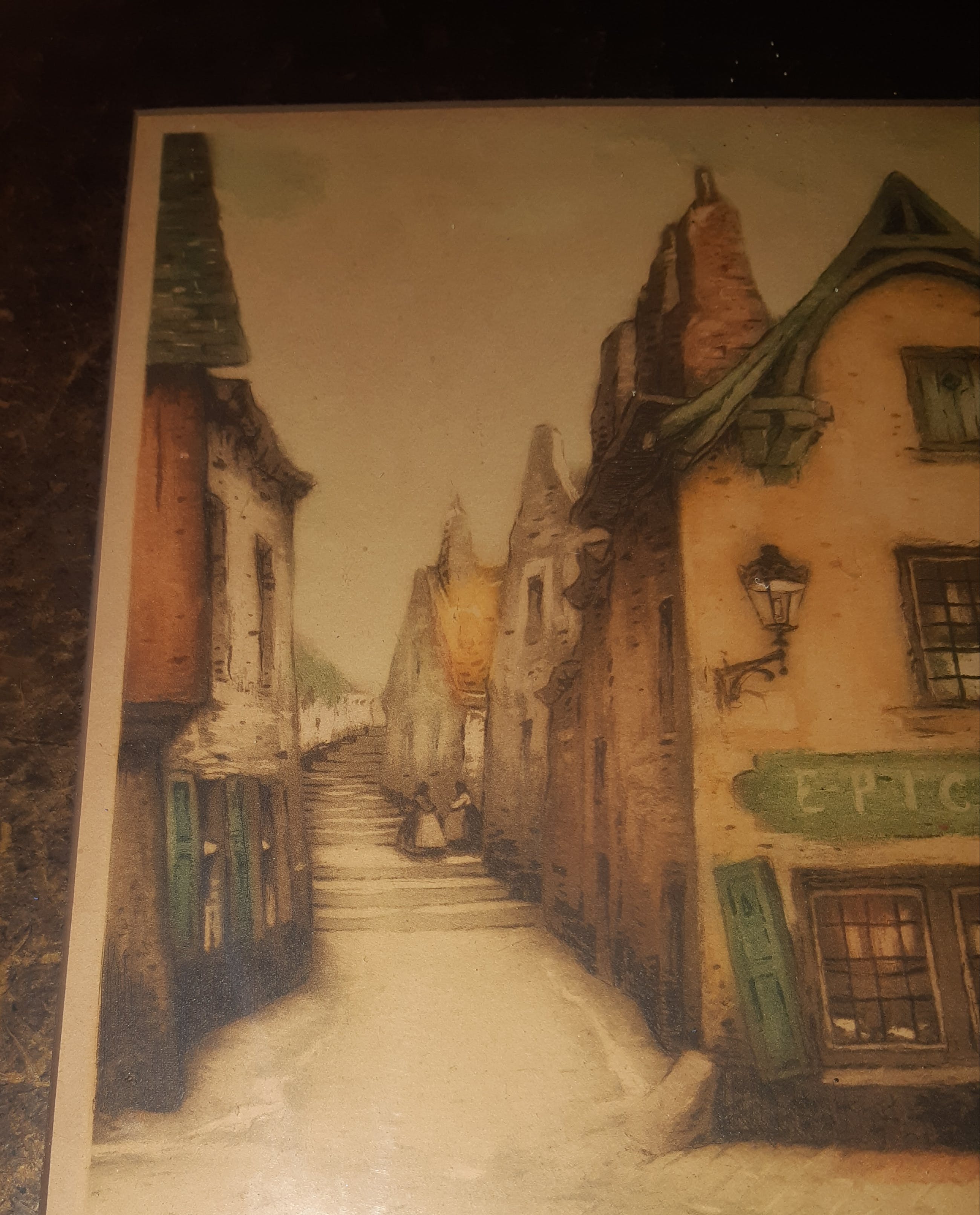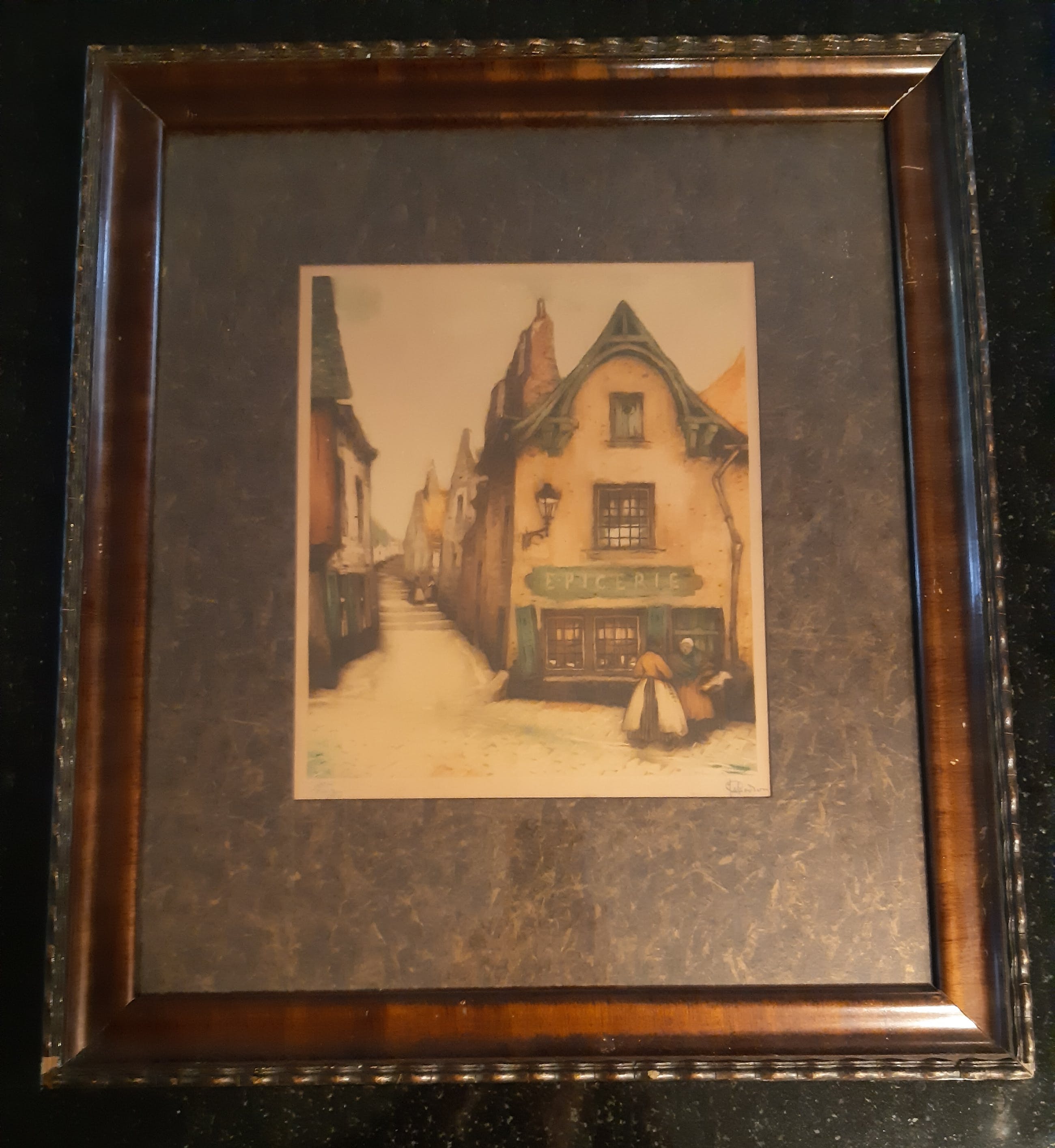 Mooie, gekleurde ets van Brussel uit het begin van de 20e eeuw, gemaakt door Jef Codron. Met fraaie lijst achter glas.