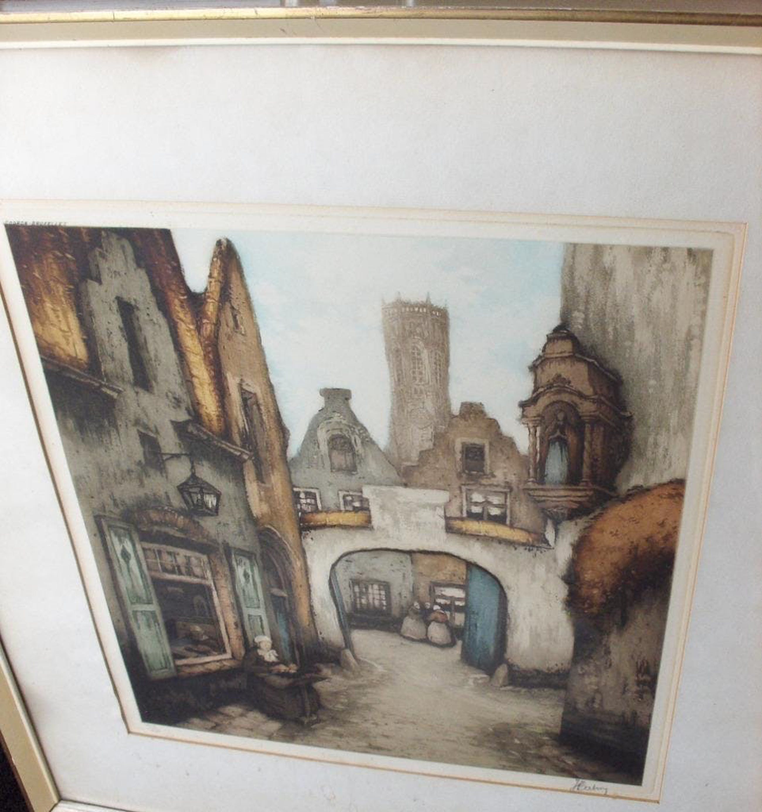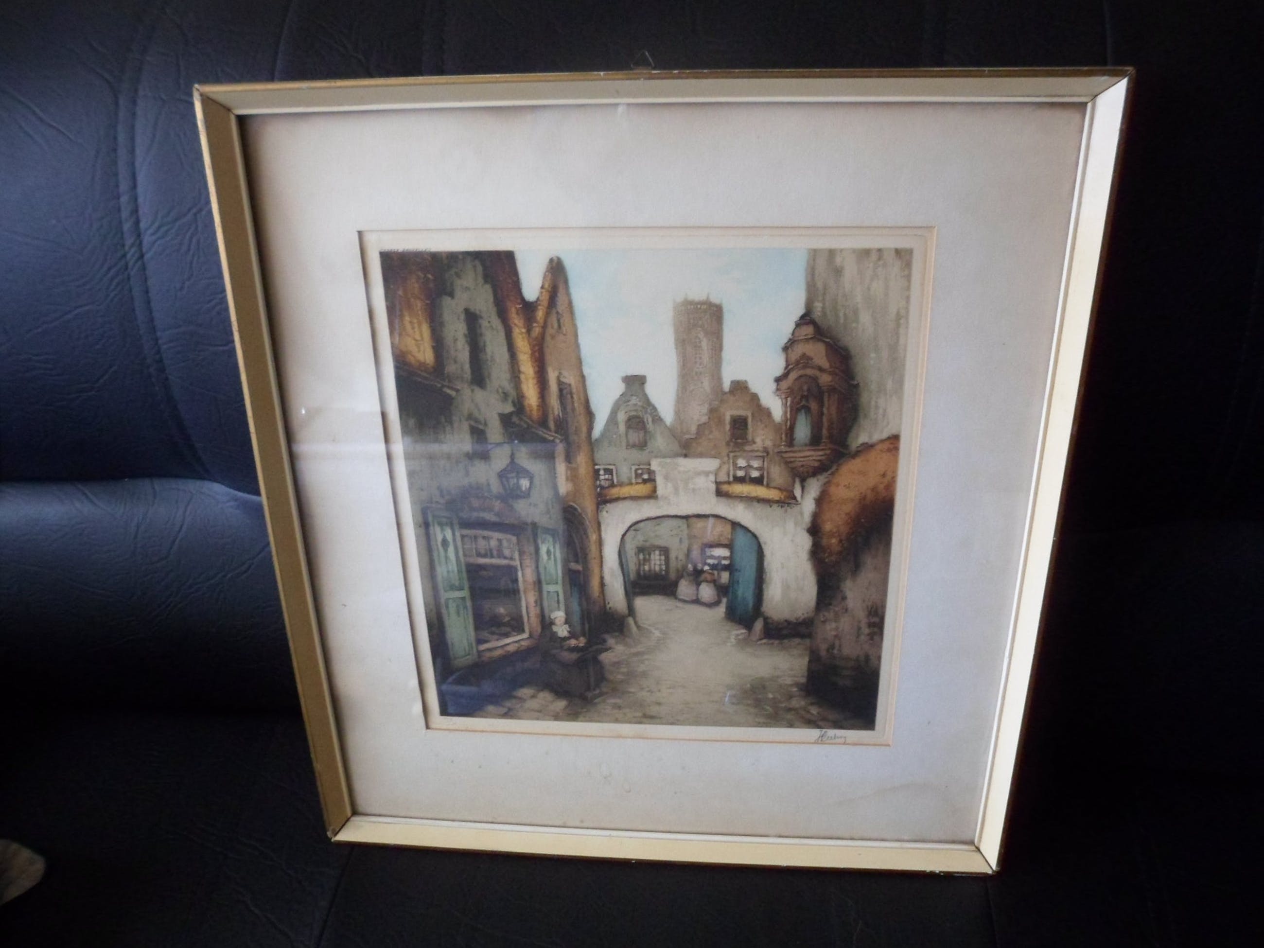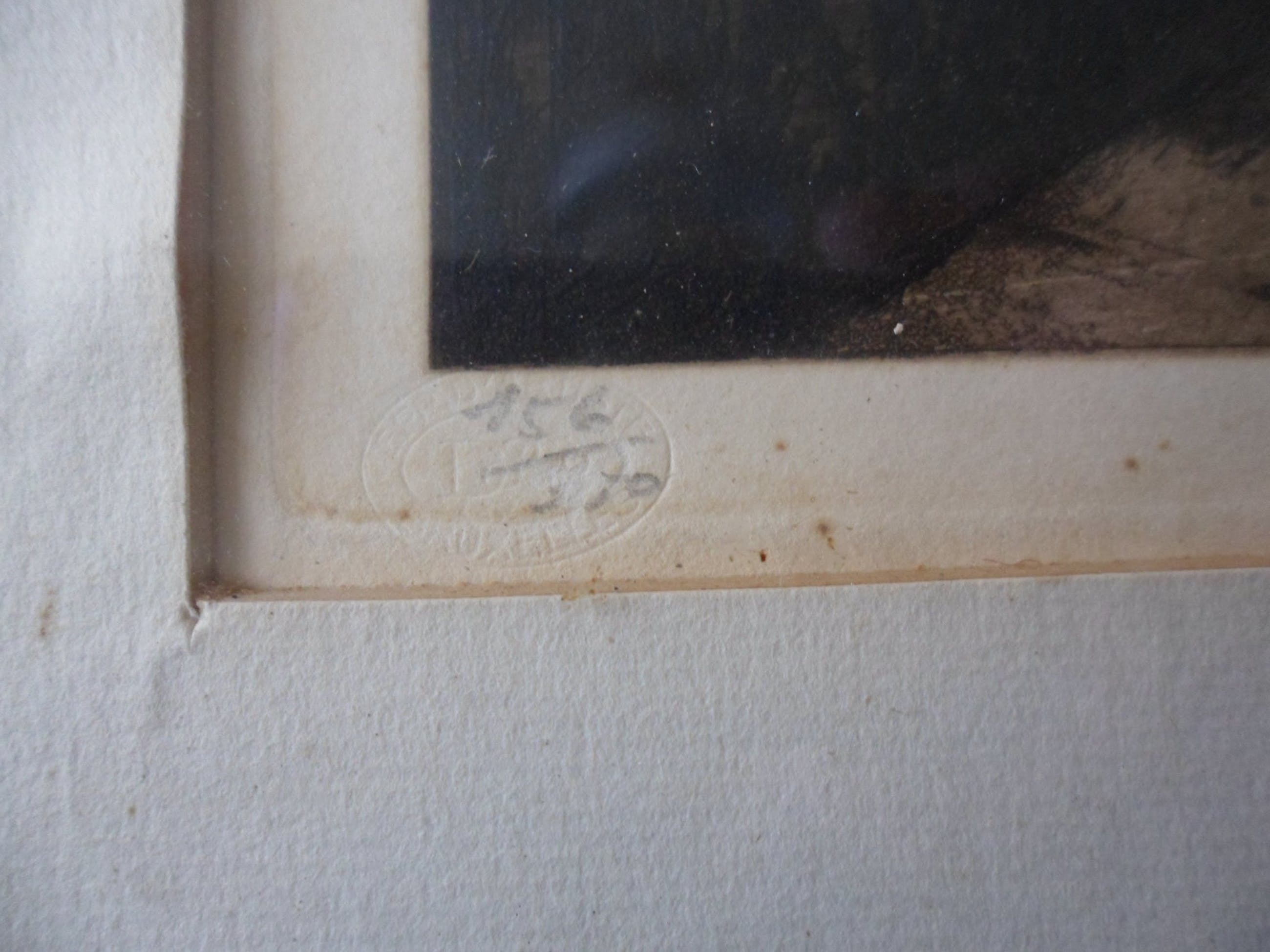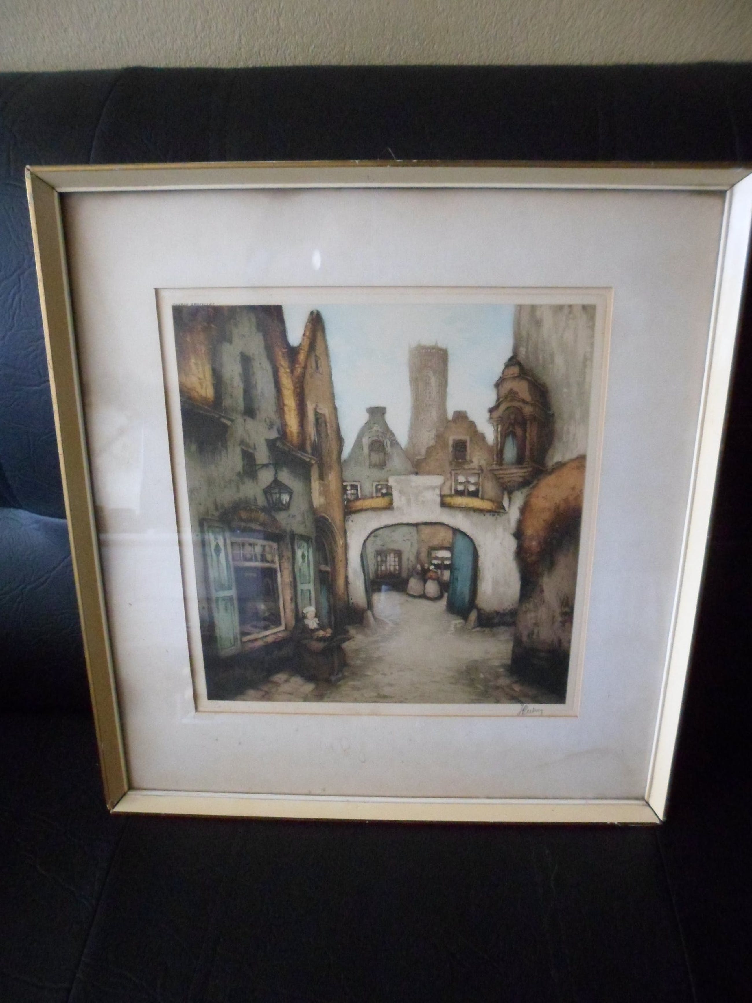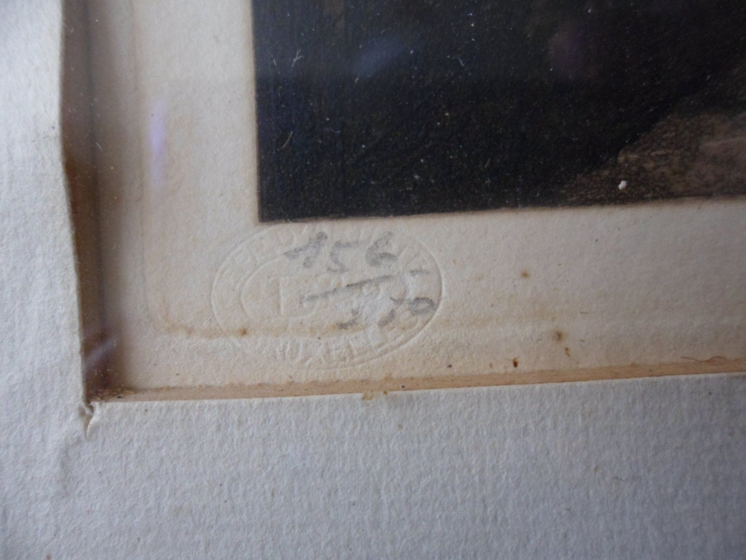 | De kleuren ets is goed, in de passe patout zit wat watervlekken niet in de ets. Het geheel heeft wat ouderdom verschijnsels. Eigenlijk verdient de kleuren ets een nieuwen lijst met passe patout. Daarom krijgt u de lijst en passe patout er gratis bij. En is daarom de start prijs zo laag. Maar de ets is wel mooi. | |||