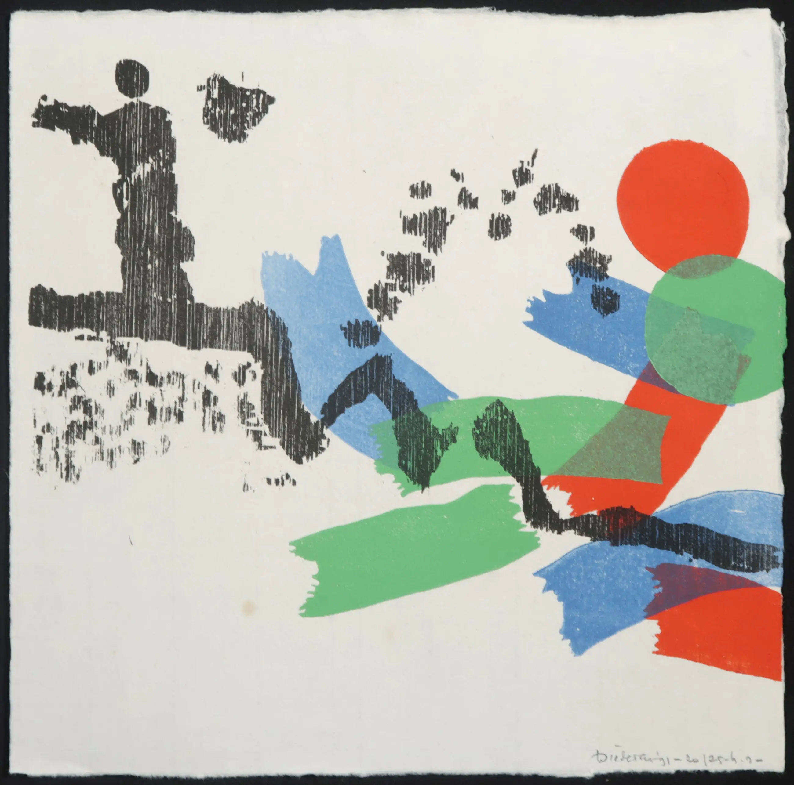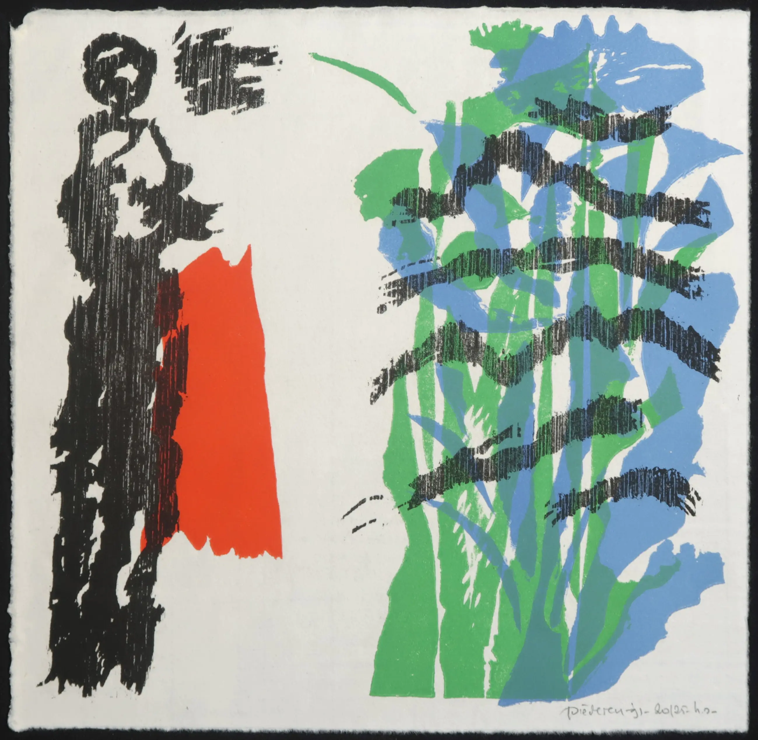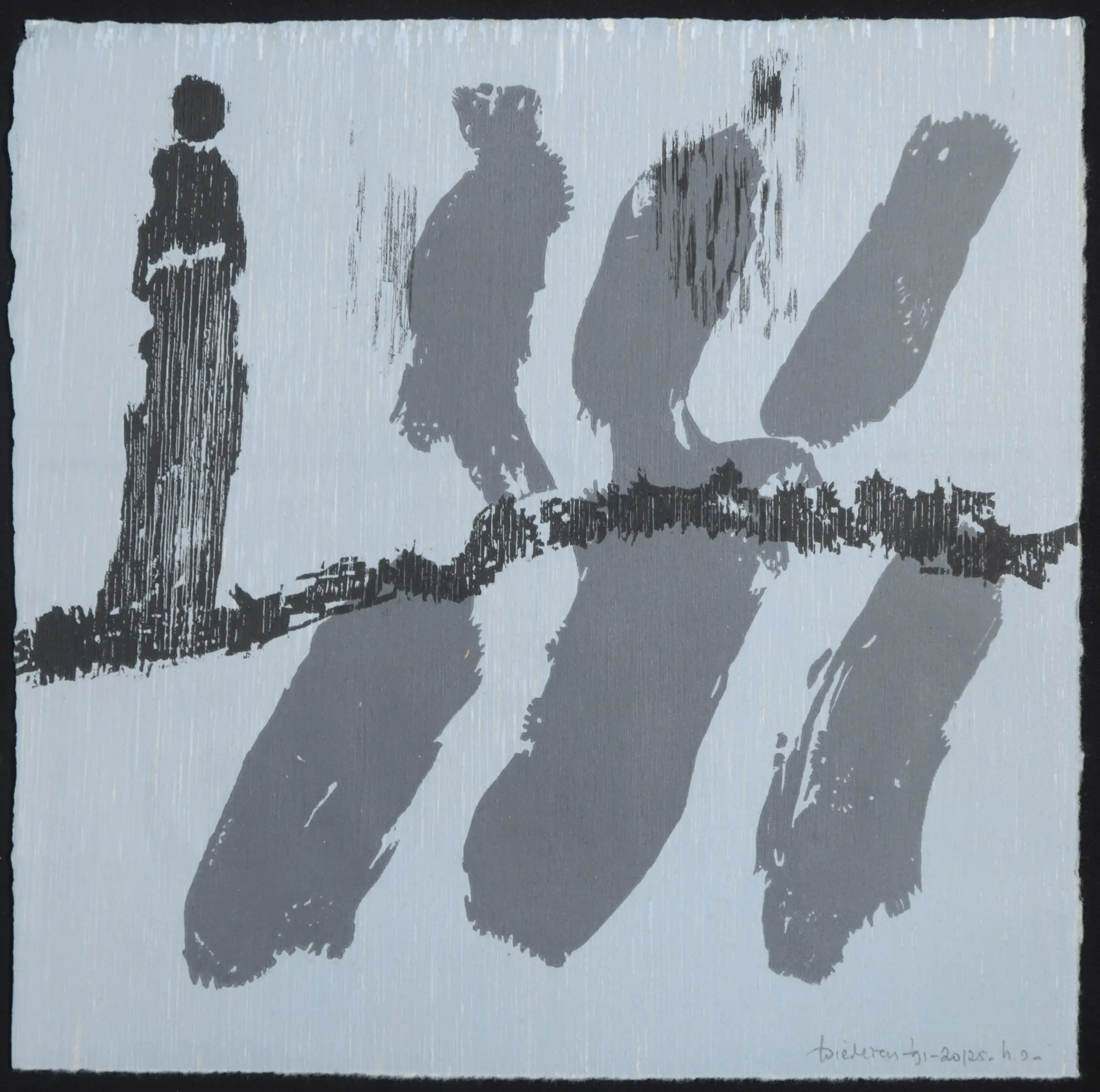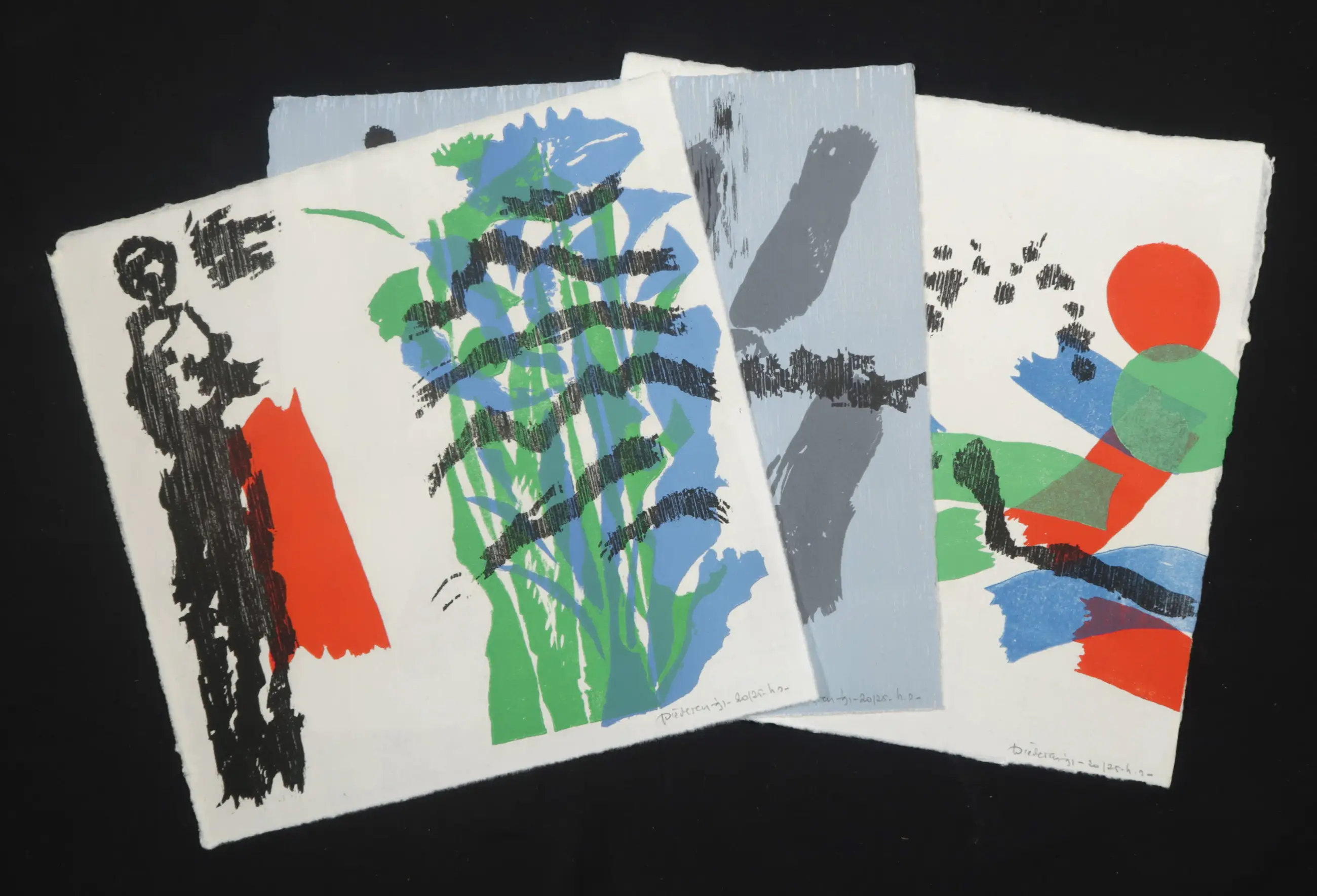 | Een van de drie houtsnedes/lino's bevat enkele oxidatievlekjes | |||