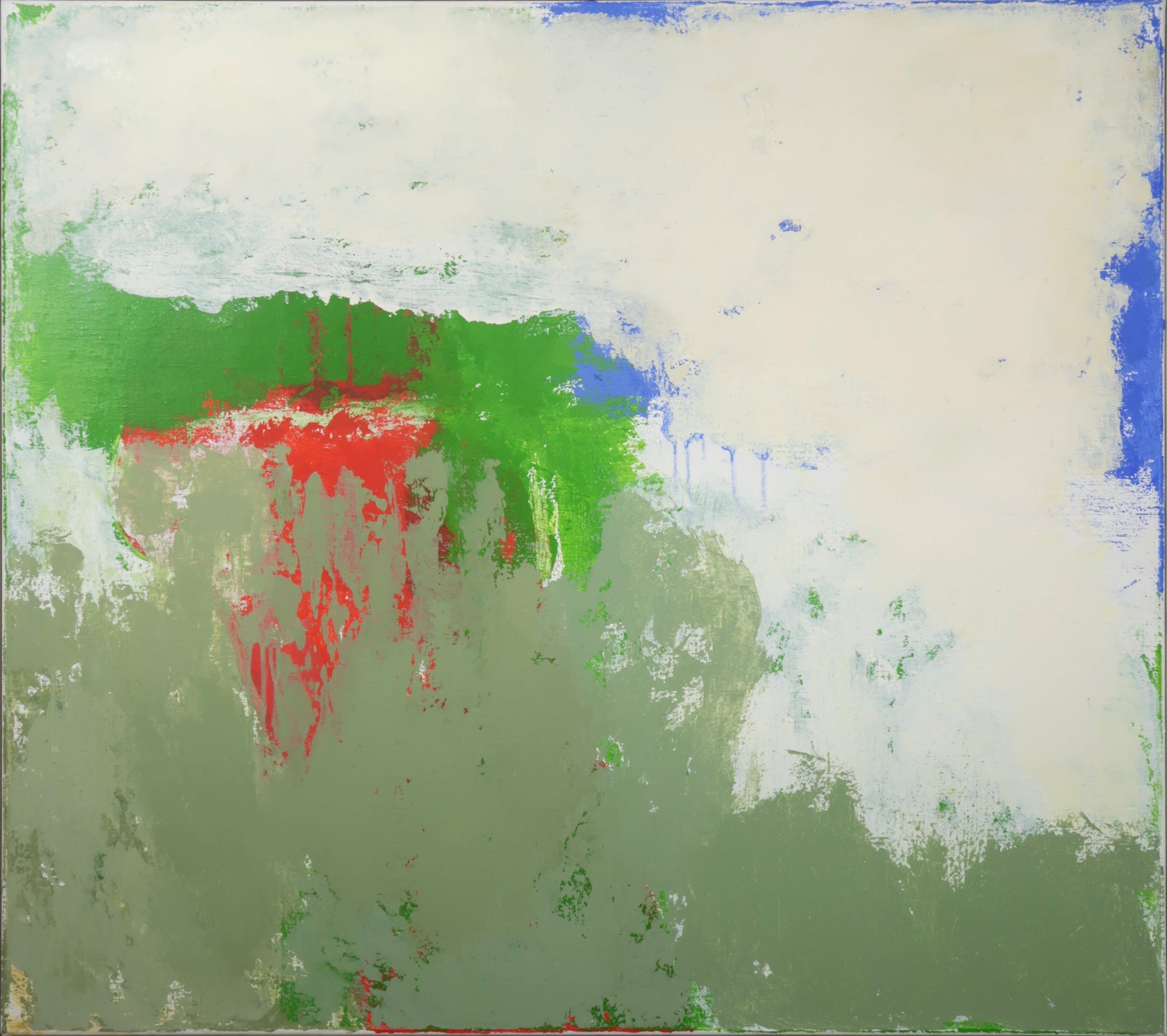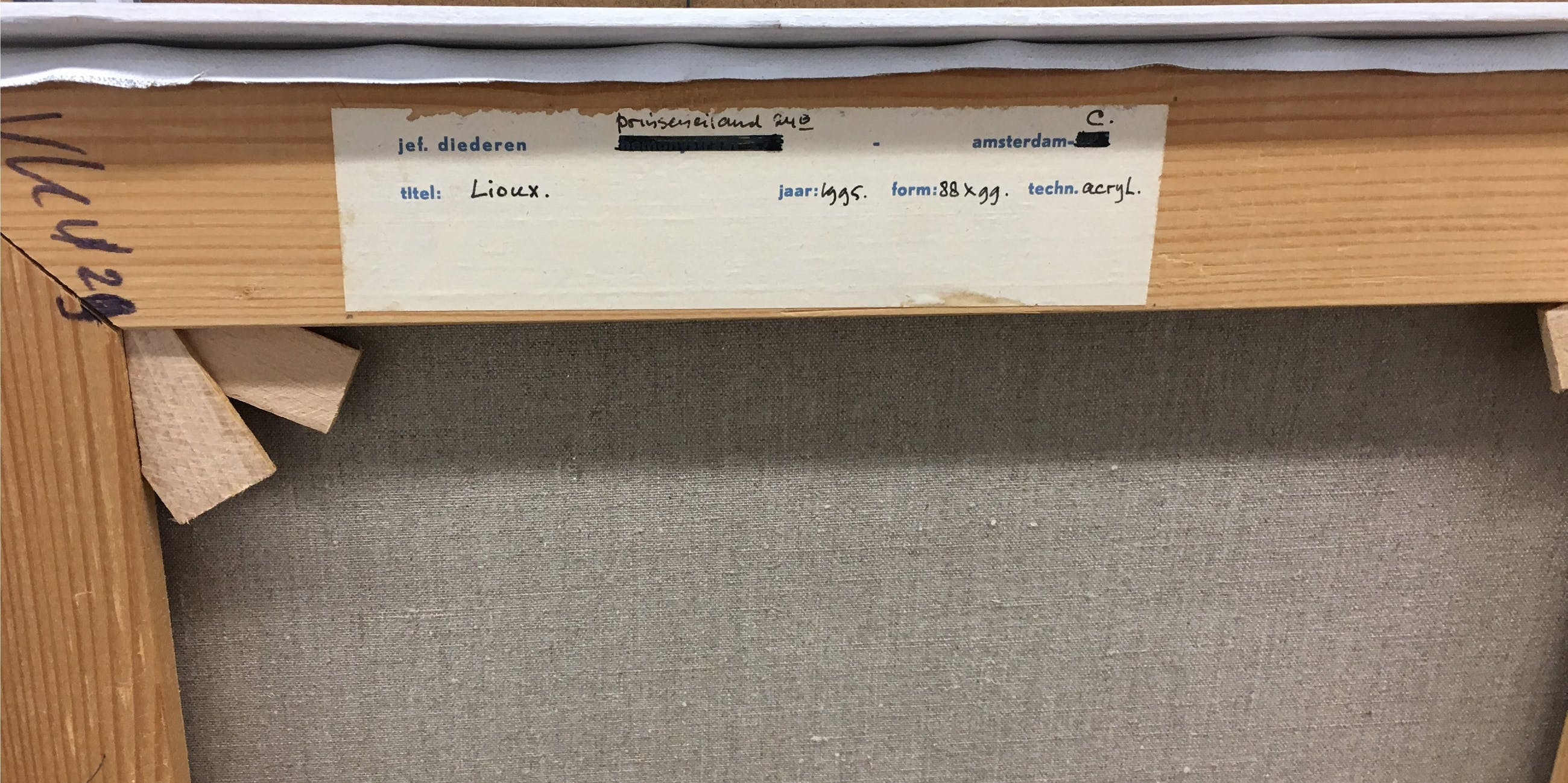 | De witte houten baklijst zit rondom een beetje los. Aan de omderzijde is de lijst beschadigd. In het midden bovenaan lijkt een stukje verf te ontbreken. Aan de linkerzijde in de hoek zitten enkele gele vlekken. Het is niet duidelijk of deze vlekken bij het werk horen of niet. | |
