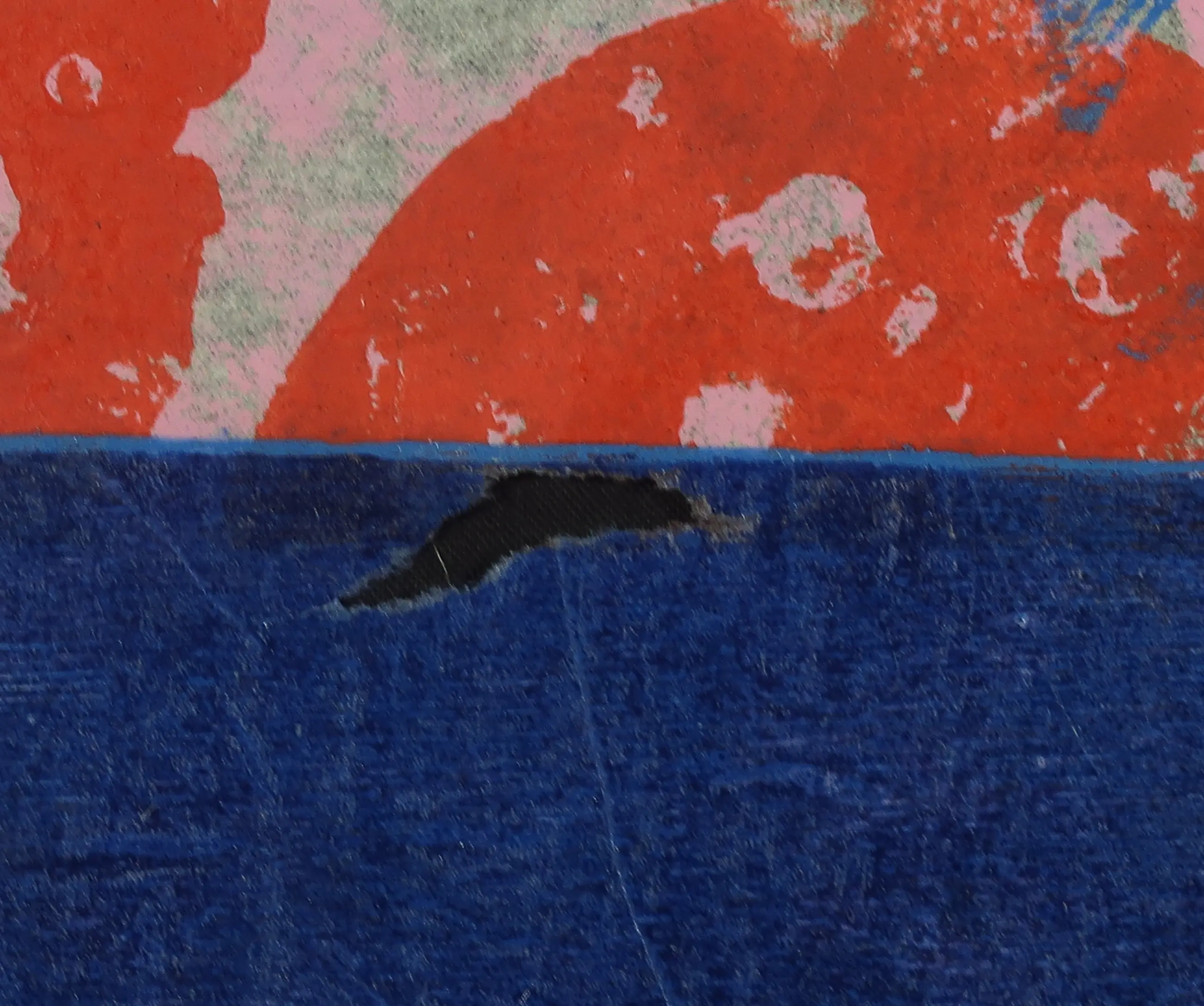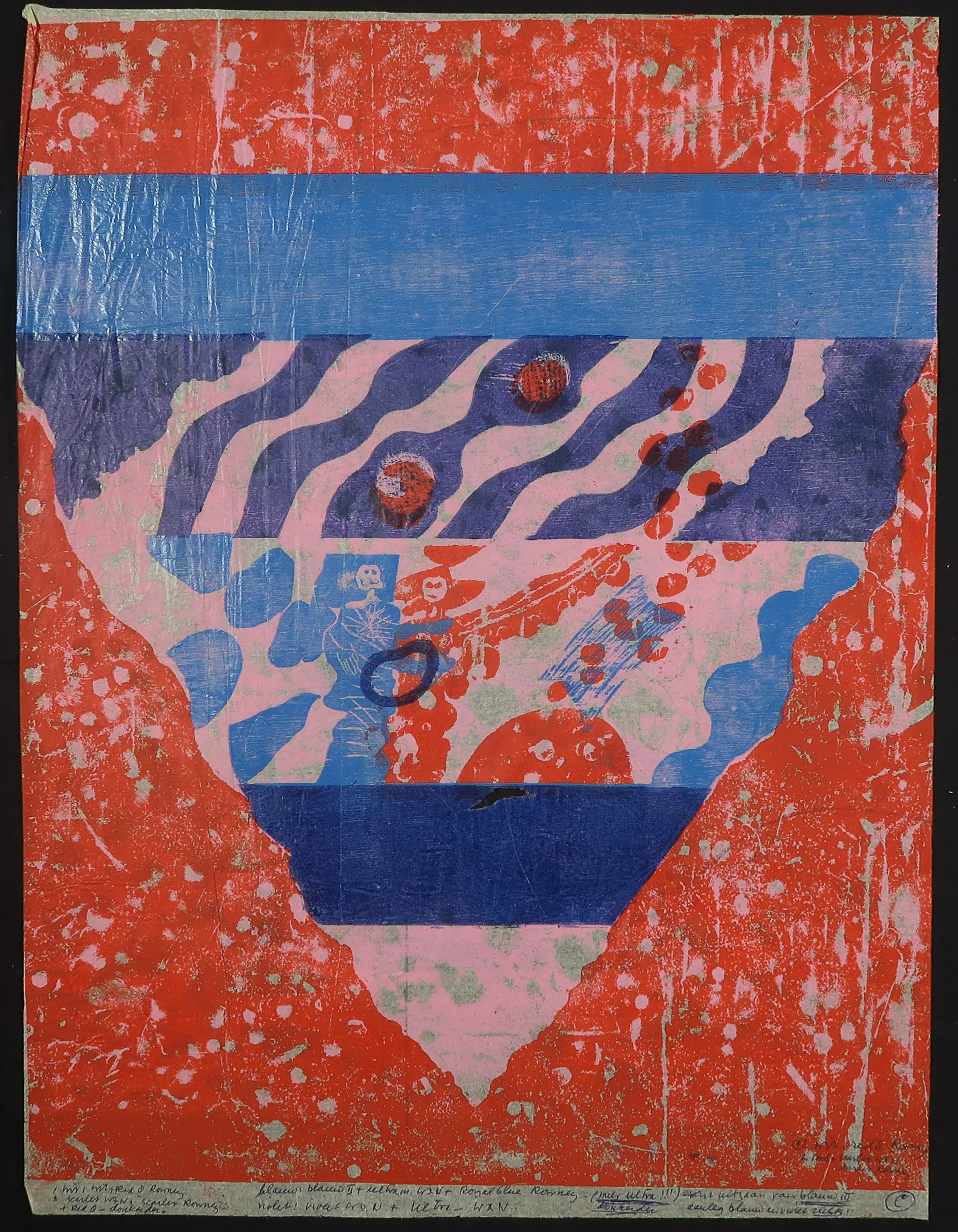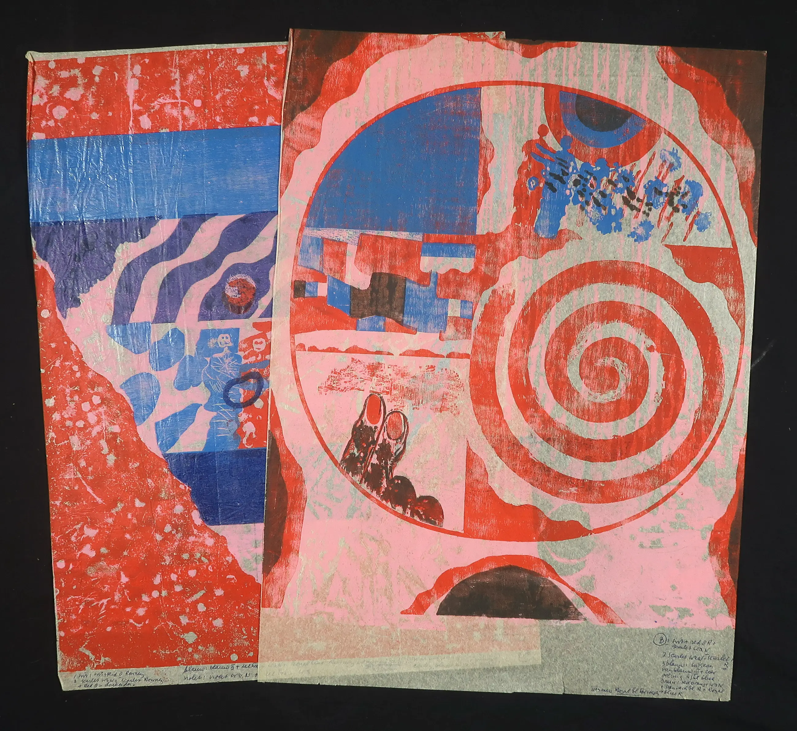 | Een van de twee werken heeft een gat in het beeld (zie foto). Het andere blad heeft een scheurtje aan de onderzijde. Beide werken hebben lichte vouwen. | |||