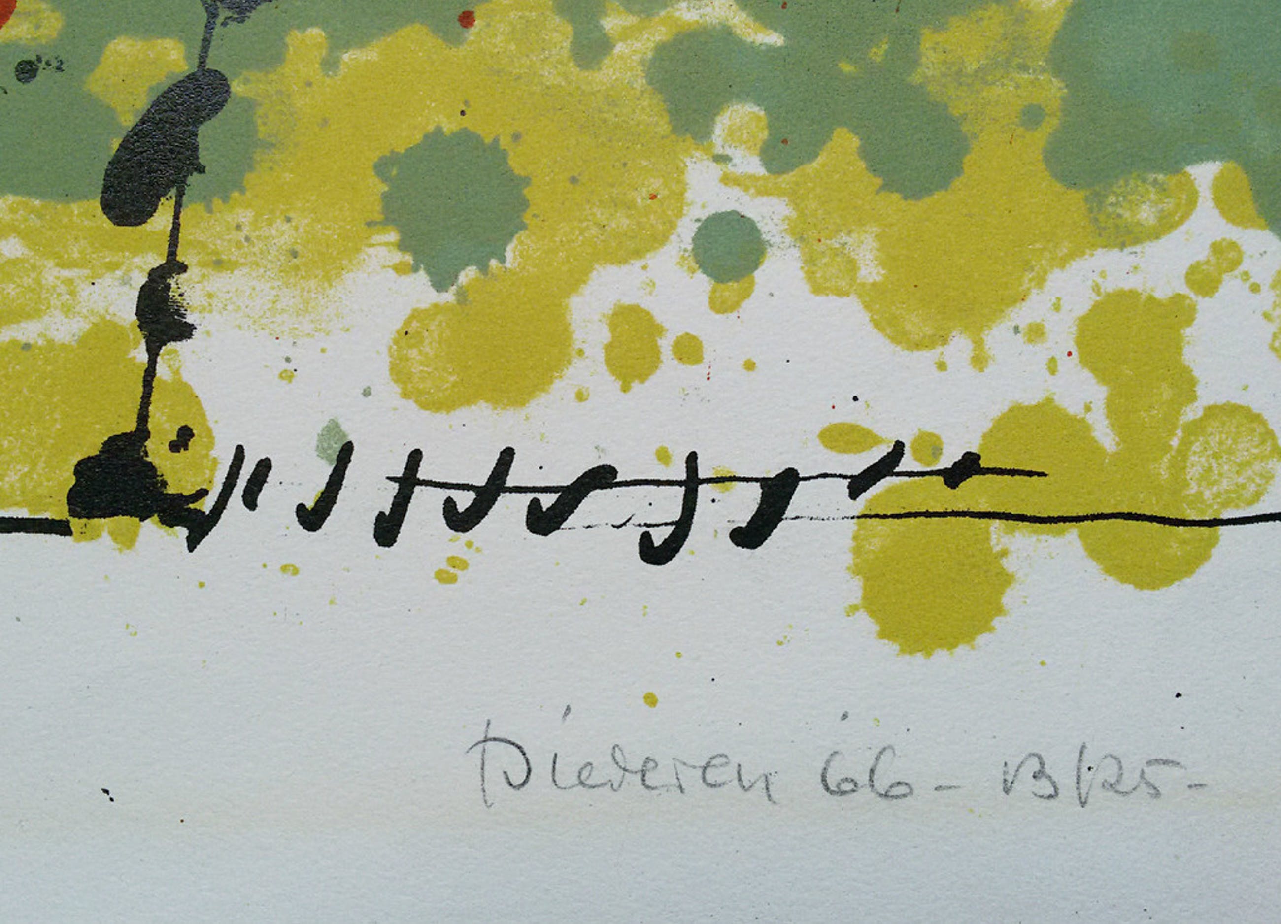 Mooi, karakteristiek werk van Jef Diederen uit 1966. Litho op papier, met potlood gesigneerd, gedateerd en genummerd (13/25). Afkomstig uit de kunstcollectie van ABNAMRO, in zeer goede conditie. Werk heeft ingelijst gezeten want er zitten taperesten boven aan de achterkant van het blad en er is een lichte verkleuring van een voormalig passe-partout onderaan het blad. Ingelijst met een nieuw passe-partout is het werk uitstekend.