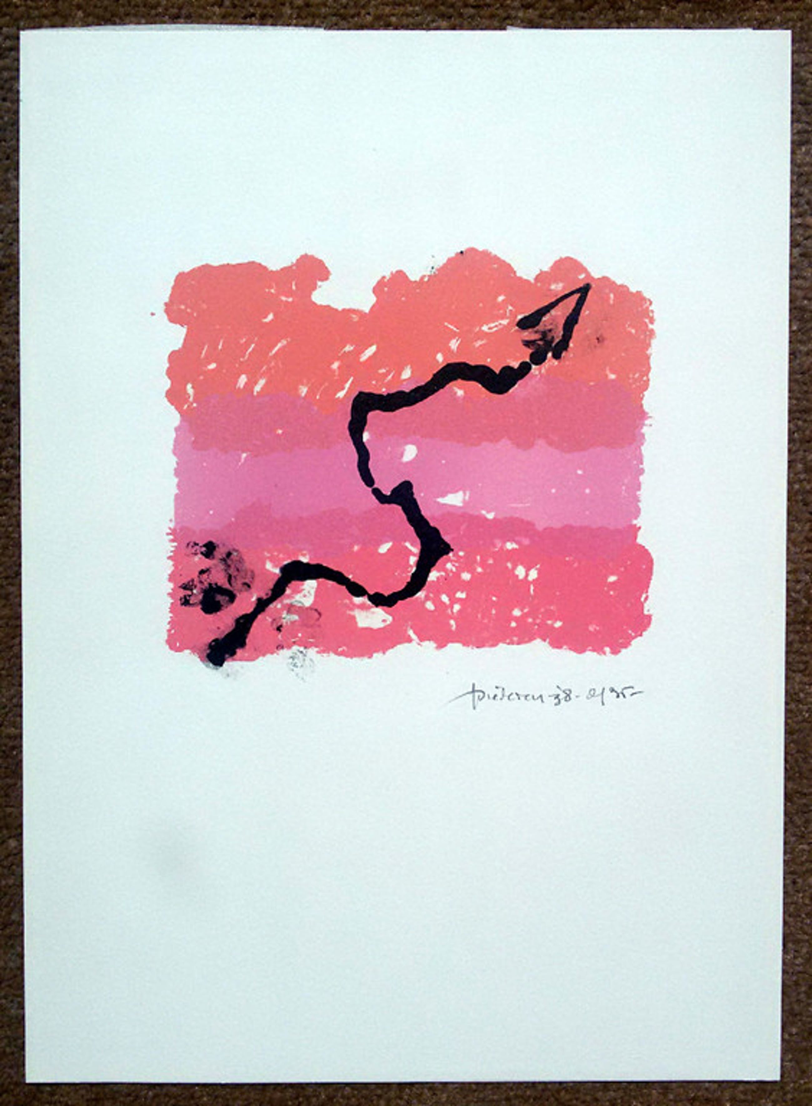 Leuke, kleine litho van Jef Diederen. Met potlood gesigneerd, gedateerd (’88? ’98?) en genummerd (2/35). Afkomstig uit de kunstcollectie van ABNAMRO. Ingelijst geweest want er zit tape bovenaan de achterkant van het blad, maar de beeldzijde is uitstekend.