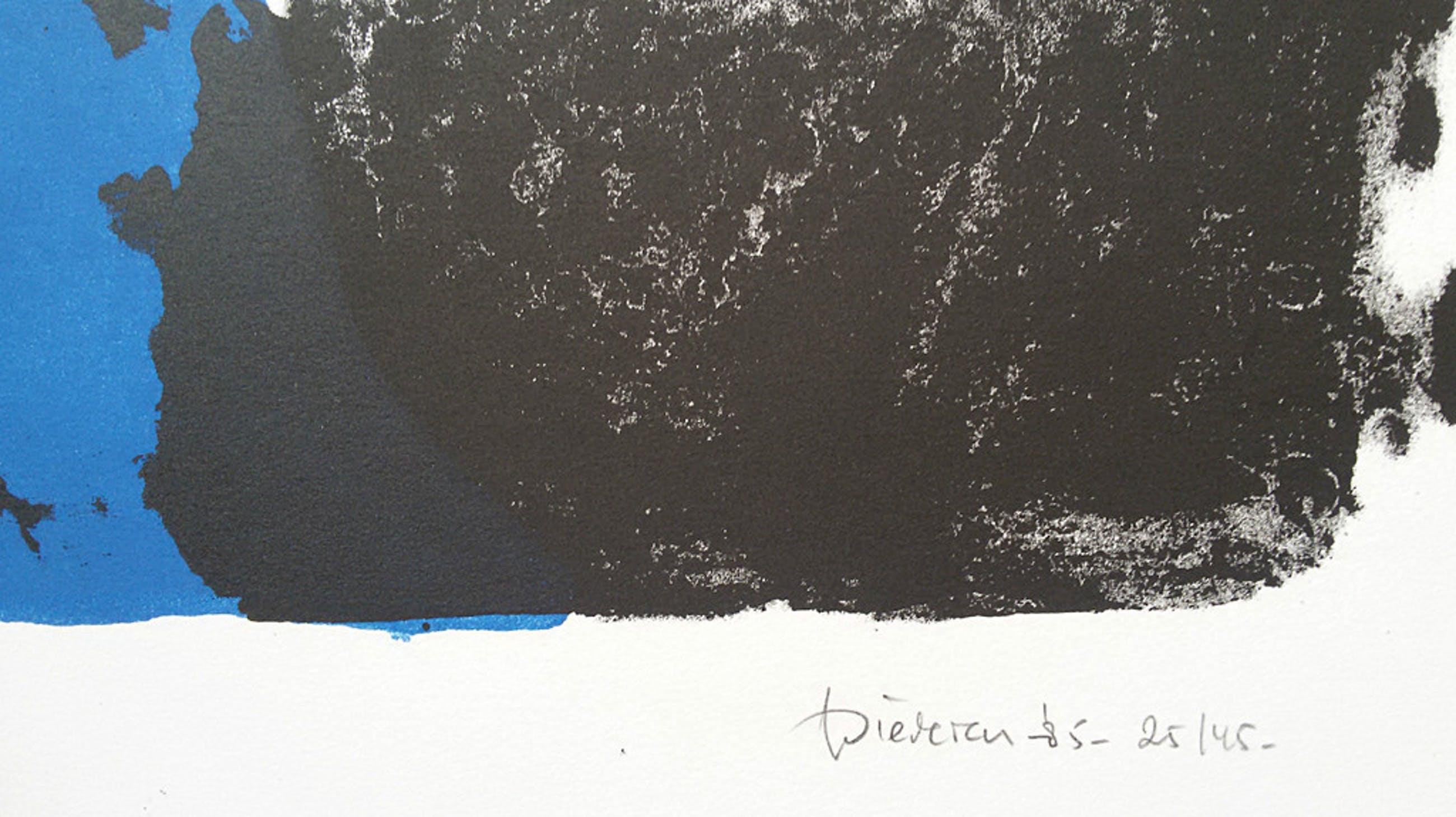 Grote litho van Jef Diederen op geschept papier (Rives). Met potlood gesigneerd, gedateerd (‘85) en genummerd (25/45). Afkomstig uit de kunstcollectie van ABNAMRO. Werk heeft ingelijst gezeten want de uiterste randen (echt nergens meer dan 3 mm) van de witte marge zijn verkleurd. Goed ingelijst met passe-partout niets meer van te zien, beeld is in zeer goede conditie.