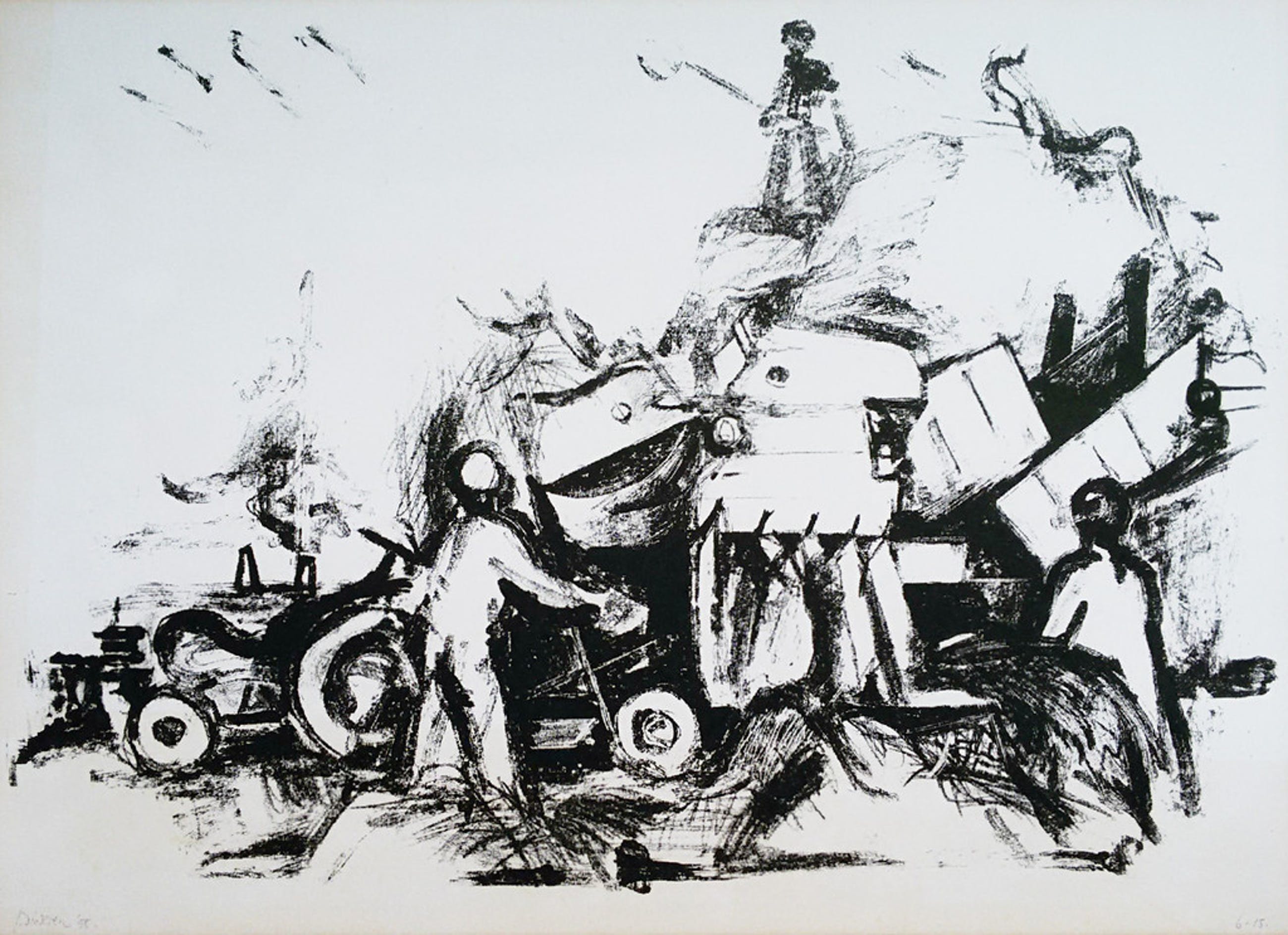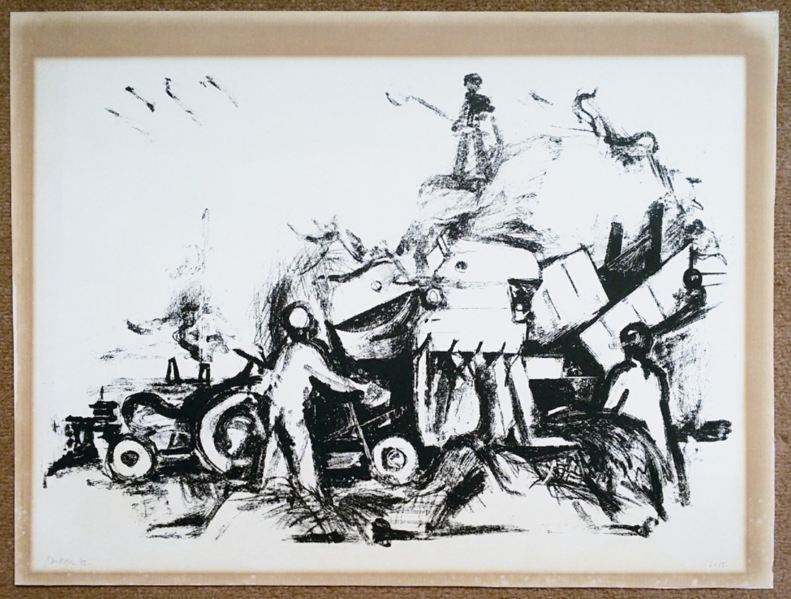 Zeldzame, vroege litho van Jef Diederen. Waarschijnlijk oogstende landarbeiders in Limburg. Met potlood gesigneerd, gedateerd (‘55) en genummerd (6-15). In redelijk goede conditie; blad heeft ingelijst gezeten want er zitten taperesten langs de randen aan de achterkant en er is een sterke vergeling onder een voormalig (zuurhoudend) passe-partout. Ingelijst met strak passe-partout is het werk goed te noemen, want dan is er slechts een lichte verkleuring aan de linkerkant van het beeld te zien, de rest van het beeld is zeer goed.