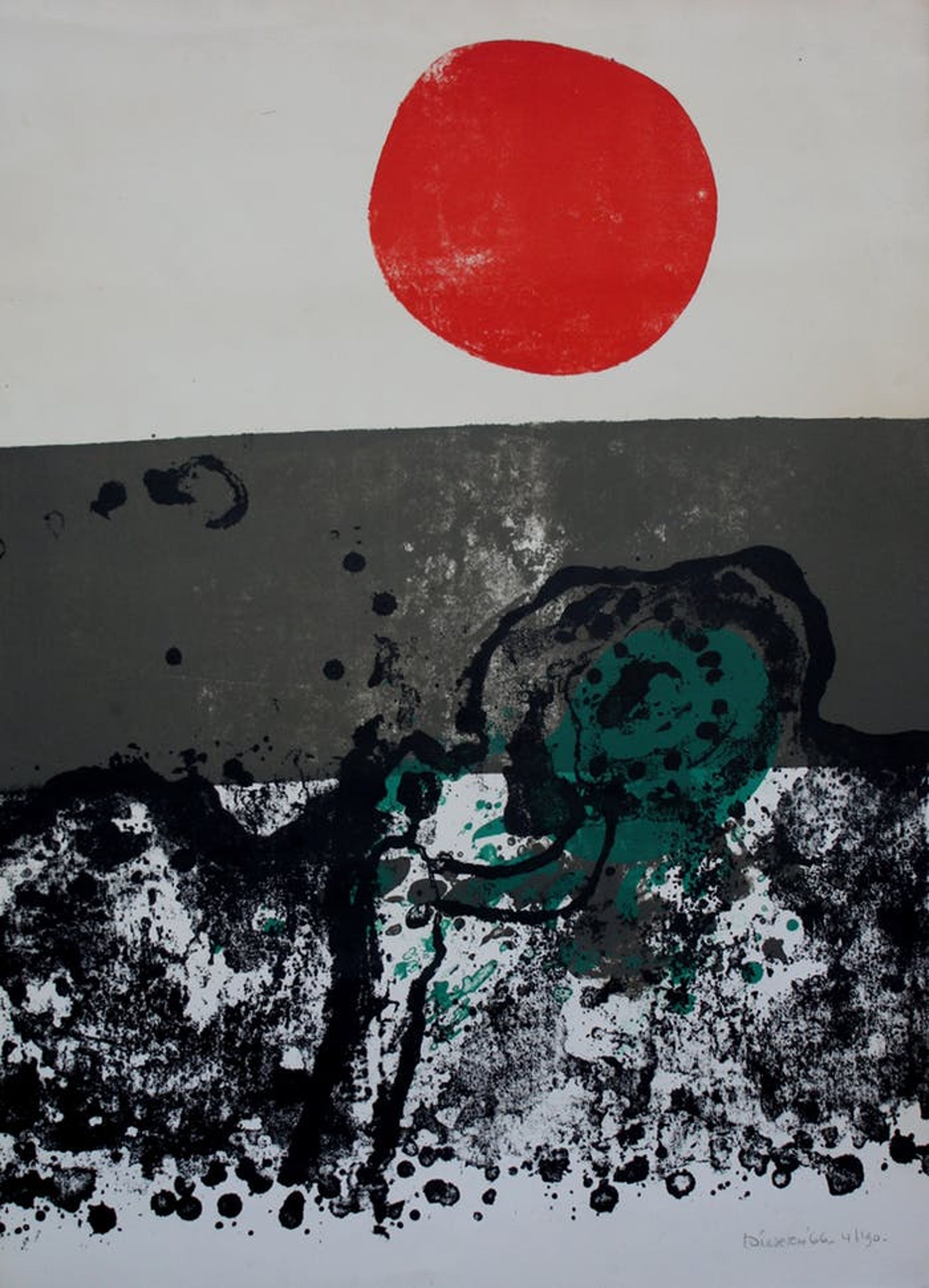 Litho van Jef Diederen. Jaar: 1966. Titel: Onder de vlag. Nummer: 4/190. Afmetingen: H77 x b57cm. Afmetingen voorstelling: H68 x b57cm. Het werk is rechtsonder gesigneerd met potlood door de kunstenaar. De authenticiteit van het aangeboden werk wordt volledig gegarandeerd. Een certificaat van echtheid kan, op aanvraag, worden gemaild.