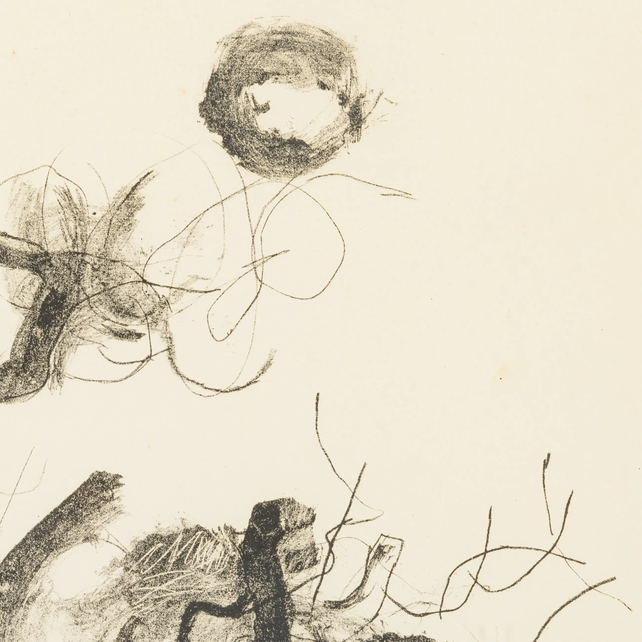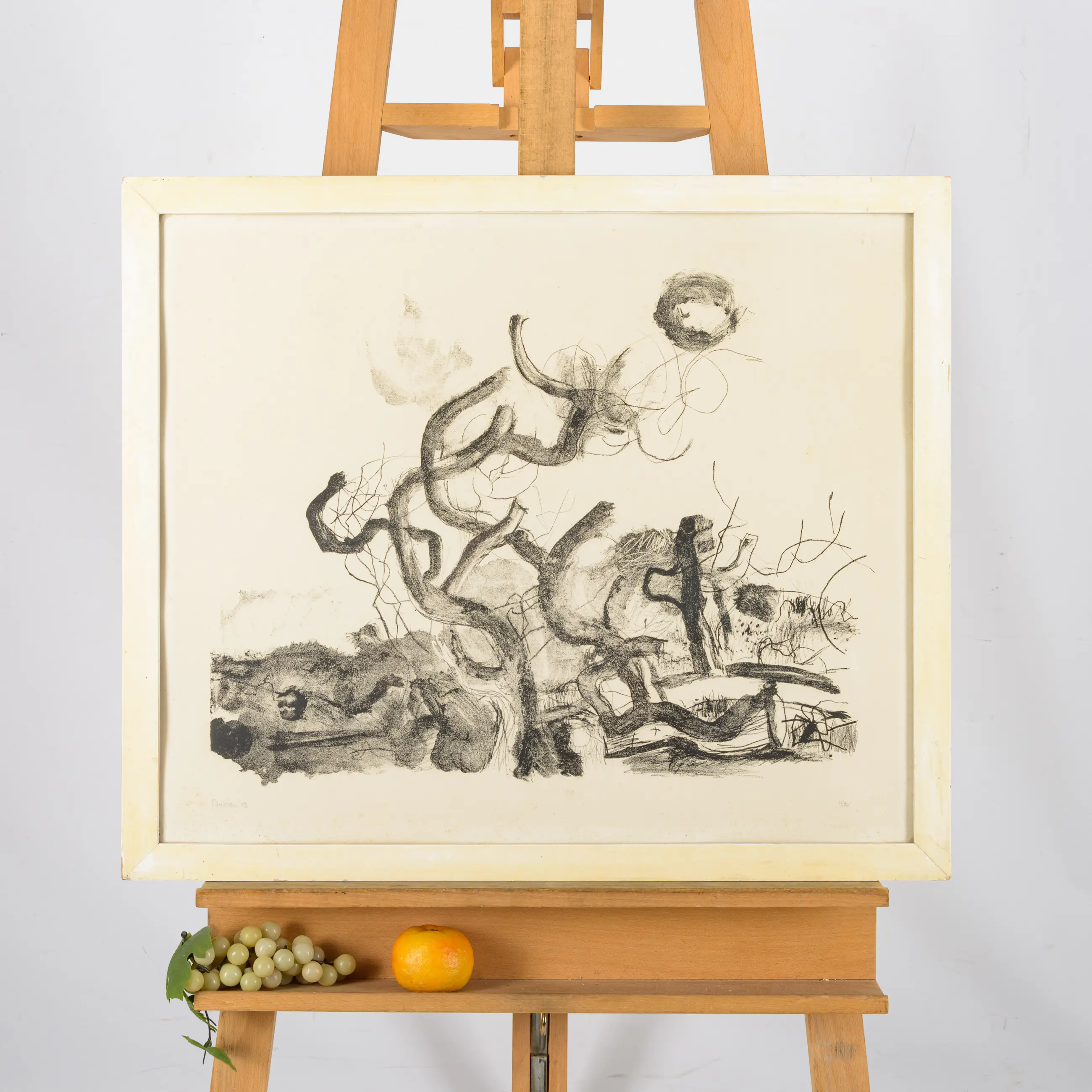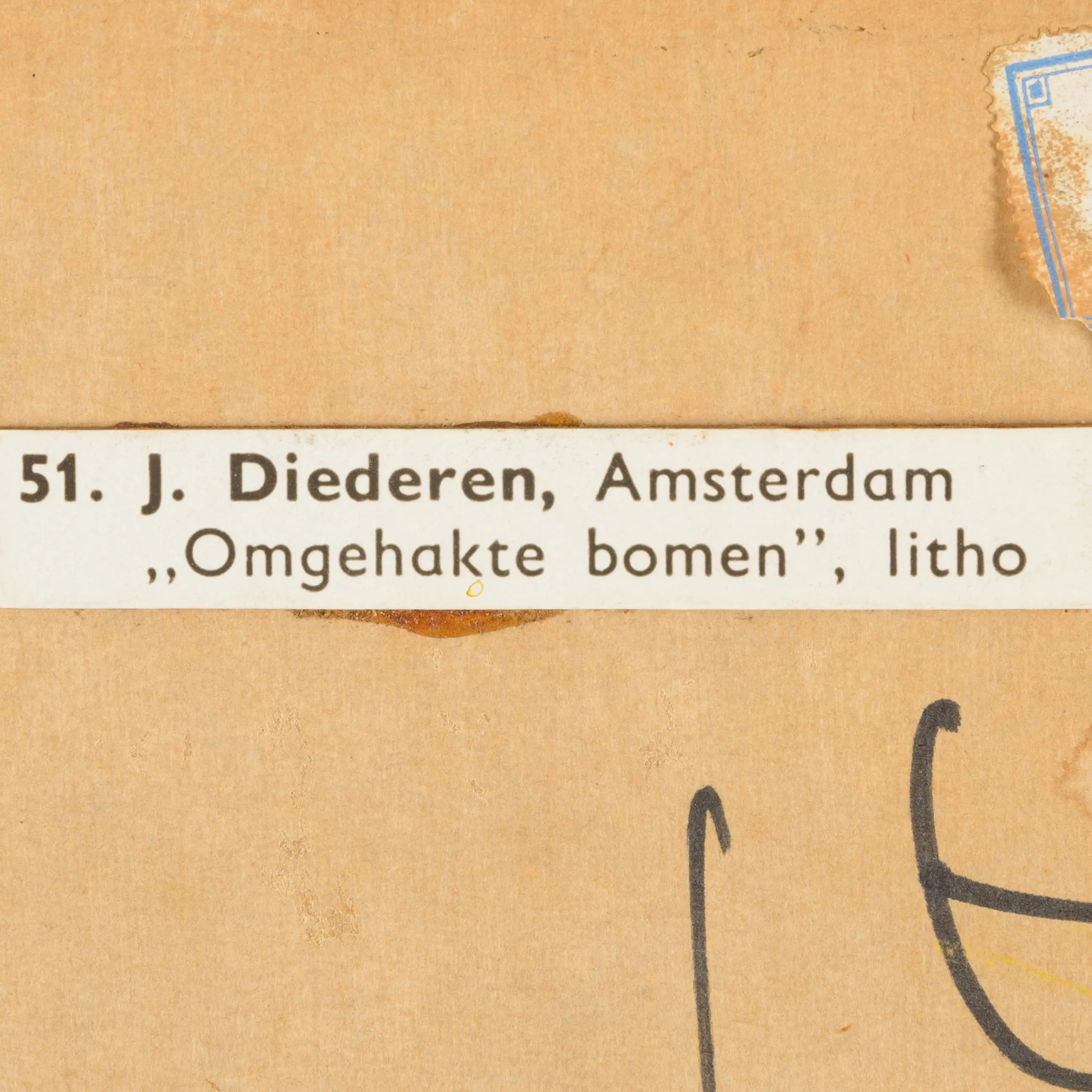 Deze litho is gemaakt door de Nederlandse kunstenaar Jeff Diederen (1920-2009). Jef Diederen (1920-2009), geboren in Heerlen, was een Nederlandse schilder en graficus, beïnvloed door het abstract expressionisme. Hij vestigde zich in Amsterdam en maakte deel uit van de Amsterdamse Limburgers, waarbij hij zijn Limburgse achtergrond verwerkte in een moderne, abstracte stijl. Zijn werken kenmerken zich door expressieve kleuren en vormen, vaak geïnspireerd door natuur en emoties. Naast schilderen maakte hij ook etsen en lithografieën en was hij actief binnen de modernistische stromingen van zijn tijd. Diederens kunst is te zien in musea zoals het Stedelijk Museum Amsterdam en het Bonnefantenmuseum Maastricht.