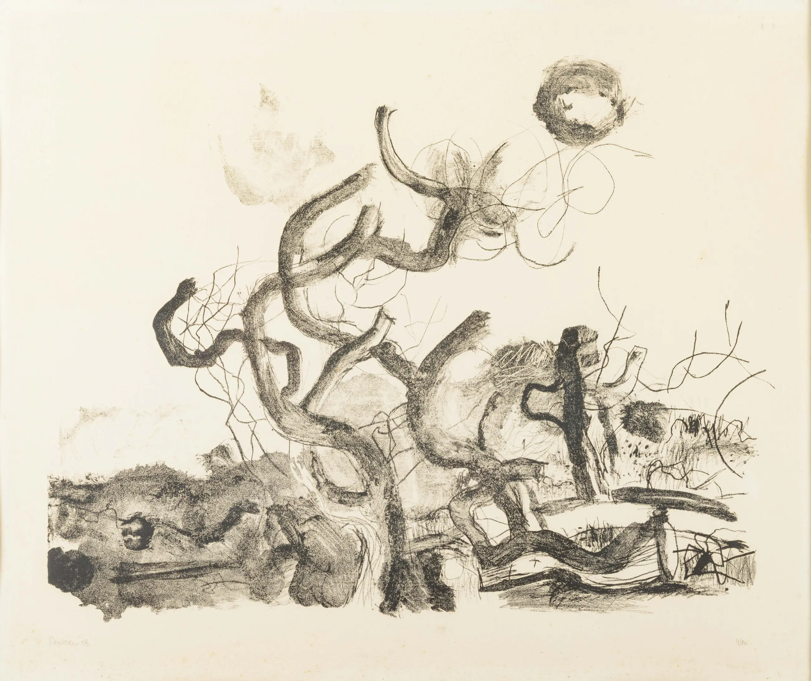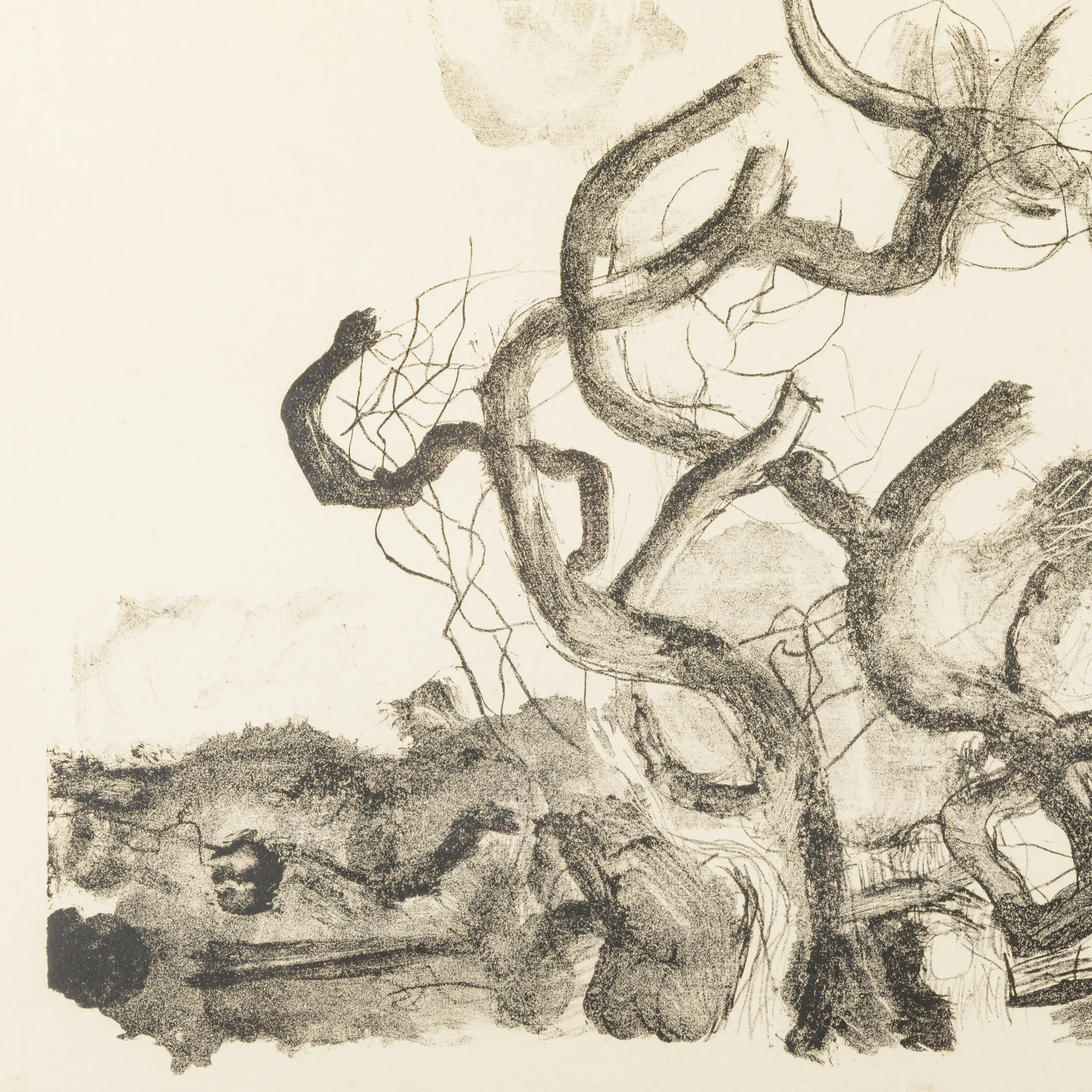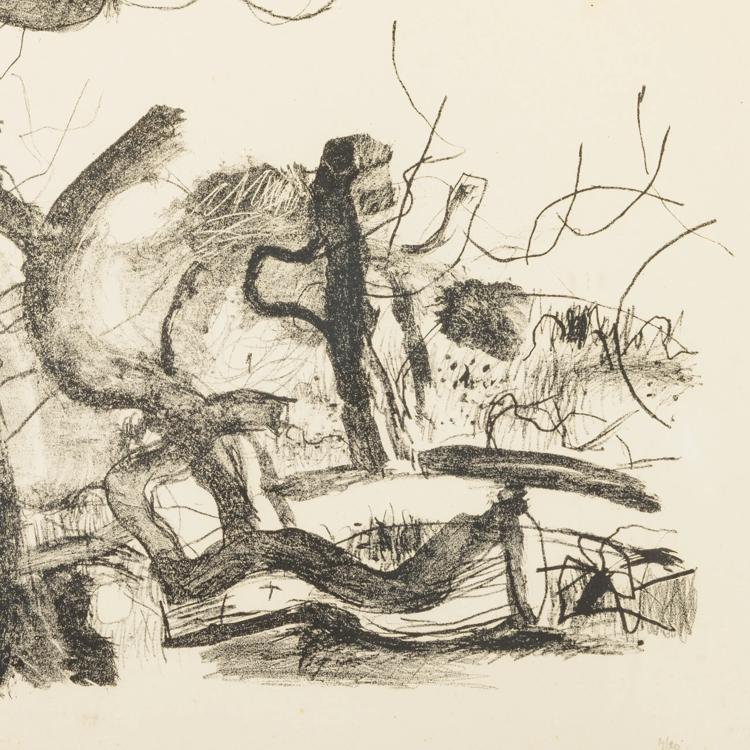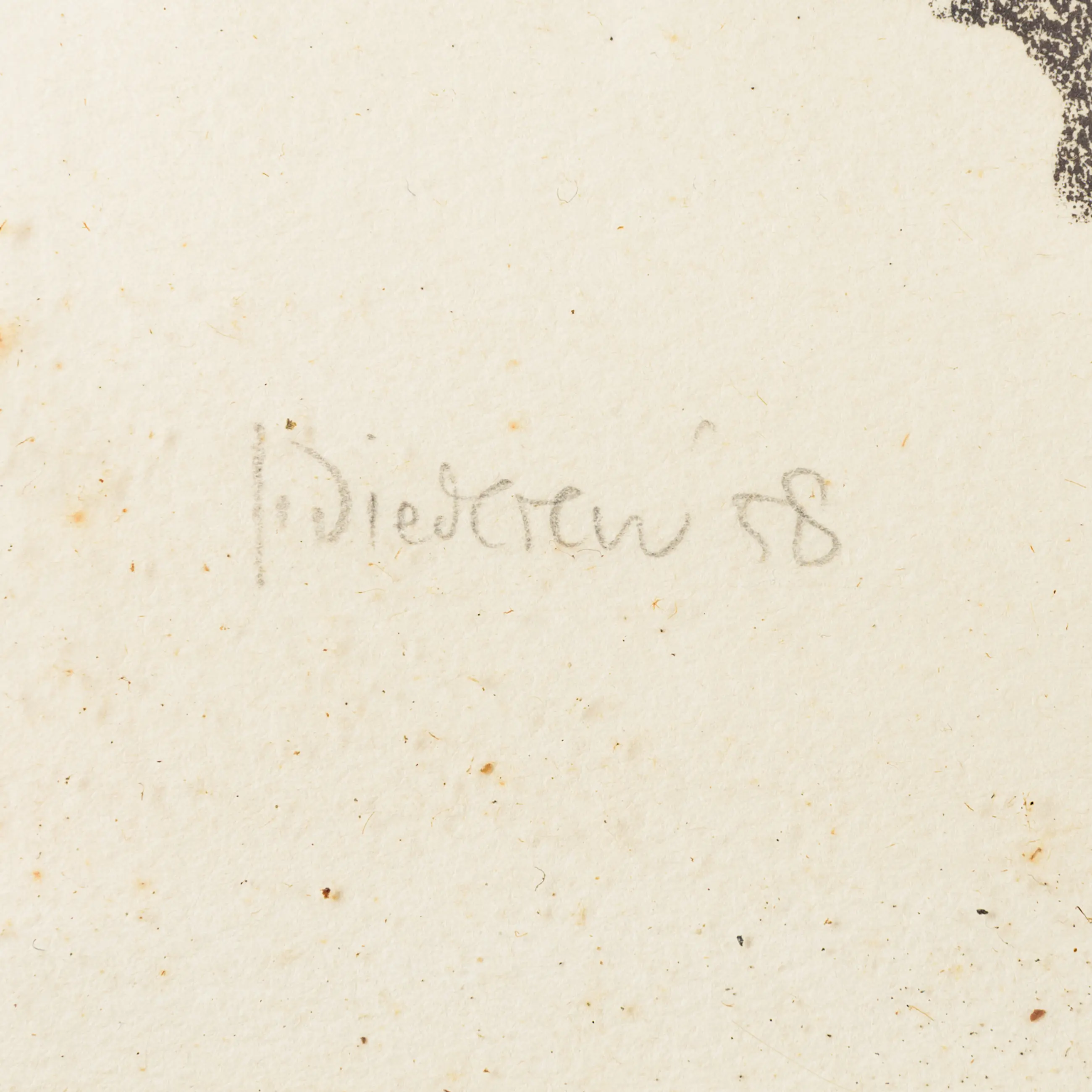 Deze litho is gemaakt door de Nederlandse kunstenaar Jeff Diederen (1920-2009). Jef Diederen (1920-2009), geboren in Heerlen, was een Nederlandse schilder en graficus, beïnvloed door het abstract expressionisme. Hij vestigde zich in Amsterdam en maakte deel uit van de Amsterdamse Limburgers, waarbij hij zijn Limburgse achtergrond verwerkte in een moderne, abstracte stijl. Zijn werken kenmerken zich door expressieve kleuren en vormen, vaak geïnspireerd door natuur en emoties. Naast schilderen maakte hij ook etsen en lithografieën en was hij actief binnen de modernistische stromingen van zijn tijd. Diederens kunst is te zien in musea zoals het Stedelijk Museum Amsterdam en het Bonnefantenmuseum Maastricht.