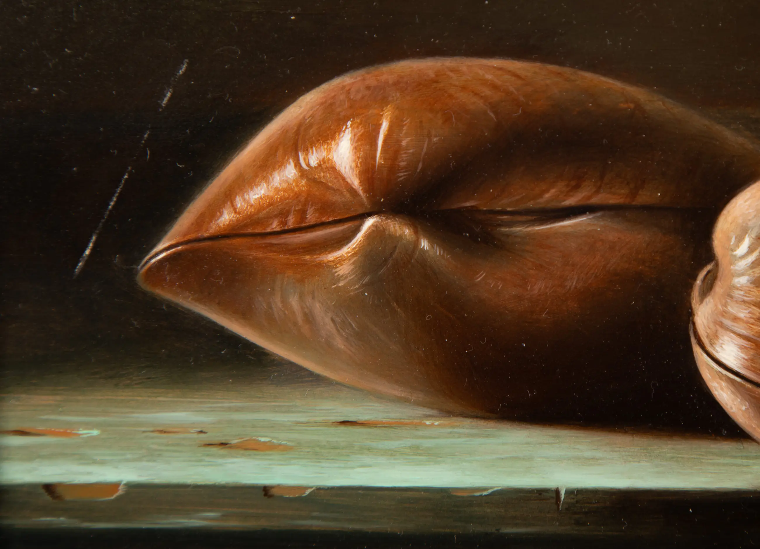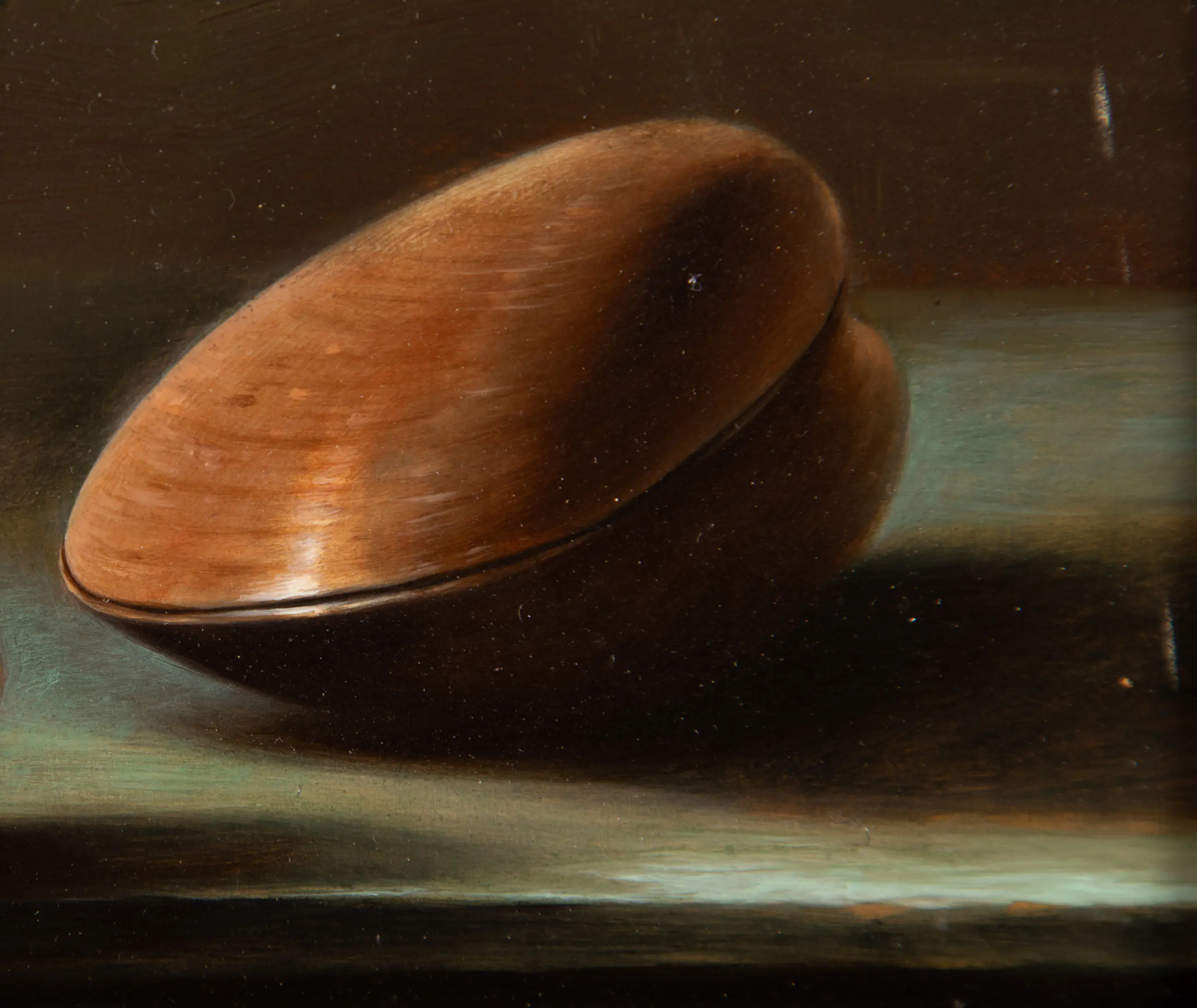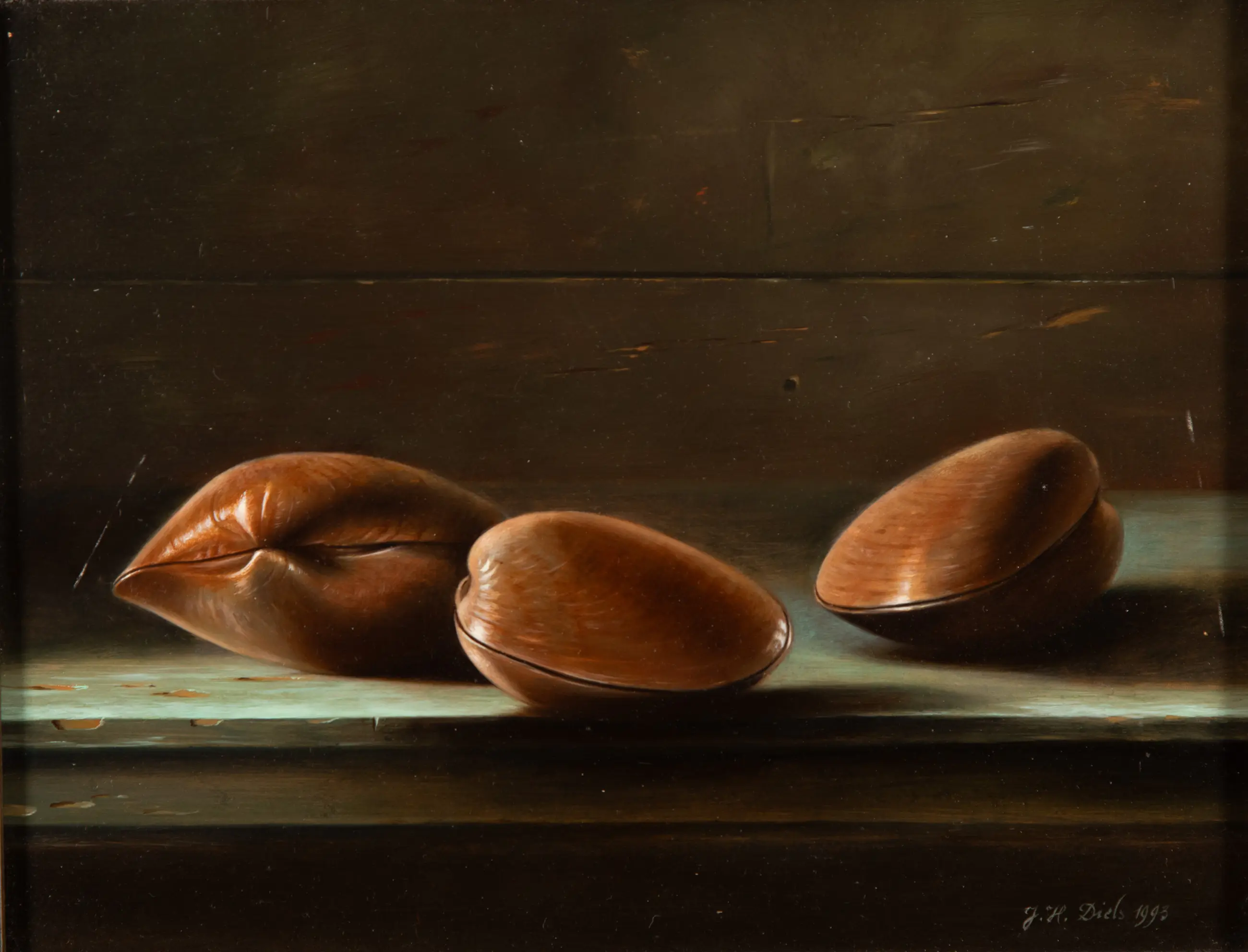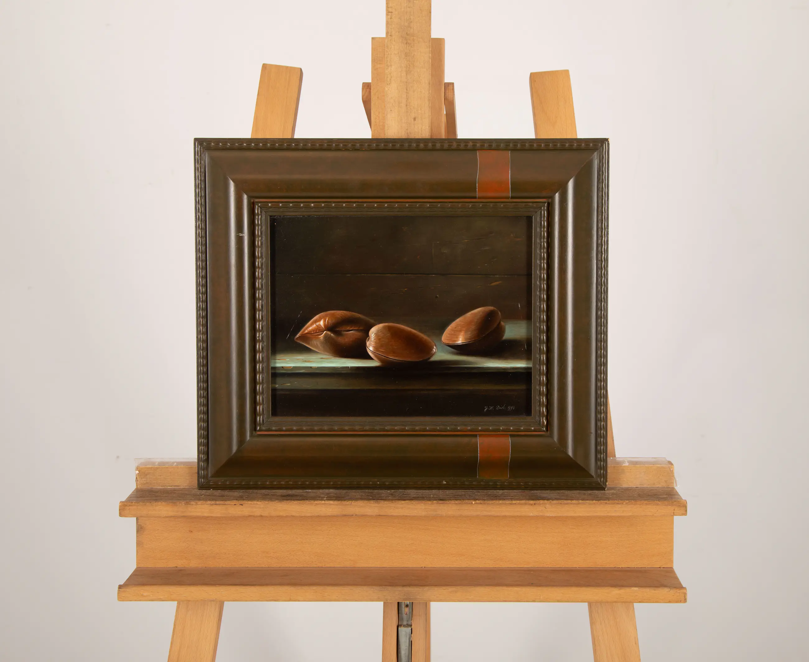 Dit prachtige, realistische stilleven toont drie gesloten kokkelschelpen tegen een houten achtergrond. Het werk wordt gepresenteerd in een bijzondere lijst, wat de verfijnde uitstraling verder benadrukt.