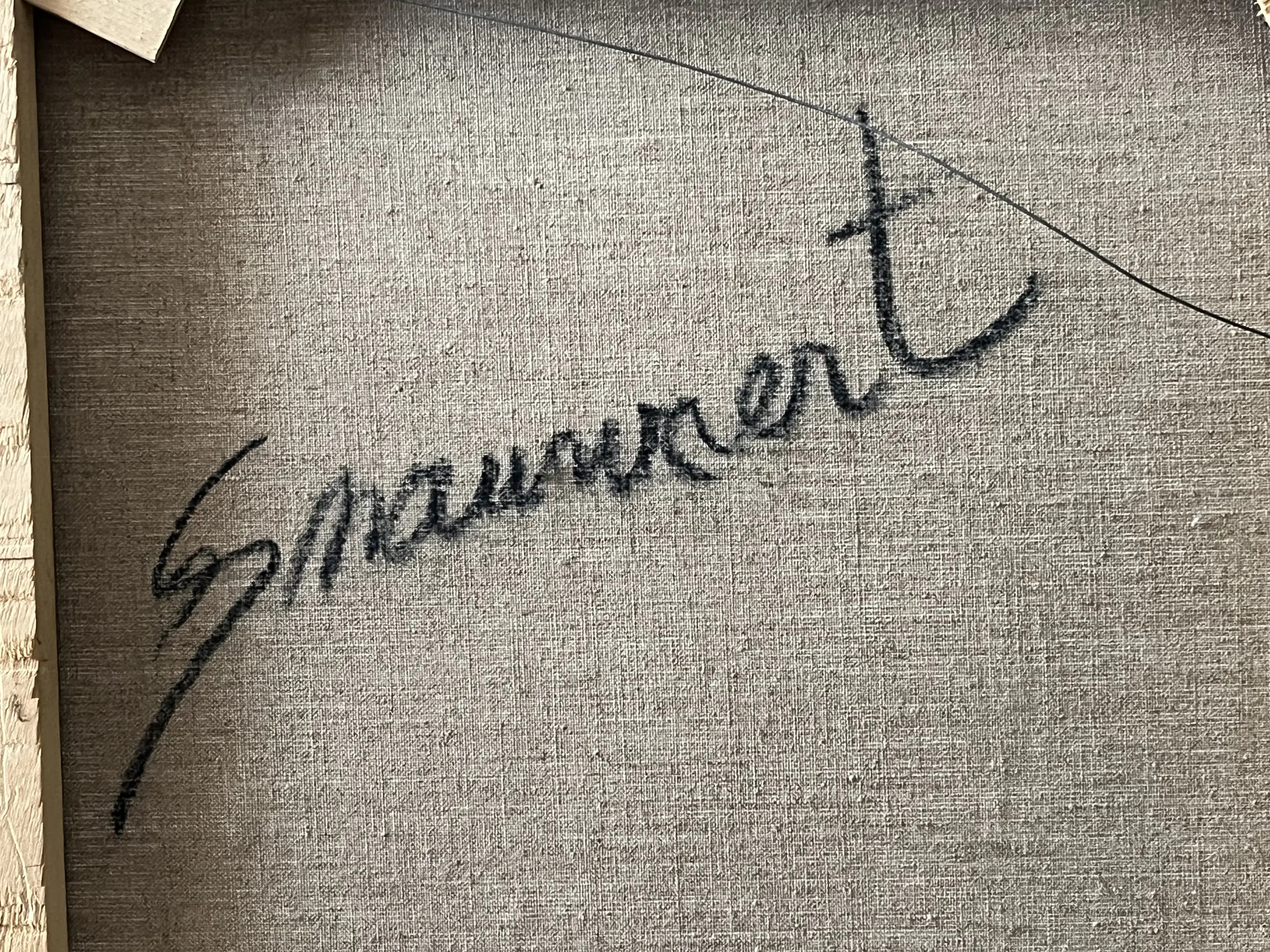 Karakteristiek werk met een dolend figuur in een vaag, leeg landschap. In de linkerbovenhoek zitten 5 scherpe craquelé lijnen. Afmeting 96 x 103 cm.