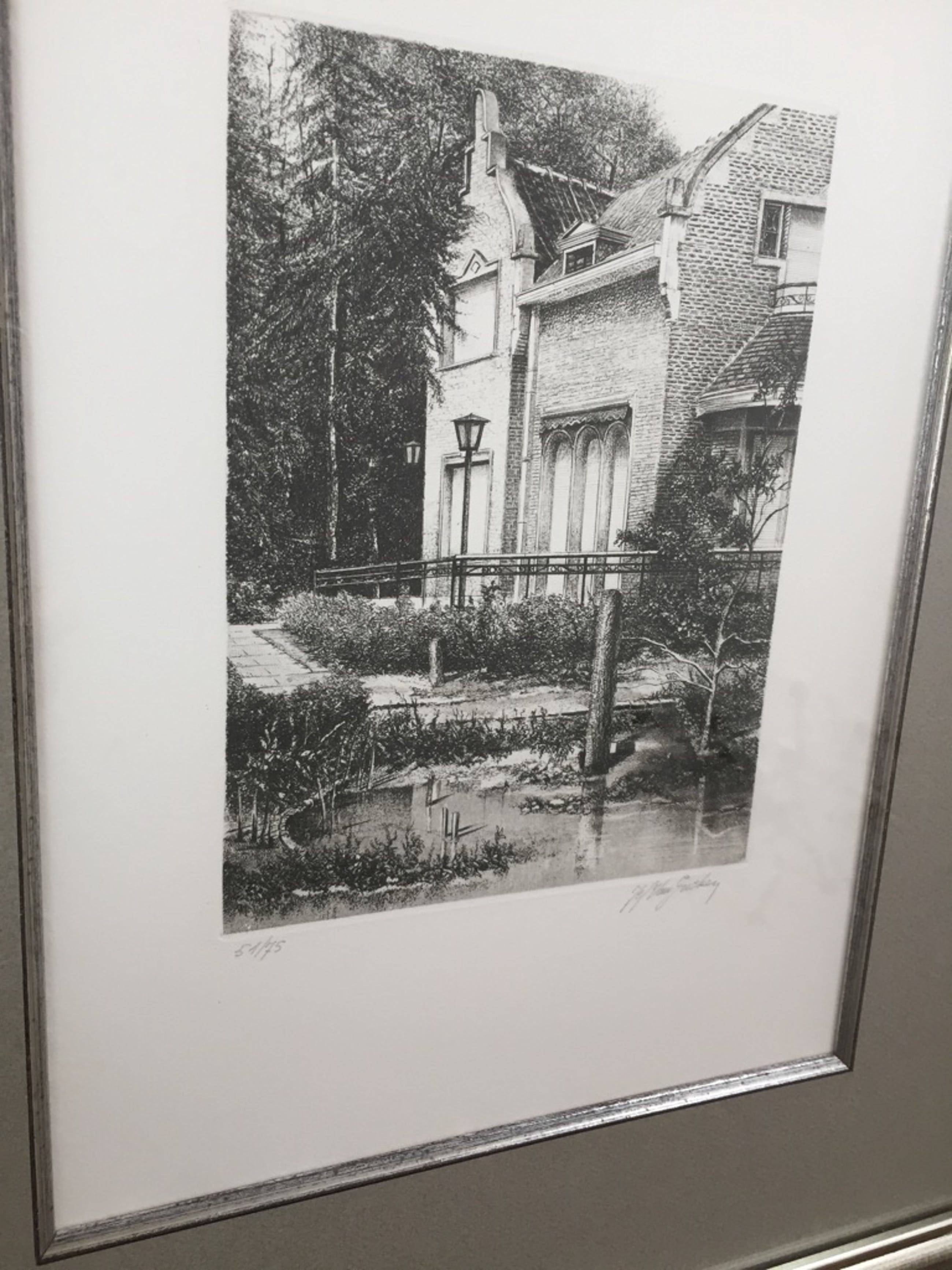 Met uiterste precisie en zin voor elk detail - kenmerkend voor de kunstenaar Jef Van Grieken - is deze ets uitgevoerd.De villa met verfijnde architectonische kenmerken zijn haarfijn weergegeven. De gedraaide zuilen, de balkon- en terrasafkanting, ... alles is zeer realistisch en gedetailleerd weergegeven.De waterpartij en de beplanting in en rond het water evenals de weerspiegeling in het water is minutieus tot uiting gebracht. Het werk is in uitstekende staat, evenals het kader.Professioneel ingekaderd: het kader is van goudachtig zilver qua kleur. De passe partout is in een perfect bijpassende tint en heeft eveneens een klein kader dat het eigenlijke werk en het papier mooi accentueert.