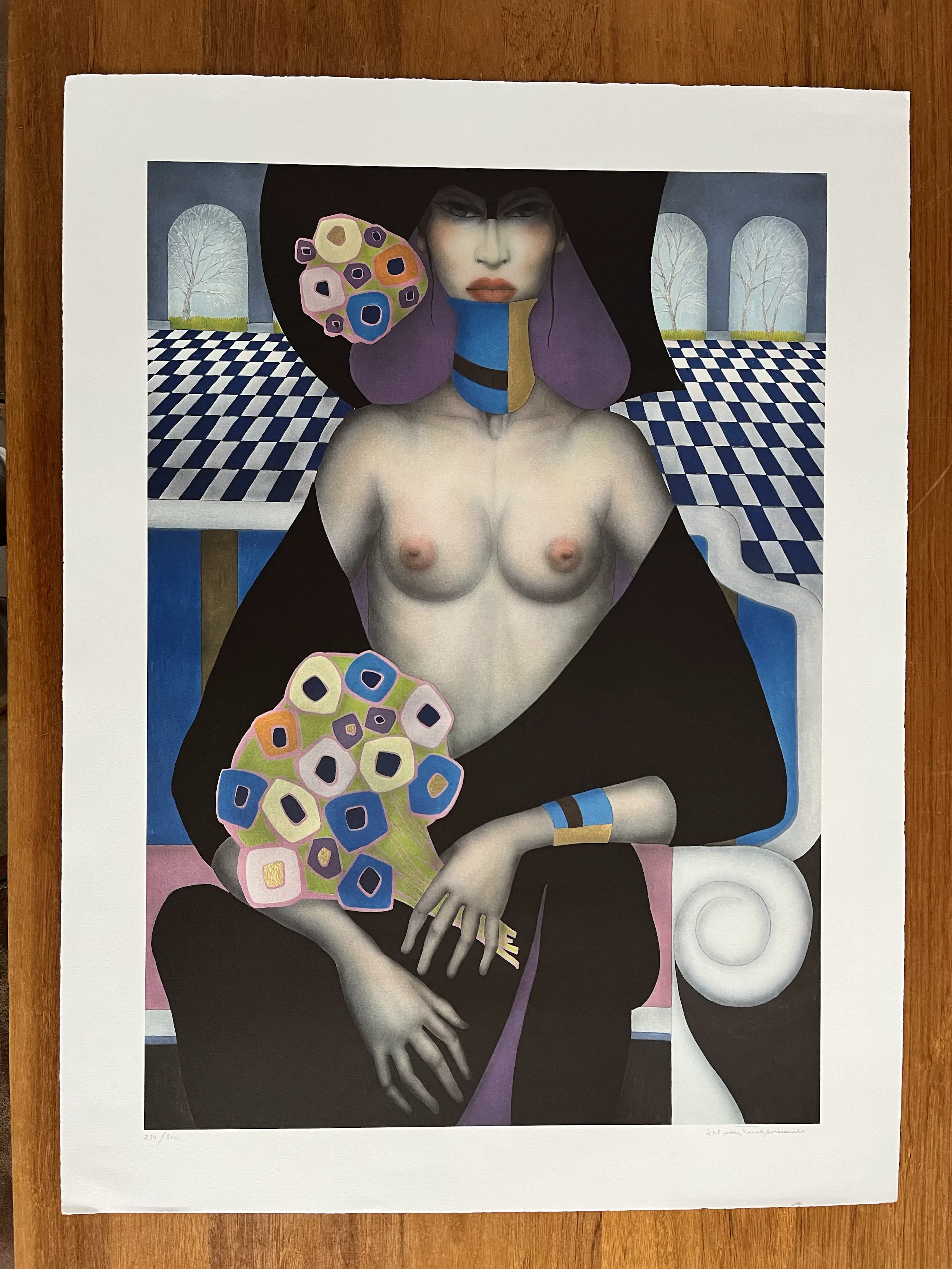 Jef Van Tuerenhout (1926-2006). Naakte vrouw. Kleurenlitho op mat papier. Gesigneerd en genummerd 234/300. Goudgekleurde vlakken reflecteren.