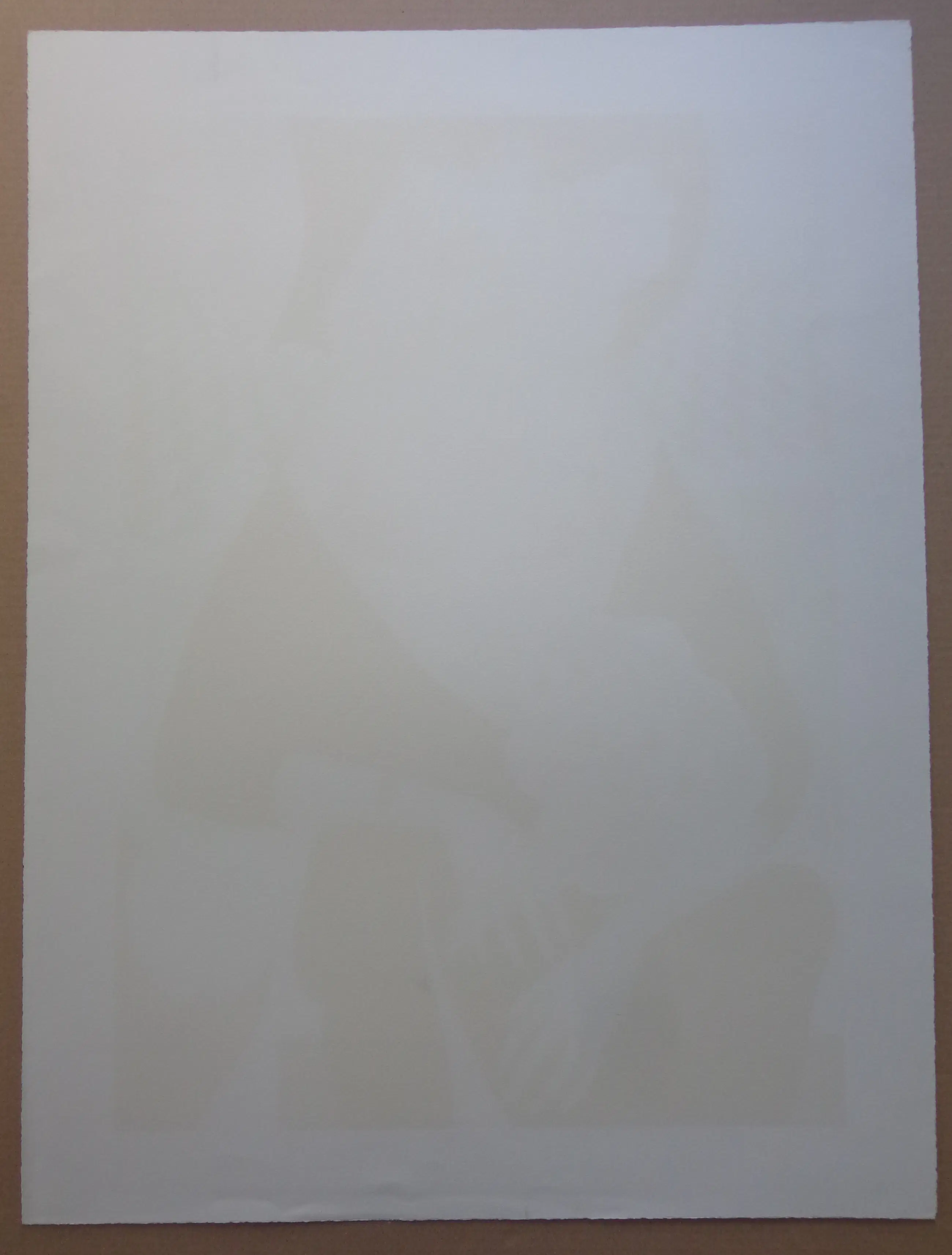 Jef Van Tuerenhout (1926-2006). Halfnaakte vrouw. Kleurzeefdruk op papier. Gesigneerd met potlood. Ex.nr. 1/350 (nummer 1!). Blad: 80x60cm. Proper blad. Boord rechts en onder lichte roestzweem, boord onder lichte deuken.