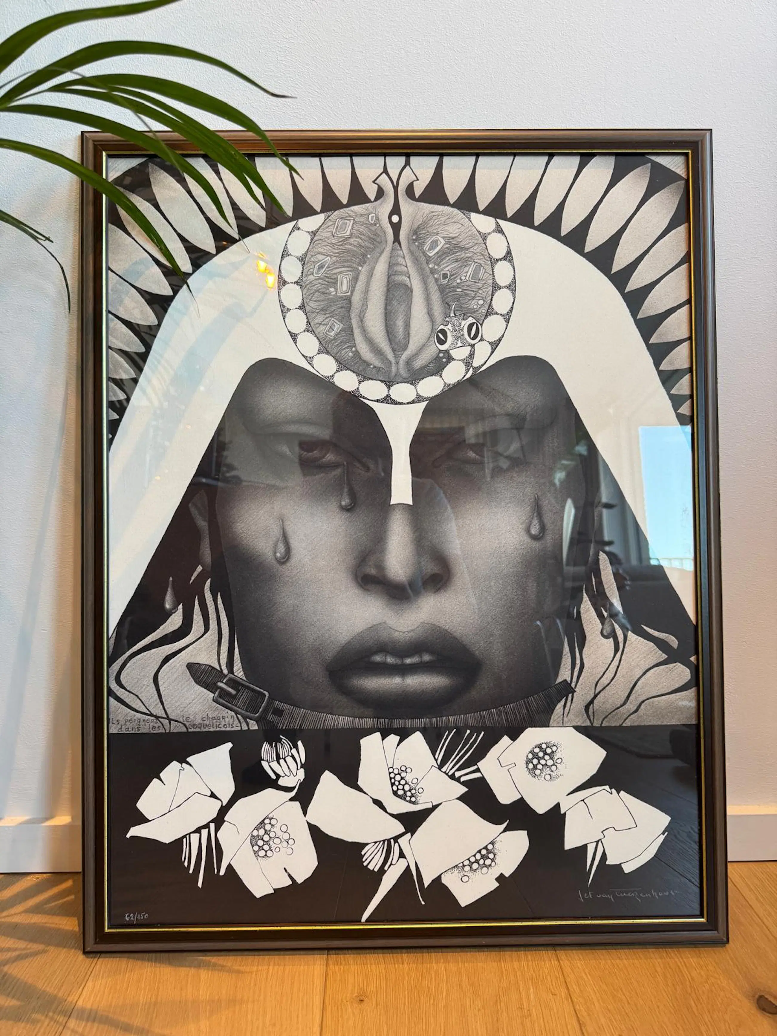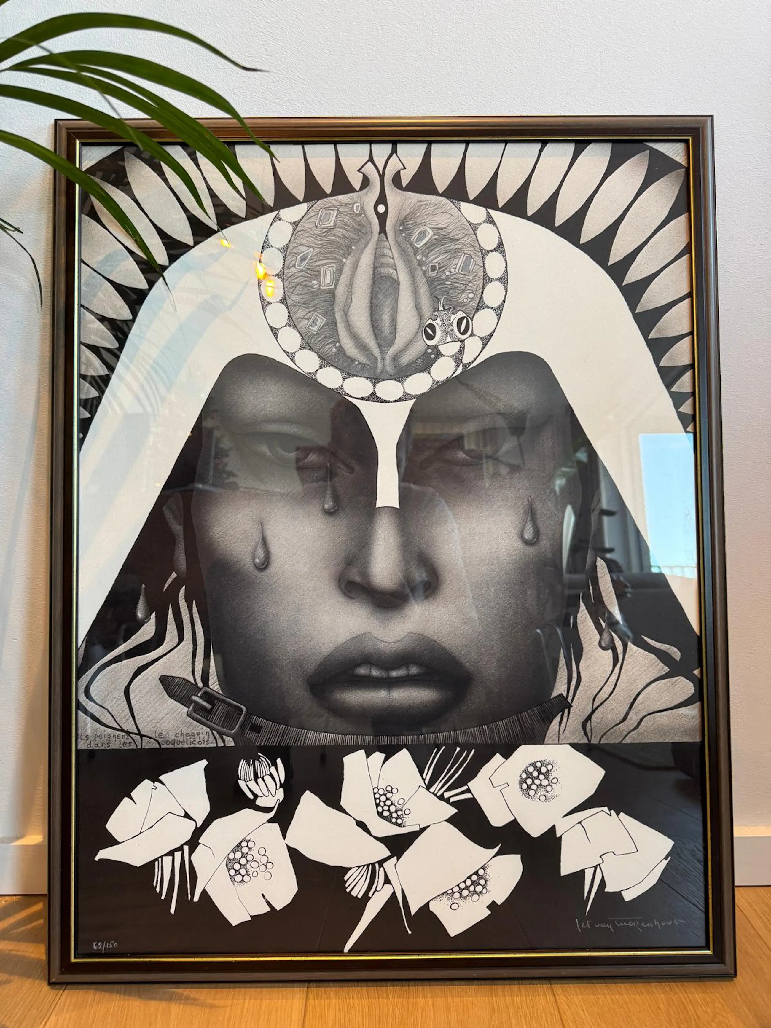 Jef Van Tuerenhout (1926–2006) Titel: : “Ils peignent le chagrin dans les coquelicots” Zwart-wit zeefdruk op papier, gesigneerd in wit potlood. Genummerd: 62/150. In perfecte staat en prachtig ingekaderd.